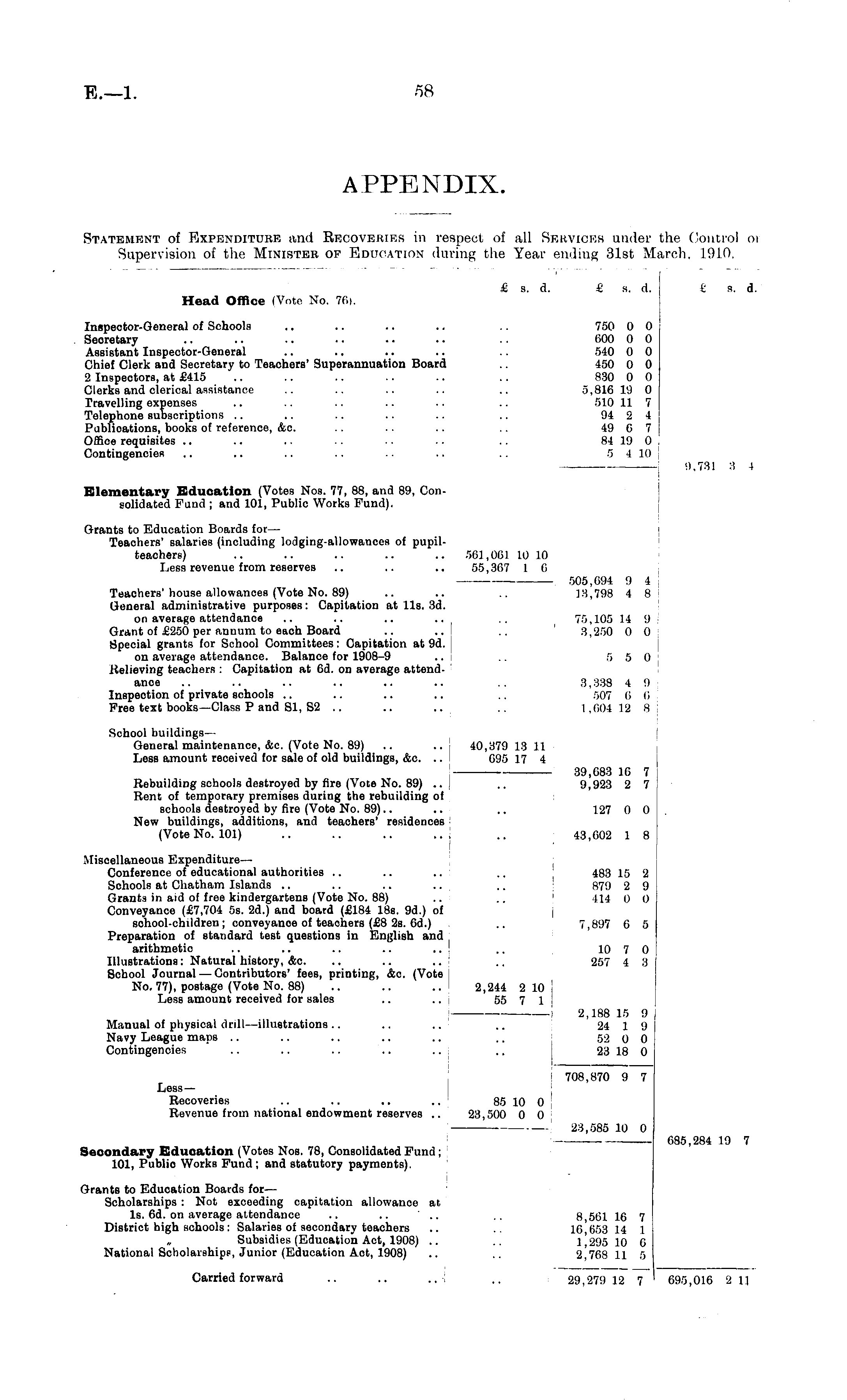 £ s. d. £ s. d. E s, d Head Office (Vote No. 76). Inspector-General of Schools .. .. .. .. .. 750 0 0 Seoretary .. .. .. .. .. .. .. 600 0 0 Assistant Inspector-General .. .. .. .. .. 540 0 0 Chief Clerk and Secretary to Teachers' Superannuation Board .. 450 0 0 2 Inspectors, at £415 .. .. .. .. .. .. 830 0 0 Clerks and clerical assistance .. .. .. .. .. 5,816 19 0 Travelling expenses .. .. .. .. .. .. 510 11 7 Telephone subscriptions .. .. .. .. .. .. 94 2 4 Publications, books of reference, &c. .. .. .. 49 6 7 Office requisites .. .. .. .. .. 84 19 0 Contingencies .. .. .. .. .. .. .. 5 4 10 9,731 3 4 Elementary Education (Votes Nos. 77, 88, and 89, Consolidated Fund ; and 101, Public Works Fund). Grants to Education Boards for— Teachers' salaries (including lodging-allowances of pupilteachers) .. .. .. .. .. 561,061 10 10 Less revenue from reserves .. .. .. 55,367 1 6 . 505,694 9 1 Teachers'house allowances (Vote No. 89) .. .. .. 13,798 4 8 General administrative purposes: Capitation at lis. 3d. on average attendance .. .. .. .. .. 75,105 14 9 Grant of £250 per annum to each Board .. .. .. 3,250 0 0 Special grants for School Committees: Capitation at 9d. on average attendance. Balance for 1908-9 .. .. 5 5 0 Relieving teachers : Capitation at 6d. on average attendance .. .. .. .. .. .. .. 3,338 4 9 Inspection of private schools .. .. .. .. .. 507 6 6 Free text books—Class P and SI, S2 .. .. .. .. 1,604 12 8 School buildings— General maintenance, &c. (Vote No. 89) .. .. 40,379 13 11 Less amount received for sale of old buildings, &c. .. 695 17 4 39,683 16 7 Rebuilding schools destroyed by fire (Vote No. 89) .. .. 9,923 2 7 Rent of temporary premises during the rebuilding of schools destroyed by fire (Vote No. 89).. .. .. 127 0 0 New buildings, additions, and teachers' residences (Vote No. 101) .. .. .. .. ... 43,602 1 8 .Miscellaneous Expenditure— Conference of educational authorities .. .. .. .. 483 15 2 Schools at Chatham Islands .. .. .. .. .. 879 2 9 Grants in aid of free kindergartens (Vote No. 88) .. .. 1110 0 Conveyance (£7,704 5s. 2d.) and board (£184 18s. 9d.) of school-children; conveyance of teachers (£8 2s. 6d.) .. 7,897 6 5 Preparation of standard test questions in English and arithmetic .. .. .. .. .. ., 10 7 0 Illustrations: Natural history, &c. .. .. .. .. 257 4 3 School Journal — Contributors' fees, printing, &c. (Vote No. 77), postage (Vote No. 88) .. .. .. 2,244 2 10 Less amount received for sales .. .. 55 7 1 1 2,188 15 9 Manual of physical drill —illustrations.. .. .. .. 24 1 9 Navy League maps .. .. .. .. .. .. 52 0 0 Contingencies .. .. .. .. .. .. 23 18 0 708,870 9 7 Less— Recoveries .. .. .. .. 85 10 0 Revenue from national endowment reserves .. 23,500 0 0 23,585 10 0 685,284 19 7 Secondary Education (Votes Nos. 78, Consolidated Fund ; 101, Publio Works Fund ; and statutory payments). Grants to Education Boards for— Scholarships : Not exceeding capitation allowance at Is. Od. on average attendance .. .. ' .. .. g 5(31 xg 7 District high schools: Salaries of secondary teachers .. 16 653 14 1 Subsidies (Education Act, 1908) .. .. 1,295 10 6 National Scholarships, Junior (Education Act, 1908) .. .. 2 768 11 5 Carried forward .. .. .. ■ ,. 29 279 12 7 695,016 2 1]