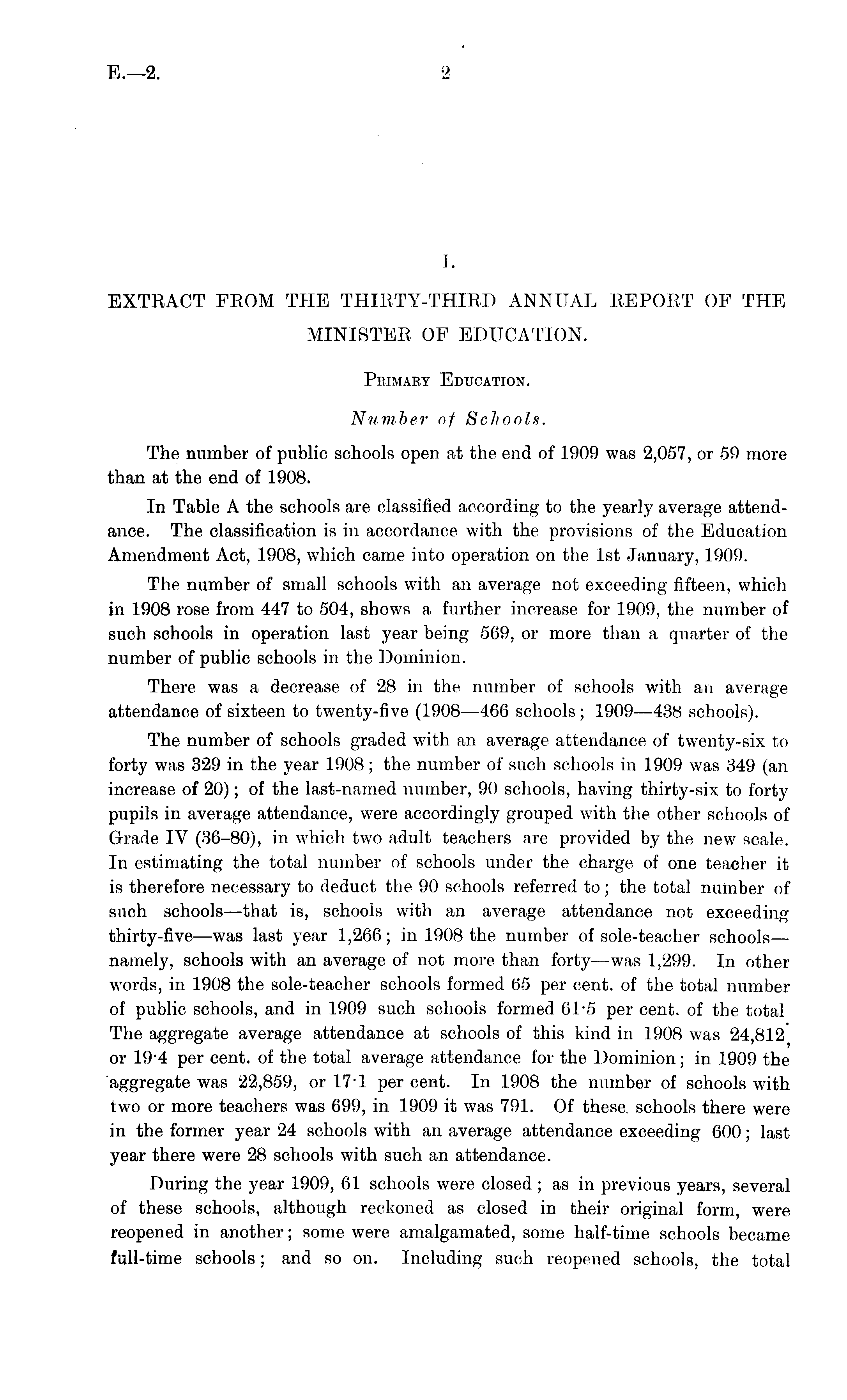 I. EXTEACT FEOM THE THIRTY-THIRD ANNUAL REPORT OF THE MINISTER OF EDUCATION. Primary Education. Number of Schools. The number of public schools open at the end of 1909 was 2,057, or 59 more than at the end of 1908. In Table A the schools are classified according to the yearly average attendance. The classification is in accordance with the provisions of the Education Amendment Act, 1908, which came into operation on the Ist January, 1909. The number of small schools with an average not exceeding fifteen, which in 1908 rose from 447 to 504, shows a further increase for 1909, the number of such schools in operation last year being 569, or more than a quarter of the number of public schools in the Dominion. There was a decrease of 28 in the number of schools with an average attendance of sixteen to twenty-five (1908 —466 schools ; 1909 —438 schools). The number of schools graded with an average attendance of twenty-six to forty was 329 in the year 1908; the number of such schools in 1909 was 349 (an increase of 20); of the last-named number, 90 schools, having thirty-six to forty pupils in average attendance, were accordingly grouped with the other schools of Grade IV (36-80), in which two adult teachers are provided by the new scale. In estimating the total number of schools under the charge of one teacher it is therefore necessary to deduct the 90 schools referred to; the total number of such schools —that is, schools with an average attendance not exceeding thirty-five —was last year 1,266; in 1908 the number of sole-teacher schools— namely, schools with an average of not more than forty—was 1,299. In other words, in 1908 the sole-teacher schools formed 65 per cent, of the total number of public schools, and in 1909 such schools formed 61-5 per cent, of the total The aggregate average attendance at schools of this kind in 1908 was 24,812 or 19-4 per cent, of the total average attendance for the Dominion; in 1909 the aggregate was 22,859, or 17 - 1 per cent. In 1908 the number of schools with two or more teachers was 699, in 1909 it was 791. Of these, schools there were in the former year 24 schools with an average attendance exceeding 600; last year there were 28 schools with such an attendance. During the year 1909, 61 schools were closed ; as in previous years, several of these schools, although reckoned as closed in their original form, were reopened in another; some were amalgamated, some half-time schools became full-time schools; and so on. Including such reopened schools, the total