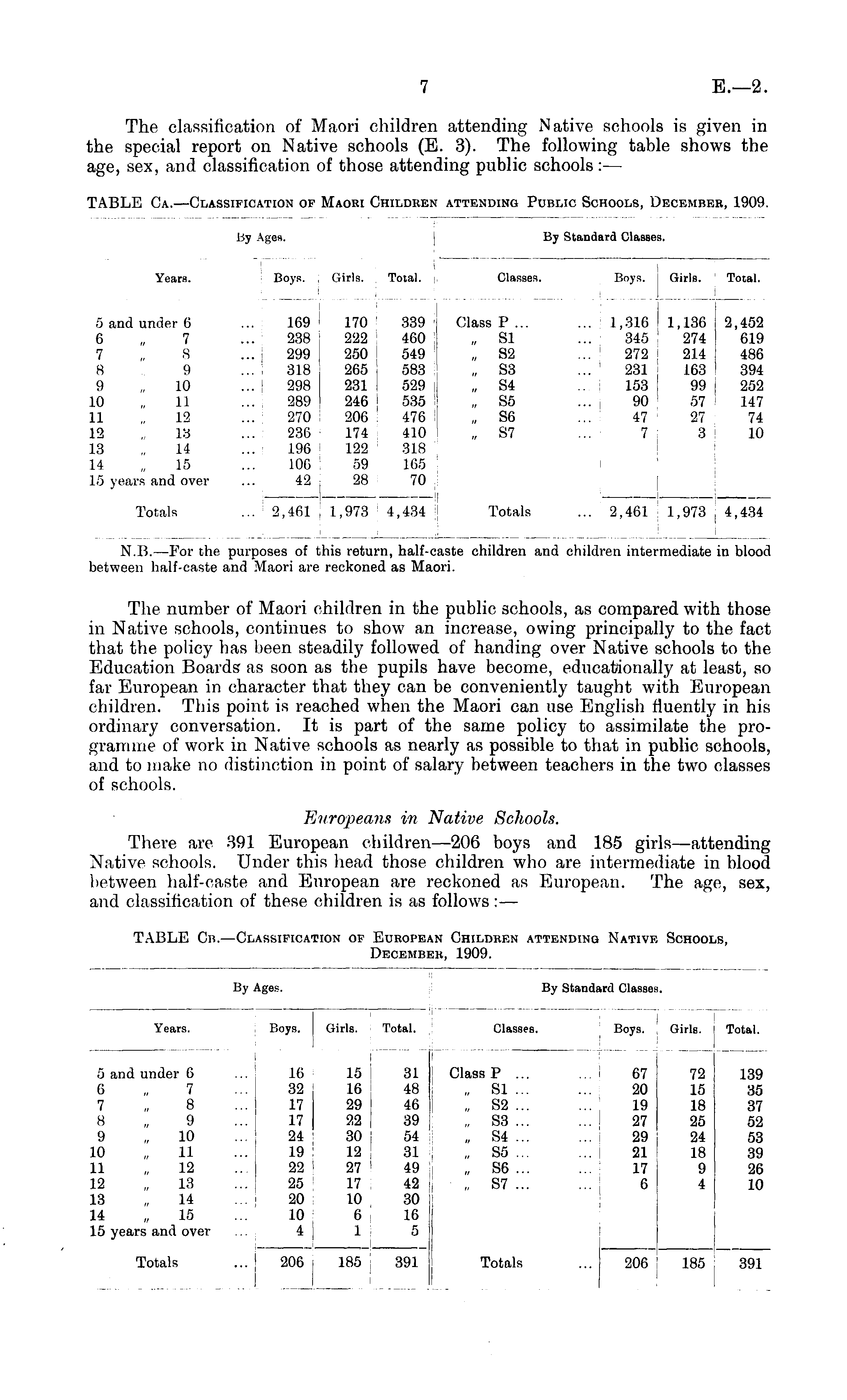 N.B.—For the purposes of this return, half-caste children and children intermediate in blood between half-caste and Maori are reckoned as Maori. The number of Maori children in the public schools, as compared with those in Native schools, continues to show an increase, owing principally to the fact that the policy has been steadily followed of handing over Native schools to the Education Boards' as soon as the pupils have become, educationally at least, so far European in character that they can be conveniently taught with European children. This point is reached when the Maori can use English fluently in his ordinary conversation. It is part of the same policy to assimilate the programme of work in Native schools as nearly as possible to that in public schools, and to make no distinction in point of salary between teachers in the two classes of schools. Europeans in Native Schools. There are 391 European children—2o6 boys and 185 girls—attending Native schools. Under this head those children who are intermediate in blood between half-caste and European are reckoned as European. The age, sex, and classification of these children is as follows:—