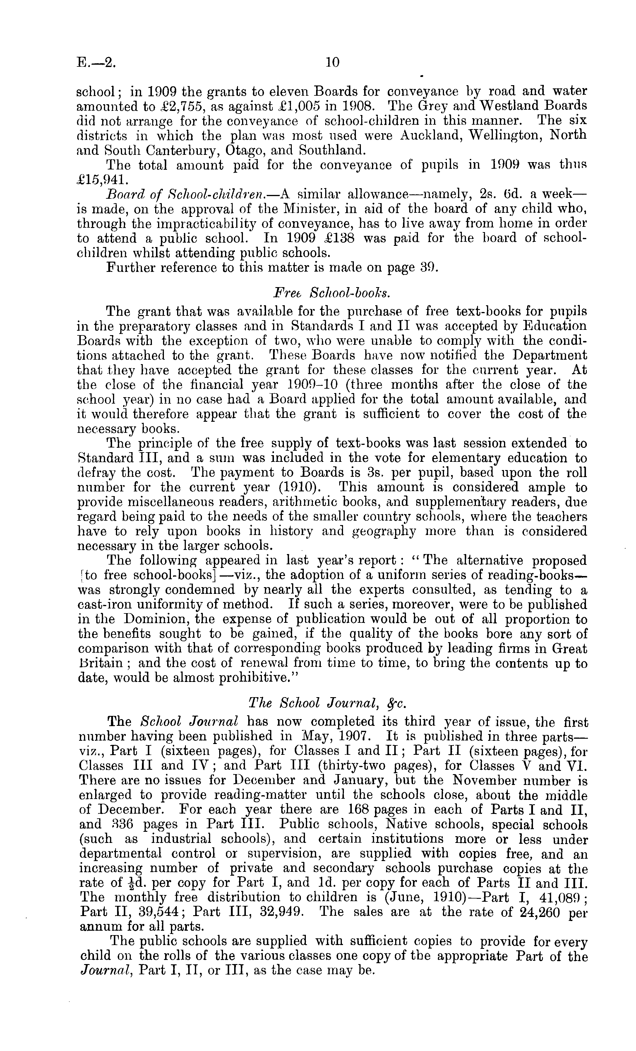 school; in 1909 the grants to eleven Boards for conveyance by road and water amounted to =£2,755, as against £1,005 in 1908. The Grey and Westland Boards did not arrange for the conveyance of school-children in this manner. The six districts in which the plan was most used were Auckland, Wellington, North and South Canterbury, Otago, and Southland. The total amount paid for the conveyance of pupils in 1909 was thus £15,941. Board of School-children. —A similar allowance —namely, 2s. (sd. a week — is made, on the approval of the Minister, in aid of the board of any child who, through the impracticability of conveyance, has to live away from home in order to attend a public school. In 1909 £138 was paid for the board of schoolchildren whilst attending public schools. Further reference to this matter is made on page 39. Fret School-books. The grant that was available for the purchase of free text-books for pupils in the preparatory classes and in Standards I and II was accepted by Education Boards with the exception of two, who were unable to comply with the conditions attached to the grant. These Boards have now notified the Department that they have accepted the grant for these classes for the current year. At the close of the financial year 1909-10 (three months after the close of the school year) in no case had a Board applied for the total amount available, and it would therefore appear that the grant is sufficient to cover the cost of the necessary books. The principle of the free supply of text-books was last session extended to Standard 111, and a sum was included in the vote for elementary education to defray the cost. The payment to Boards is 3s. per pupil, based upon the roll number for the current year (1910). This amount is considered ample to provide miscellaneous readers, arithmetic books, and supplementary readers, due regard being paid to the needs of the smaller country schools, where the teachers have to rely upon books in history and geography more than is considered necessary in the larger schools. The following appeared in last year's report: " The alternative proposed [to free school-books] —viz., the adoption of a uniform series of reading-books— was strongly condemned by nearly all the experts consulted, as tending to a cast-iron uniformity of method. If such a series, moreover, were to be published in the Dominion, the expense of publication would be out of all proportion to the benefits sought to be gained, if the quality of the books bore any sort of comparison with that of corresponding books produced by leading firms in Great Britain ; and the cost of renewal from time to time, to bring the contents up to date, would be almost prohibitive." The School Journal, Bfc. The School Journal has now completed its third year of issue, the first number having been published in May, 1907. It is published in three parts— viz., Part I (sixteen pages), for Classes I and II; Part II (sixteen pages), for Classes 111 and IV; and Part 111 (thirty-two pages), for Classes V and VI. There are no issues for December and January, but the November number is enlarged to provide reading-matter until the schools close, about the middle of December. For each year there are 168 pages in each of Parts I and 11, and 336 pages in Part 111. Public schools, Native schools, special schools (such as industrial schools), and certain institutions more or less under departmental control or supervision, are supplied with copies free, and an increasing number of private and secondary schools purchase copies at the rate of per copy for Part I, and Id. per copy for each of Parts II and 111. The monthly free distribution to children is (June, 1910) —Part I, 41,089 ; Part 11, 39,544; Part 111, 32,949. The sales are at the rate of 24,260 per annum for all parts. The public schools are supplied with sufficient copies to provide for every child on the rolls of the various classes one copy of the appropriate Part of the Journal, Part I, IT, or 111, as the case may be.