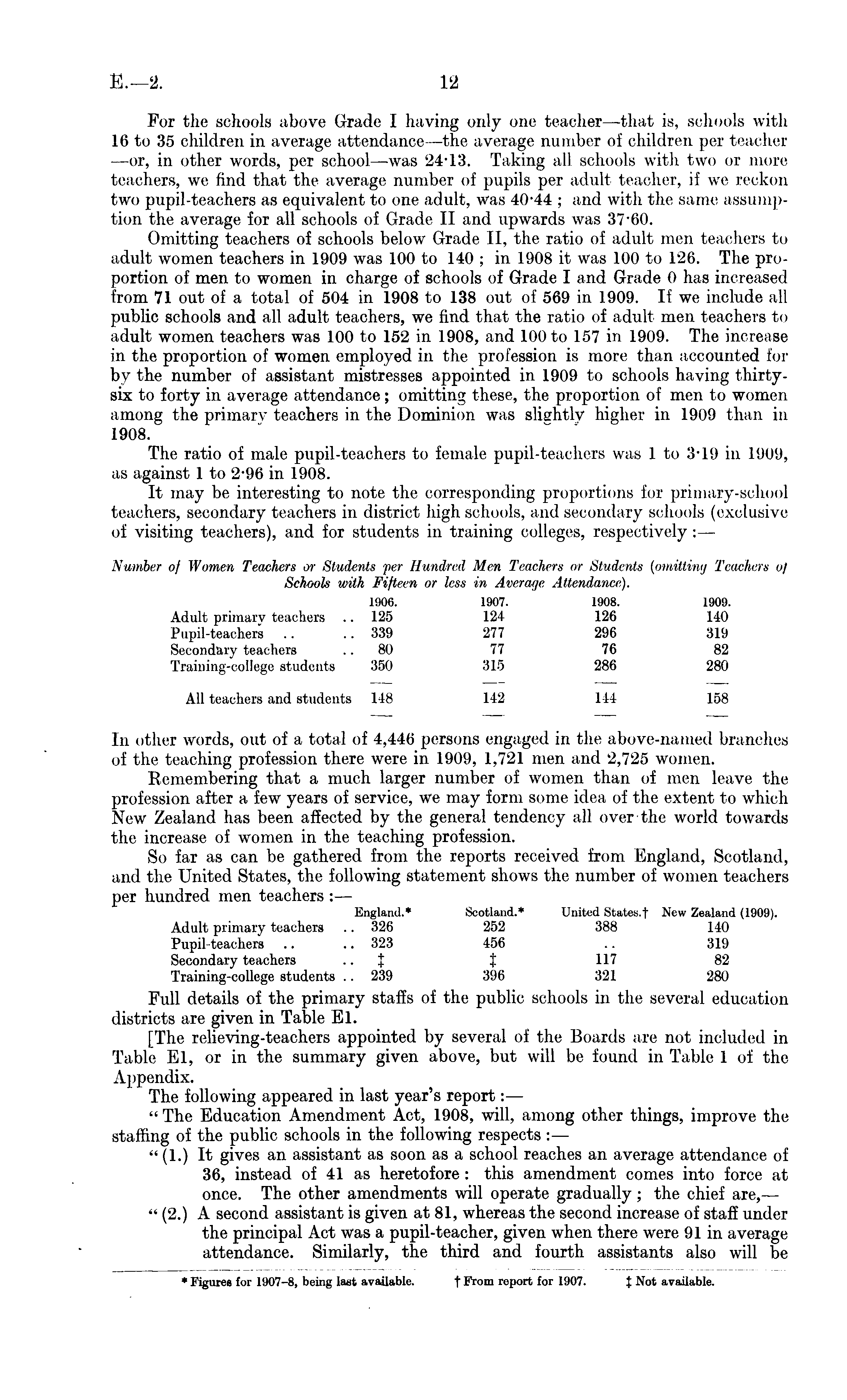 For the schools above Grade I having only one teacher—that is, schools with 16 to 35 children in average attendance—the average number of children per teacher —or, in other words, per school—was 24*13. Taking all schools with two or more teachers, we find that the average number of pupils per adult teacher, if we reckon two pupil-teachers as equivalent to one adult, was 40*44 ; and with the same assumption the average for all schools of Grade II and upwards was 37*60. Omitting teachers of schools below Grade 11, the ratio of adult men teachers to adult women teachers in 1909 was 100 to 140 ; in 1908 it was 100 to 126. The proportion of men to women in charge of schools of Grade I and Grade 0 has increased from 71 out of a total of 504 in 1908 to 138 out of 569 in 1909. If we include all public schools and all adult teachers, we find that the ratio of adult men teachers to adult women teachers was 100 to 152 in 1908, and 100 to 157 in 1909. The increase in the proportion of women employed in the profession is more than accounted for by the number of assistant mistresses appointed in 1909 to schools having thirtysix to forty in average attendance ; omitting these, the proportion of men to women among the primary teachers in the Dominion was slightly higher in 1909 than in 1908. The ratio of male pupil-teachers to female pupil-teachers was 1 to 3*19 in 1909, as against 1 to 2-96 in 1908. It may be interesting to note the corresponding proportions for primary-school trackers, secondary teachers in district high schools, and secondary schools (exclusive of visiting teachers), and for students in training colleges, respectively:— Number of Women Teachers or Students per Hundred Men Teachers or Students (omitting Teachers of Schools with Fifteen or less in Average Attendance). 1906. 1907. 1908. 1909. Adult primary teachers .. 125 124 126 140 Pupil-teachers .. ..339 277 296 319 Secondary teachers 80 77 76 82 Training-college students 360 315 286 280 All teachers and students 148 142 144 158 In other words, out of a total of 4,446 persons engaged in the above-named branches of the teaching profession there were in 1909, 1,721 men and 2,725 women. Remembering that a much larger number of women than of men leave the profession after a few years of service, we may form some idea of the extent to which New Zealand has been affected by the general tendency all over the world towards the increase of women in the teaching profession. So far as can be gathered from the reports received from England, Scotland, and the United States, the following statement shows the number of women teachers per hundred men teachers :— England.* Scotland.* United States.t New Zealand (1909). Adult primary teachers .. 326 252 388 140 Pupil teachers .. ..323 456 .. 319 Secondary teachers % % 117 82 Training-college students .. 239 396 321 280 Full details of the primary staffs of the public schools in the several education districts are given in Table El. [The relieving-teachers appointed by several of the Boards are not included in Table El, or in the summary given above, but will be found in Table 1 of the Appendix. The following appeared in last year's report: — " The Education Amendment Act, 1908, will, among other things, improve the staffing of the public schools in the following respects :— " (1.) It gives an assistant as soon as a school reaches an average attendance of 36, instead of 41 as heretofore : this amendment comes into force at once. The other amendments will operate gradually ; the chief are, — " (2.) A second assistant is given at 81, whereas the second increase of staff under the principal Act was a pupil-teacher, given when there were 91 in average attendance. Similarly, the third and fourth assistants also will be * Figures for 1907-8, being last available. t From report for 1907. % Not available.