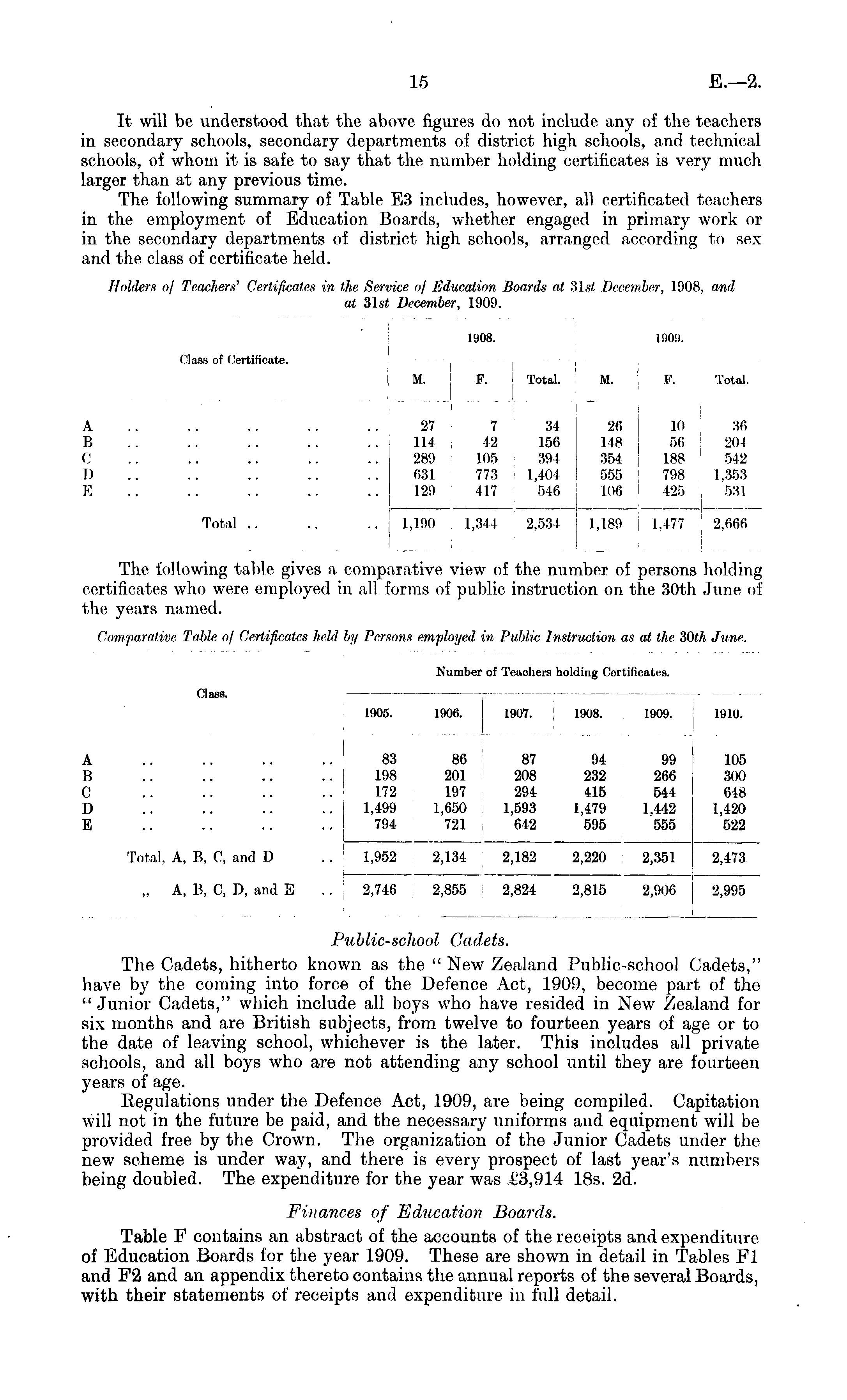 Public-school Cadets. The Cadets, hitherto known as the " New Zealand Public-school Cadets," have by the coining into force of the Defence Act, 1909, become part of the " Junior Cadets," which include all boys who have resided in New Zealand for six months and are British subjects, from twelve to fourteen years of age or to the date of leaving school, whichever is the later. This includes all private schools, and all boys who are not attending any school until they are fourteen years of age. Kegulations under the Defence Act, 1909, are being compiled. Capitation will not in the future be paid, and the necessary uniforms and equipment will be provided free by the Crown. The organization of the Junior Cadets under the new scheme is under way, and there is every prospect of last year's numbers being doubled. The expenditure for the year was i' 3,914 18s. 2d. Finances of Education Boards. Table F contains an abstract of the accounts of the receipts and expenditure of Education Boards for the year 1909. These are shown in detail in Tables Fl and F2 and an appendix thereto contains the annual reports of the several Boards, with their statements of receipts and expenditure in full detail.