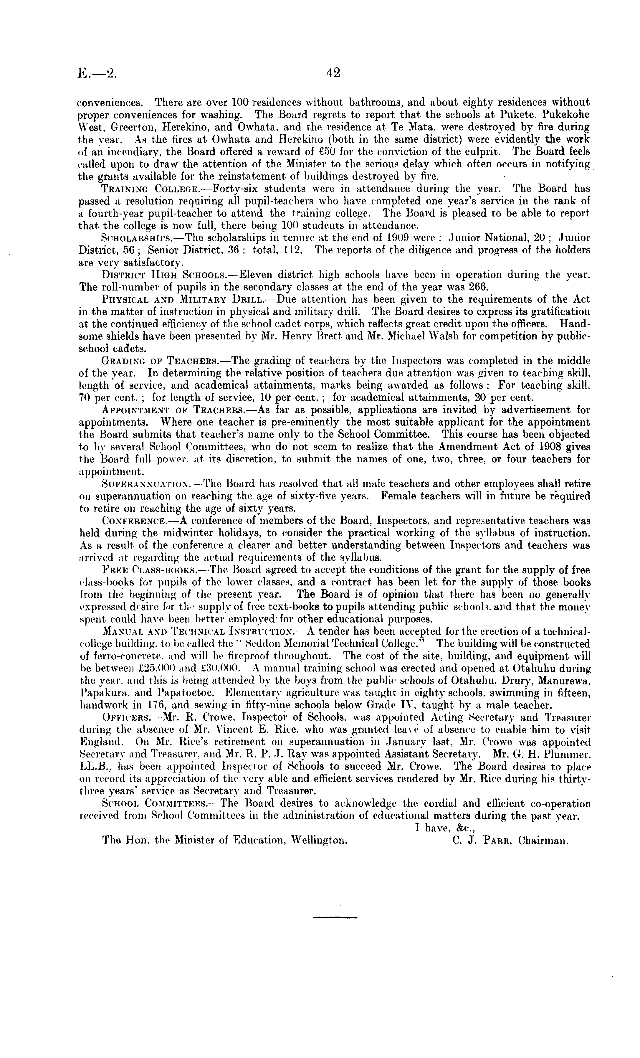 conveniences. There are over 100 residences without bathrooms, and about eighty residences without proper conveniences for washing. The Board regrets to report that the schools at Pukete, Pukekohe West, Greerton. Herekino, and Owhata. and the residence at Tβ Mate, were destroyed by fire during the year. As the fires at Owhata and Herelrino (both in the same district) were evidently the work (if an incendiary, the Hoard offered a reward of £50 for the conviction of the culprit. The Board feels called upon to draw the attention of the Minister to the serious delay which often occurs in notifying the grants available for the reinstatement of buildings destroyed by fire. TRAINING COLLEGE. —Forty-six students were in attendance during the year. The Board has passed a resolution requiring all pupil-teachers who have completed one year's .service in the rank of a fourth-year pupil-teacher to attend the training college. The Board is pleased to be able to report that the college is now full, there being 100 students in attendance. Scholarships.—The scholarships in tenure at the" end of 1909 were : Junior National, 20 : Junior District, 56 ; Senior District. 36 : total, 112. The reports of the diligence and progress of the holders are very satisfactory. District High Schools. —Eleven district high schools have been in operation during the year. The roll-number of pupils in the secondary classes at the end of the year was 266. Physical and Military Drill. —Due attention has been given to the requirements of the Act in the matter of instruction in physical and military drill. The Board desires to express its gratification at the continued efficiency of the school cadet corps, which reflects great credit upon the officers. Hand some shields have i n presented by Mr. Henry Brett and Mr. Michael Walsh for competition by publicschool cadets. Grading of Teachers. —The grading of teachers by the Inspectors was completed in the middle of the year. In determining the relative position of teachers due attention was given to teaching skill, length of service, and academical attainments, marks being awarded as follows : For teaching skill. 70 per cent. ; for length of service, 10 per cent. ; lor academical attainments, 20 per cent. Appointment of Teachers. —As far as possible, applications are invited by advertisement for appointments. Where one teacher is pre-eminently the most suitable applicant for the appointment the Board submits that teacher's name only to the School Committee. This course has been objected to by several School Committees, who do not seem to realize that the Amendment Act of 1908 gives the Hoard full power, at its discretion, to submit the names of one. two, three, or four teachers for appointment. Superannuation. The Board has resolved that all male teachers and other employees shall retire on superannuation on reaching the age of sixty-five years. Female teachers will in future be required to retire on reaching the age of sixty years. CONFERENCE. —A conference of members of the Hoard. Inspectors, and representative teachers was held during the midwinter holidays, to consider the practical working of the syllabus of instruction. As a result of the conference a clearer and better understanding between Inspectors and teachers was arrived at regarding the actual requirements of the syllabus. FREE CIaSS-BOOKB.- The Hoard agreed to accept the conditions of the grant for the supply of free class-books for pupils of the lower classes, and a contract has been let for the supply of those books From the beginning of the present year. The Board is of opinion that there has been no generall} expressed d< sire for th supply of free text-books to pupils attending public schools, and tlmr the money spent could have been better employed-for other educational purposes. Manual and Technical Instruction. A tender has been accepted for the election of a technicalcollege building, to be called the " Seddon Memorial Technical College." The building will be constructed of ferroconcrete, and will be fireproof throughout. The cost of the site, building, and equipment will be between £25,000 and £30,000. A manual training school was erected and opened at Otahuhu during the year, and this is being attended by the boys from the public .schools of Otahuhu. Drury. Mamirewa. Papakura, and Papatoetoe. Elemental agriculture was taught in eighty schools, swimming in fifteen, handwork in 17(i. and sewing in fifty-nine schools below Grade IV. taught by a male teacher. OFFICERS. Mr. l>. Crowe, Inspector of Schools, was appointed Acting Secretary and Treasurer (luring the absence c>l Mr. Vinceni E. Rice, who was granted leave of absence to enable'him to visit England. On Mr. Rice's retirement on superannuation in January last. Mr. Crowe was appointed Secretary and Treasurer, and Mr. R. 1 , . .1. Ray was appointed Assistant Secretary. Mr. G. 11. I'luninier. LL.B., has been appointed Inspector of Schools to succeed Mr. Crowe. The Hoard desires to place on record its appreciation of the very able and efficient services rendered by Mr. Rice during his thirtythree years' service as Secretary and Treasurer. Sriiocii. Committees. The , Board desires to acknowledge the cordial and efficient co-operation received from School Committees in the administration of educational matters during the past year. T have. &c, Thu Hon. the Minister of Education. Wellington. C. J. Pahh. Chairman.