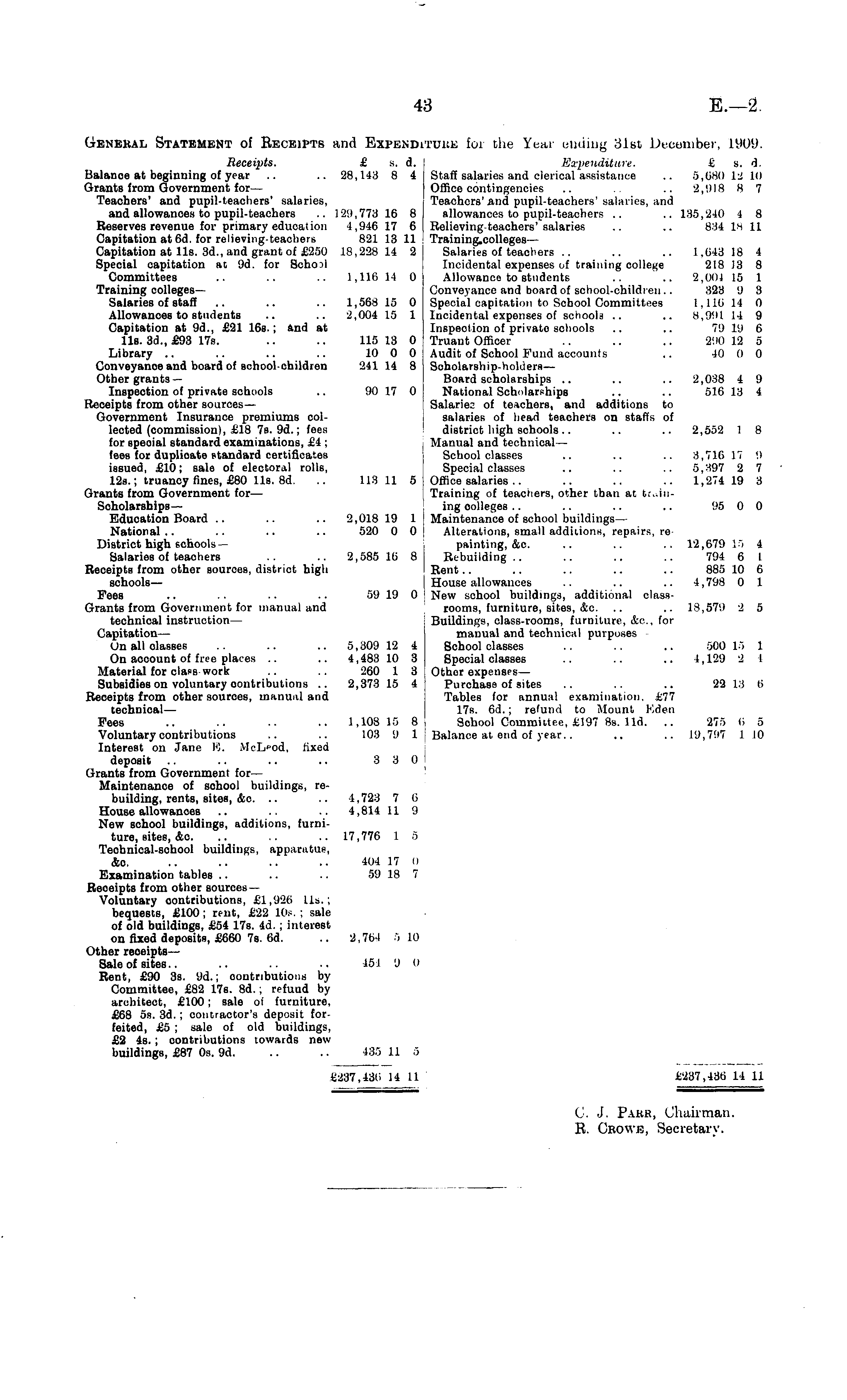 General Statement of Beceipts and Expbmdituub for the Year ending 31st December, 1909. Receipts. £ s. d. Expenditure. I; s. d. Balance at beginning of year .. .. 28,143 8 4 Staff salaries and clerical assistance .. 5,680 1-j 10 Grants from Government for— Office contingencies .. .. .. 2,!) 18 8 7 Teachers' and pupil-teacliers' salaries, Teachers' and pupil-teachers' salaries, and and allowances to pupil-teachers .. 129,778 16 8 allowances to pupil-teachers .. .. 135,240 4 8 Reserves revenue for primary education 4,946 17 6 [ Relieving-teachers'salaries .. .. 834 18 11 Capitation at 6d. for relieving-teacbers 821 13 11 ! Training.colleges— Capitation at 11s. 3d., and grant of £250 18,228 14 2 Salaries of teachers .. .. .. 1.G43 18 4 Special capitation at 9d. for Scho?! Incidental expenses of training college 218 13 8 Committees .. .. .. 1,116 14 0 Allowance to students .. .. 2,004 15 1 Training colleges— Conveyance and board of school-children.. 323 U 3 Salaries of staff .. .. .. 1,568 15 0 Special capitation to School Committ.r< 1.1 i(i 14 0 Allowances to stn.ients .. .. 2,004 15 1 Incidental expenses of school .. .. 8,991 14 9 Capitation at 9d., £21 16e.; and at Inspection of privato schools .. .. 79 19 6 11s. 3d., £93 17?. .. .. 115 13 0 Truant Officer .. .. .. -2:10 12 5 Library .. .. .. .. 10 0 0 Audit of School Fund accounts .. 40 0 0 Conveyance and board of schoolchildren 241 14 8 ; Soholarship-hokiers— Other grants— Board scholarships .. .. .. 2,038 4 9 Inspection of private schools .. 90 17 0 National Scholarships .. .. 516 13 4 Receipts from other sources— Salaries of teachers, and additions to Government Insurance premiums col- salaries of head teachers on staffs of lected (commission), £18 7s. 9d.; fees district high schools.. .. .. 2,552 1 8 for speoial standard examinations, £4 ; Manual and technical— fees for duplicate standard certificates School classes .. .. .. 3,710 17 !> issued, £10; sale of electoral rolls, Special classes .. .. .. 5,397 2 7 125.; truancy fines, £80 lls. Bd. .. 113 11 5 Office salaries .. .. .. .. 1,274 19 8 Grants from Government for— Training of teachers, other than at t.-..ii;-Scholarsbips— ing colleges .. .. .. .. 95 0 0 Education Board .. .. .. 2,018 19 1 | Maintenance of school buildings— National .. .. .. .. 520 0 0! Alterations, small additions, repairs, re District high schools— painting, &c. .. .. .. 12,679 !•"> 4 Salaries of teachers .. .. 2,585 1(3 8 Rebuilding.. .. .. .. 794 6 1 Receipts from other sources, district high Rent .. .. .. .. .. 885 10 6 schools— i House allowances .. .. .. 4,79S 0 1 Pees .. .. .. .. 59 19 0 New school buildings, additional classGrants from Government for manual and rooms, furniture, sites, &c. .. .. 18,57.) 2 5 technical instruction— Buildings, class-rooms, furniture, Ac, for Capitation — manual and technical purposes On all classes .. .. .. 5,309 12 4 School classes .. .. .. 500 1"> 1 On account of free places .. .. 4,483 10 3 Special classes .. .. .. 4,129 9 1 Material for class work .. .. 260 1 3 \ Other expenses— Subsidies on voluntary contributions .. 2,373 15 4 ■ Purchase of sites .. .. .. 22 13 6 Receipts from other sources, manual and Tables for annual examination. £77 technical — 17s. 6d.; refund to Mount Kden Pees .. .. .. .. 1,108 15 8 School Coinmiitee, £197 Bs. lid. .. 275 6 5 Voluntary contributions .. .. 103 9 1 Balance at end of year.. .. .. 19,797 1 10 Interest on Jane ffi. fixed deposit .. .. .. .. 3 3 0 Grants from Government for— Maintenance of school buildings, rebuilding, rents, sites, &c. .. .. 4,723 7 li House allowances .. .. .. 4,814 11 9 New school buildings, additions, furniture, sites, &c. .. .. .. 17,776 I 5 Technical-school buildings, apparatus, &o. .. .. .. .. 404 17 (I Examination tables .. .. .. 59 18 7 Receipts from other sourcesVoluntary contributions, £1,926 Us.; bequests, £100 ; rent, £22 10». ; sale of old buildings, £54 17s. 4d. ; interest on fixed deposits, £660 7s. 6d. .. 2,761 510 Other receipts— Baleo£ sites.. .. .. .. 451 'J 0 Rent, £90 3s. 9d.; contributions by Committee, £82 17s. Bd.; refuud by architect, £100; sale oi furniture, £68 sa. 3d. ; contractor's deposit forfeited, £5 ; sale of old buildings, £2 45.; contributions cowards new buildings, £87 os. 9d. .. .. 188 11 5 t2:i7,l3ii 14 11 6387,488 11 11 C. J. Pakb, Chairman. R. Ckowb, Secretary.