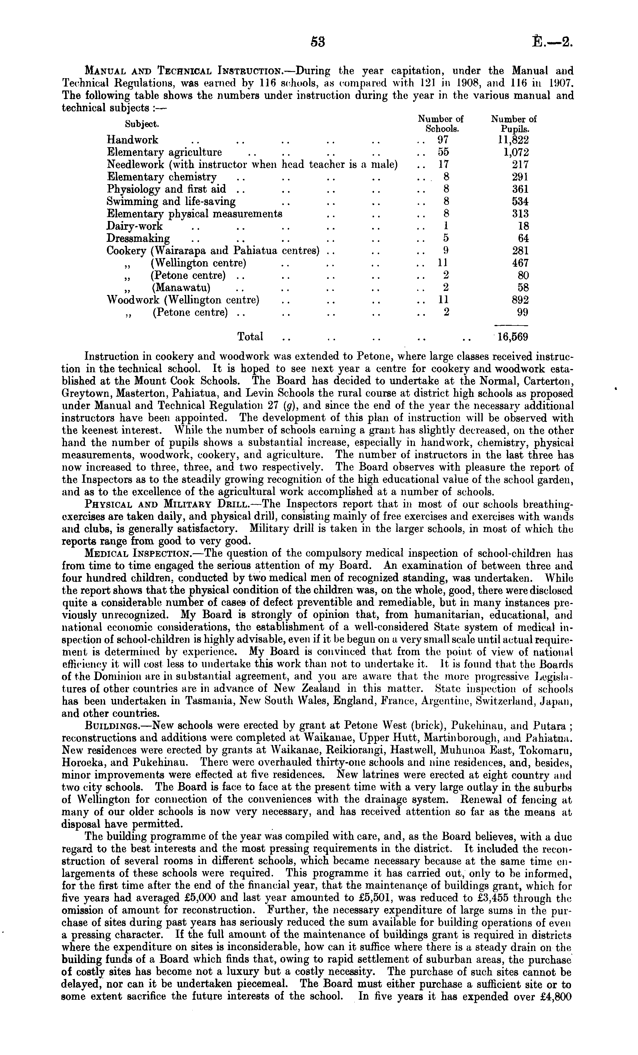 Manual and Technical Instruction.—During the year capitation, under the Manual and Technical Regulations, was earned by 116 schools, as compared with 121 in 1908, and 116 in I m>7. The following table shows the numbers under instruction during the year in the various manual and technical subjects : — v . . . Number of Number of Sub J ect Schools. Pupils. Handwork .. .. .. .. .. ..97 11,822 Elementary agriculture .. .. .. .. 55 1,072 Needlework (with instructor when head teacher is a male) 17 217 Elementary chemistry .. .. .. .. 8 291 Physiology and first aid .. .. .. .. .. 8 361 Swimming and life-saving .. .. .. .. 8 534 Elementary physical measurements .. .. .. 8 313 Dairy-work .. .. .. .. .. .. 1 18 Dressmaking .. .. .. .. .. .. 5 64 Cookery (Wairarapa and Pahiatua centres) . . .. 9 281 (Wellington centre) .. .. .. ..11 467 (Petone centre) .. .. .. .. .. 2 80 ~ (Manawatu) .. .. .. .. .. 2 58 Woodwork (Wellington centre) .. .. .. ..11 892 (Petone centre) .. .. .. .. 2 99 Total .. .. .. .. .. 16,569 Instruction in cookery and woodwork was extended to Petone, where large classes received instruction in the technical school. It is hoped to see next year a centre for cookery and woodwork established at the Mount Cook Schools. The Board has decided to undertake at the Normal, Carterton, Greytown, Masterton, Pahiatua, and Levin Schools the rural course at district high schools as proposed under Manual and Technical Regulation 27 (g), and since the end of the year the necessary additional instructors have been appointed. The development of this plan of instruction will be observed with the keenest interest. While the number of schools earning a grant has slightly decreased, on the other hand the number of pupils shows a substantial increase, especially in handwork, chemistry, physical measurements, woodwork, cookery, and agriculture. The number of instructors in the last three has now increased to three, three, and two respectively. The Board observes with pleasure the report of the Inspectors as to the steadily growing recognition of the high educational value of the school garden, and as to the excellence of the agricultural work accomplished at a number of schools. Physical and Military Drill.—The Inspectors report that in most of our schools breathingexercises are taken daily, and physical drill, consisting mainly of free exercises and exercises with wands and clubs, is generally satisfactory. Military drill is taken in the larger schools, in most of which the reports range from good to very good. Medical Inspection.—The question of the compulsory medical inspection of school-children lias from time to time engaged the serious attention of my Board. An examination of between three and four hundred children, conducted by two medical men of recognized standing, was undertaken. While the report shows that the physical condition of the children was, on the whole, good, there were disclosed quite a considerable number of cases of defect preventable and remediable, but in many instances previously unrecognized. My Board is strongly of opinion that, from humanitarian, educational, and national economic considerations, the establishment of a well-considered State system of medical inspection of school-children is highly advisable, even if it be begun on a very small scale until actual requirenienl is determined by experience. My Board is convinced that from the point of view of national efficiency it will cost less to undertake this work than not to undertake it. It is found that the Boards of the Dominion me in substantial agreement, and you are, aware that the more progressive Legisla tures of other countries are in advance of New Zealand in this matter. State inspection of schools has been undertaken in Tasmania, New South Wales, England, France, Argentine, Switzerland, Japan and other countries. Buildings.—New schools were erected by grant at Petone West (brick), Pukchinau, and Putara ; reconstructions and additions were completed at Waikanae, Upper Hutt, Martinborough, and Pahiatua. New residences were erected by grants at Waikanae, Reikiorangi, Hastwell, Muhunoa East, Tokomaru, Horoeka, and Pukehinau. There were overhauled thirty-one schools and nine residences, and, besides, minor improvements were effected at five residences. New latrines were erected at eight country and two city schools. The Board is face to face at the present time with a very large outlay in the suburbs of Wellington for connection of the conveniences with the drainage system. Renewal of fencing at, many of our older schools is now very necessary, and has received attention so far as the means at disposal have permitted. The building programme of the year was compiled with care, and, as the Board believes, with a due regard to the best interests and the most pressing requirements in the district. It included the recon struction of several rooms in different schools, which became necessary because at the same time enlargements of these schools were required. This programme it has carried out, only to be informed, for the first time after the end of the financial year, that the maintenance of buildings grant, which for five years had averaged £5,000 and last year amounted to £5,501, was reduced to £3,455 through the, omission of amount for reconstruction. Further, the necessary expenditure of large sums in the purchase of sites during past years has seriously reduced the sum available for building operations of even a pressing character. If the full amount of the maintenance of buildings grant is required in districts where the expenditure on sites is inconsiderable, how can it suffice where there is a steady drain on the building funds of a Board which finds that, owing to rapid settlement of suburban areas, the purchase of costly sites has become not a luxury but a costly necessity. The purchase of such sites cannot be delayed, nor can it be undertaken piecemeal. The Board must either purchase a sufficient