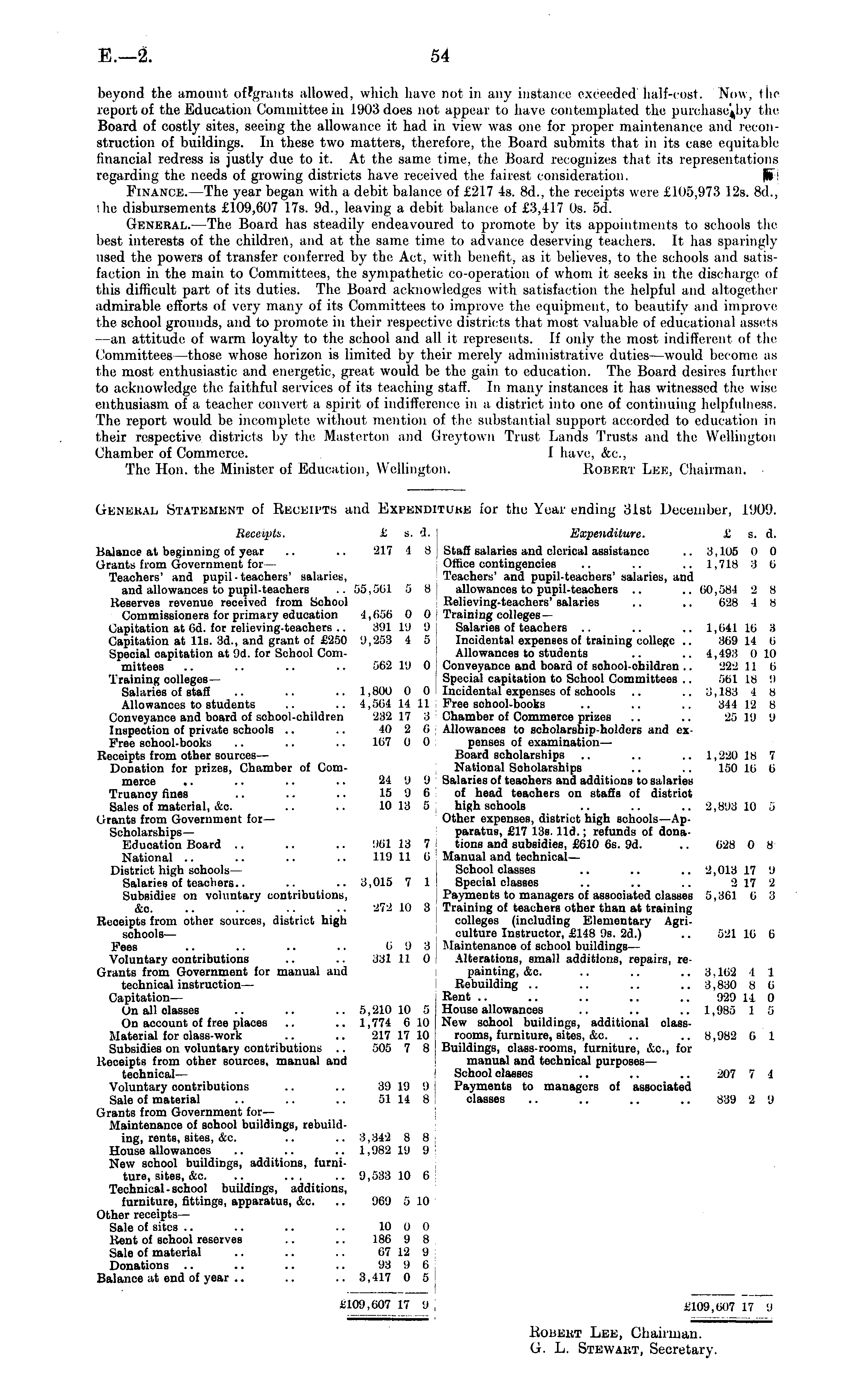 beyond the amount of'grants allowed, whicli have not in any instance exceeded'hall-cost. Now, the report of the Education Committee in 1903 does not appear to have contemplated the putehasejby tin . Board of costly sites, seeing the allowance it had in view was one for proper maintenance and recon struction of buildings. In these two matters, therefore, the Board submits that in its case equitable financial redress is justly due to it. At the same time, the Board recognizes that its representations regarding the needs of growing districts have received the fairest consideration. l^! Finance. —The year began with a debit balance of £217 4s. Bd., the receipts were £105,973 12s. Bd., '.he disbursements £109,607 17s. 9d., leaving a debit balance of £3,417 os. sd. General. —The Board has steadily endeavoured to promote by its appointments to schools the best interests of the children, and at the same time to advance deserving teachers. It has sparingly used the powers of transfer conferred by the Act, with benefit, as it believes, to the schools and satisfaction in the main to Committees, the sympathetic co-operation of whom it seeks in the discharge of this difficult part of its duties. The Board acknowledges with satisfaction the helpful and altogether admirable efforts of very many of its Committees to improve the equipment, to beautify and improve the school grounds, and to promote in their respective districts that most valuable of educational assets —an attitude of warm loyalty to the school and all it represents. If only the most indifferent of the Committees —those whose horizon is limited by their merely administrative duties—would become as the most enthusiastic and energetic, great would be the gain to education. The Board desires further to acknowledge the faithful services of its teaching staff. In many instances it has witnessed the wise enthusiasm of a teacher convert a spirit of indifference in a district into one of continuing helpfulness. The report would be incomplete without mention of the substantial support accorded to education in their respective districts by the Masterton and Greytown Trust Lands Trusts and the Wellington Chamber of Commerce. I have, &c, The Hon. the Minister of Education, Wellington. Robert Lee, Chairman. General Statement of Receipts and Expenditure for the Year ending 31st December, l!J09. Receipts. £ s. i. ! Expenditure. il s. d. Balance at beginning of year .. .. '217 i 8 Staff salaries and clerical assistance .. 3,105 (1 0 Grants from Government for — Office contingencies .. .. .. 1,718 8 6 Teachers' and pupil-teachers' salaries, Teachers' and pupil-teachers' salaries, and and allowances to pupil-teachers .. 55,501 5 8 allowances to pupil-teachers .. .. 00,584 2 8 Reserves revenue received from School Relieving-teachers' salaries .. .. 6128 1 y Commissioners for primary education 1,656 0 0 Training collegesCapitation at Gd. for relieving-teachers .. 391 l'J 9 I Salaries of teachers .. .. .. 1,041 10 3 Capitation at 11s. 3d., and grant of £250 9,253 45| Incidental expenses of training college .. 309 14 0 Special capitation at 9d. for School Com- Allowances to students .. .. 4,493 0 1(1 mittees .. .. .. .. 562 19 0 ' Conveyance and board of sohool-children.. 222 11 0 Training colleges— Special capitation to School Committees .. 501 18 f> Salaries of staff .. .. .. 1,800 0 0 Incidental expenses of schools .. .. 3,183 1 8 Allowances to students .. .. 4,564 14 11 Free school-books .. .. .. 344 12 H Conveyance and board of school-children 232 17 3 Chamber of Commerce prizes .. .. 25 l'J 'J Inspection of private schools .. .. 10 2 0 Allowances to scholarship-holders and exFree school-books .. .. .. 107 0 0 penses of examination— Receipts from other sources— Board scholarships .. .. .. 1,220 18 7 Donation for prizes, Chamber of Com- National Scholarships .. .. 150 10 6 merce .. .. . ■ ■. 24 'J 'J Salaries of teachers and additions to salaries Truanoy fines .. .. .. 15 0 6 of head teachers on staffs of distriot Sales of material, &c. .. .. 10 13 5 high schools .. .. .. 2,8'J3 10 5 Grants from Government for— Other expensoa, district high schools—ApScholarships— paratue, £17 13s. lid.; refunds of dona Eduoation Board .. .. .. 90113 7 tions and subsidies, £610 6s. 9d. .. 028 0 8 National .. .. .. .. 119 11 0 Manual and technical— District high sohools— School classes .. .. .. 2,013 17 'J Salaries of teachers.. .. .. 3,015 7 1 Special classes .. .. .. 2 17 2 Subsidies on voluntary contributions, Payments to managers of associated classes 5,361 0 3 &c. .. . ■ .. .. 272 10 3 Training of teachers other than at training Receipts from other sources, district high colleges (including Elementary Agrischools— culture Instructor, £148 9s. 2d.) .. 521 10 6 Fees .. .. .. .. 0 9 3 j Maintenance of school buildings— Voluntary contributions .. .. 331 11 0 Alterations, small additions, repairs, reGrants from Government for manual and painting, &o. .. .. .. 3,102 4 1 technical instruction— Rebuilding .. .. .. .. 3,830 8 0 Capitation— : Rent .. .. .. .. .. 929 11 0 On all classes .. .. .. 5,210 10 5 ; House allowances .. .. .. 1,985 1 5 On account of free places .. .. 1,774 610 j New school buildings, additional classMaterial for olass-work .. .. 217 17 10 rooms, furniture, sites, &c. .. .. 8,982 0 1 Subsidies on voluntary contributions .. 505 78 | Buildings, classrooms, furniture, &c, for Receipts from other sources, manual and manual and technical purposes— technical— School classes .. .. .. ilf 1 1 Voluntary contributions .. .. 39 19 '.) Payments to managers of associated Sale of material .. .. .. 51 14 8 classes .. .. .. .. 839 2 9 Grants from Government for— Maintenance of school buildings, rebuilding, rents, sites, &c. .. .. 3,342 8 8 House allowances .. .. .. 1,982 19 9 New school buildings, additions, furniture, sites, &c. .. .. .. 9,533 10 6 Technical - school buildings, additions, furniture, fittings, appara