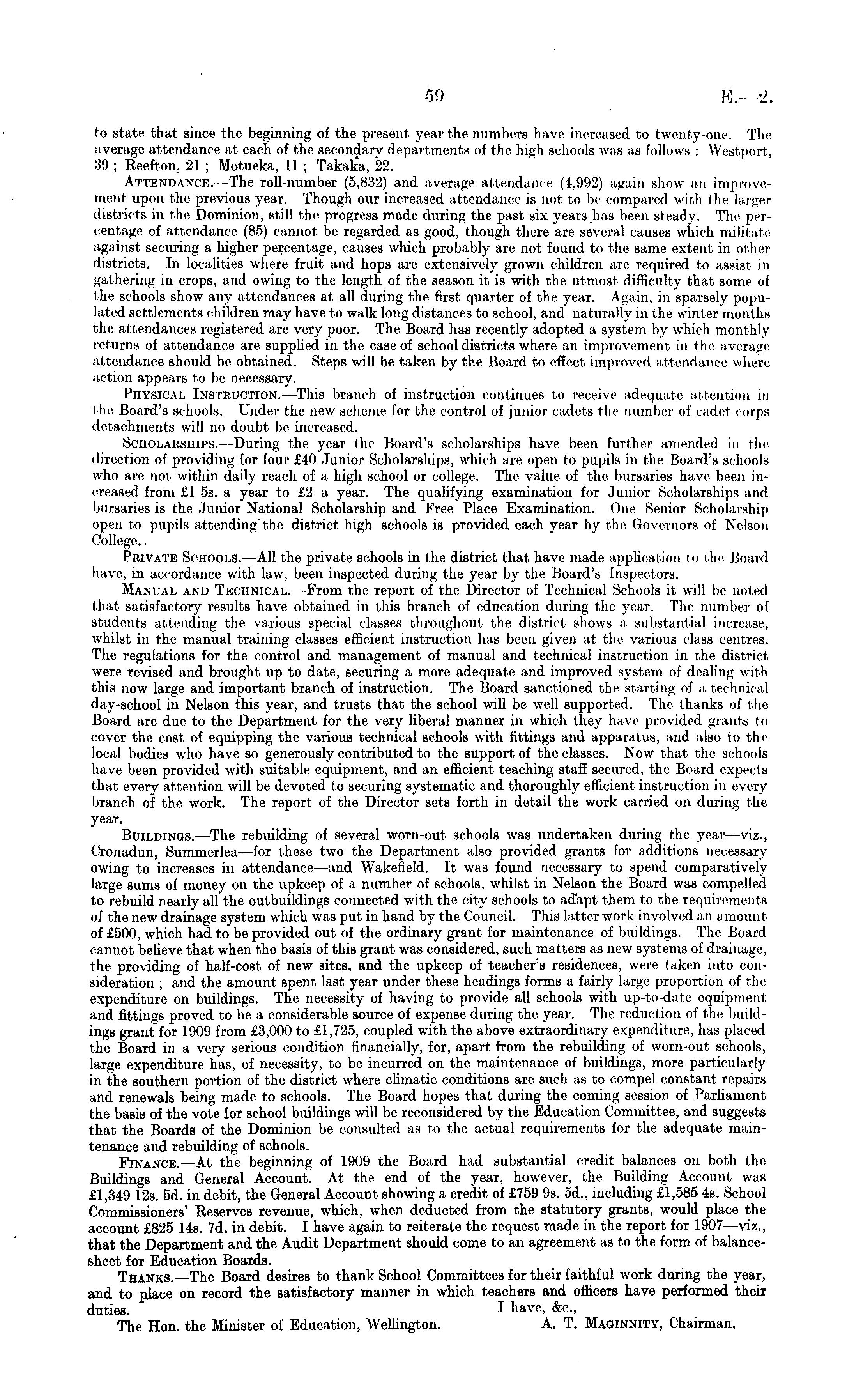 to state that since the beginning of the present year the numbers have increased to twenty-one. The average attendance at each of the secondary departments of the high schools was as follows : W'estport, 39 ; Reefton, 21 ; Motueka, 11 ; Takak'a, 22. Attendance.—The roll-number (5,832) and average attendance (4,992) again enow as improvement upon the previous year. Though our increased attendance is nol to be compared with the larger districts in the Dominion, still the progress made during the past six years lias been steady. The per centage of attendance (86) cannol be regarded as good, though there are several causes which militate against securing a higher percentage, causes which probably are not found to the same extent in other districts. In localities where fruit and hops are extensively grown children are required to assist in gathering in crops, and owing to the length of the season it is with the utmost difficulty that some of the schools show any attendances at all during the first quarter of the year. Again, in sparsely populated settlements children may have to walk long distances to school, and naturally in the winter months I lie attendances registered are very poor. The Board has recently adopted a system by which monthly returns of attendance are supplied in the case of school districts where an improvement in the average attendance should be obtained. Steps will be taken by the Board to effect improved attendance v here action appears to be necessary. Physical Instruction.—-This branch of instruction continues to receive adequate attention in i lie Board's schools. Under the new scheme for the control of junior cadets the number of cadet corps detachments will no doubt be increased. SCHOLARSHIPS.—During the year the Board's scholarships have been Eurther amended in the d i lection of providing for four £40 Junior Scholarships, which are open to pupils in the Boards schools who are not within daily reach of a high school or college. The value of the bursaries have been in creased Erom tl ss. a year to £2 a year. The qualifying examination for Junior Scholarships and bursaries is the Junior National Scholarship and Free Place Examination. One Senior Scholarship open to pupils attending the district high schools is provided each year by the Governors of Nelson College. Pri vatic Schools. —All the private schools in the district that have made application t" I be Board have, in accordance with law, been inspected during the year by the Board's Inspectors. Manual and Technical. —From the report of the Director of Technical Schools it will be noted that satisfactory results have obtained in this branch of education during the year. The number of students attending the various special classes throughout the district shows a substantial increase, whilst in the manual training classes efficient instruction has been given at the various class centres. The regulations for the control and management of manual and technical instruction in the district were revised and brought up to date, securing a more adequate and improved system of dealing with i bis now large and important branch of instruction. The Board sanctioned the, starting of a technical day-school in Nelson this year, and trusts that the school will be well supported. The thanks of the Board are due to the Department for the very liberal manner in which they have provided giants to cover the cost of equipping the various technical schools with fittings and apparatus, and also to the local bodies who have so generously contributed to the support of the classes. Now that the schools have been provided with suitable equipment, and an efficient teaching staff secured, the Board expects that every attention will be devoted to securing systematic and thoroughly efficient instruction in every branch of the work. The report of the Director sets forth in detail the work carried on during the year. Buildings.—The rebuilding of several worn-out schools was undertaken during the year —viz., Oronadun, Summerlea —for these two the Department also provided grants for additions necessary owing to increases in attendance —and Wakefield. It was found necessary to spend comparatively large sums of money on the upkeep of a number of schools, whilst in Nelson the Board was compelled to rebuild nearly all the outbuildings connected with the city schools to adapt them to the requirements of the new drainage system which was put in hand by the Council. This latter work involved an amount of £500, which had to be provided out of the ordinary grant for maintenance of buildings. The Board cannot believe that when the basis of this grant was considered, such matters as new systems of drainage, the providing of half-cost of new sites, and the upkeep of teacher's residences, were taken into consideration ; and the amount spent last year under these headings forms a fairly large proportion of the expenditure on buildings. The necessity of having to provide all schools with up-to-date equipment and fittings proved to be a considerable source of expense during the year. The reduction of the buildings grant for 1909 from £3,000 to £1,725, coupled with the above extraordinary expenditure, has placed the Board in a very serious condition financially, for, apart from the rebuilding of worn-out schools, large expenditure has, of necessity, to be incurred on the maintenance of buildings, more particularly in the southern portion of the district where climatic conditions are such as to compel constant repairs and renewals being made to schools. The Board hopes that during the coming session of Parliament the basis of the vote for school buildings will be reconsidered by the Education Committee, and suggests that the Boards of the Dominion be consulted as to the actual requirements for the adequate maintenance and rebuilding of schools. Finance. —At the beginning of 1909 the Board had substantial credit balances on both the Buildings an