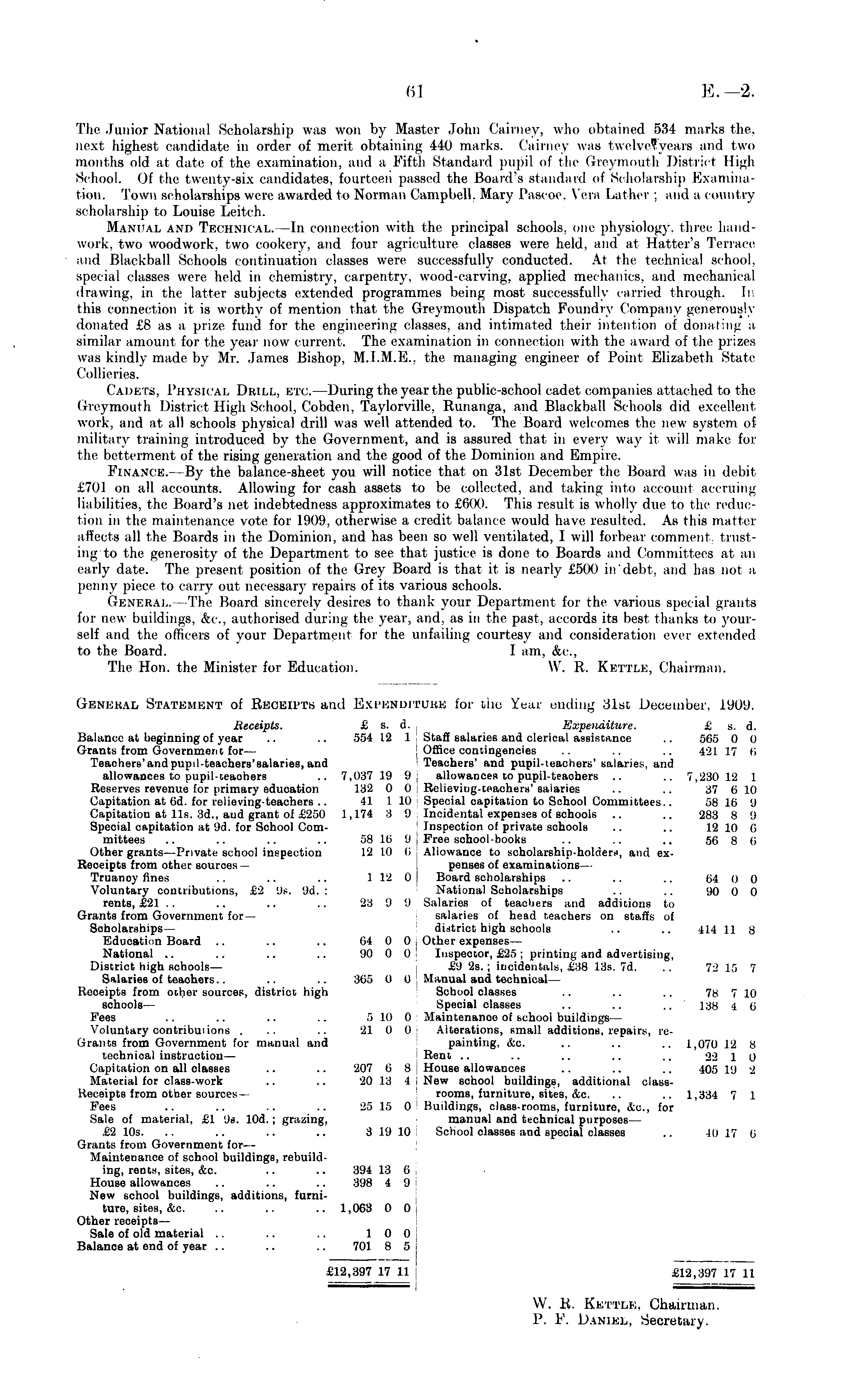 The Junior National Scholarship was won by Master John Cairney, who obtained 534 marks the. next highest candidate in order of merit obtaining 440 marks. Cairney was twelvefyears and two months old at date of the examination, and a Fifth Standard pupil of the Greymouth Districi High School. Of the twenty-six candidates, fourteen passed the Board's standard of Scholarship Examination. Town scholarships were awarded to Norman Campbell. Mary Pascoe, Vera Lather : and a country scholarship to Louise Leitch. Manual and Technical. In connection with the principal schools, one physiology, three hand work, two woodwork, two cookery, and four agriculture classes were held, and at Hatter's Terrace and Blackball Schools continuation classes were successfully conducted. At the technical school, special classes were held in chemistry, carpentry, wood-carving, applied mechanics, and mechanical drawing, in the latter subjects extended programmes being most successfully carried through. !i this connection it is worthy of mention that the Greymouth Dispatch Foundry Company generously donated £8 as a prize fund for the engineering classes, and intimated their intention of donating a similar amount for the year now current. The examination in connection with the award of the prizes was kindly made by Mr. James Bishop, M.T.M.E.. the managing engineer of Point Elizabeth State Collieries. Cadets, Physical Drill, etc. —During the year the public-school cadet companies attached to the Greymouth District High School, Cobden, Taylorville, Runanga, and Blackball Schools did excellent work, and at all schools physical drill was well attended to. The, Hoard welcomes the new system of military training introduced by the Government, and is assured that in every way it will make for the betterment of the rising generation and the good of the Dominion and Empire. Finance. —By the balance-sheet you will notice that on 31st December the Board was in debil £701 on all accounts. Allowing for cash assets to be collected, and taking into account accruing liabilities, the Board's net indebtedness approximates to £()00. This result is wholly due to the reduction in the maintenance vote lor 1909, otherwise a credit balance would have resulted. As this matter affects all the Boards in the Dominion, and has been so well ventilated, I will forbear comment trusi ing "to the generosity of the Department to see that justice is done to Boards and Committees at an early date. The present position of the Grey Board is that it is nearly £500 in'debt, and has not a penny piece to carry out necessary repairs of its various schools. General. —The Board sincerely desires to thank your Department for the various special grants for new buildings, &c, authorised during the year, and, as in the past, accords its best thanks to yourself and the officers of your Department for the unfailing courtesy and consideration ever extended to the Board. I am, &c, The Hon. the Minister for Education. \V. R. Kettle, Chairman. General Statement of Receipts and Expenditure for cue Year ending 31st December. 1909. Beceipts. £ s. d. Expenditure. £ s. d. Balance at beginning of year .. .. 554 12 1 Staff salaries and clerical assistance .. 565 0 0 Grants from Government for— Office contingencies .. .. .. 421 17 t< Teachers'andpupil-teachers'salaries, and Teachers' and pupil-ieachers' salaries, and allowances to pupil-teachers .. 7,037 19 'J allowances to pupil-teachers .. .. 7,230 12 1 Reserves revenue for primary education LB2 0 0 Relieving-teachers' salaries .. .. 37 6 10 Capitation at Gd. for relieving-teachers .. 41 1 10 Special capitation to School Committees.. 58 16 9 Capitation at 11s. 3d., aud grant of £250 1,174 3 9 Incidental expenses of schools .. .. 283 8 9 Special capitation at 9d. for School Com- Inspection of private schools .. .. 12 10 6 mittees .. .. .. .. 58 l(i 9 Free sohool-books .. .. .. 56 8 6 Other grants—Private school inspection 12 10 (> Allowance to scholarship-holders, and exReceipts from other sources— penses of examinations— Truancy fines .. .. .. 1 12 0 Board scholarships .. .. .. 64 0 0 Voluntary contributions, £2 Us. 9d. : National Scholarships .. .. 90 0 0 rents, £'21 .. .. .. .. 2:i 9 9 Salaries of teachers and additions to Grants from Government for— salaries of head teachers on Bte.ffs of Scholarships— district high schools .. .. 414 11 8 Education Board .. .. .. i>l 0 0 Other expenses— National .. .. .. .. 90 0 0 Inspector, £'25; printing and advertising, District high schools— £9 2s. ; incidentals, £38 13s. 7d. .. 72 15 7 Salaries of teachers.. .. .. 365 0 0 Manual and technical— Receipts from other sources, districi high School classes .. .. .. 7B 7 10 schools— Special classes .. .. .. ' 138 4 6 Fees .. .. .. .. 510 0 Maintenance of school buildings— Voluntary contribuiions . .. .. 21 0 0 Alterations, small additions, repairs, reGrante from Government for manual and painting, &c. .. .. .. 1,070 13 8 technioal instruction— Rent .. .. .. .. .. 22 1 0 Capitation on all classes .. .. 207 li 8 House allowances .. .. .. 405 19 2 Material for class-work .. .. 20 13 4 New school buildings, additional classReceipts from other source rooms, furniture, sites. &c. .. .. 1,334 7 1 Fees .. .. .. .. 25 15 0 Buildings, class-rooms, furniture, &c, for Sale of material, £1 •Jβ. 10d.; grazing, manual and technical purposes— £2 103. .. .. .. .. 319 10 School classes and special classes .. 10 17 0 Grants from Government for— Maintenance of school buildings, rebuilding, rents, sites, &c. .. .. 394 13 (i House allowances .. .. .. 398 4 9 New school buildings, additions, furniture, sites, &c. .. .. .. 1,063 0 0 Other receipts— Sale of old material .. .. .. 10 0 Balance at end of year .. .. .. 701 8 5 £12,397 17 11 £12,397 17 11 " I ~ W. K. Kettlk. Chairman. P. F. Daniel, Secretary.