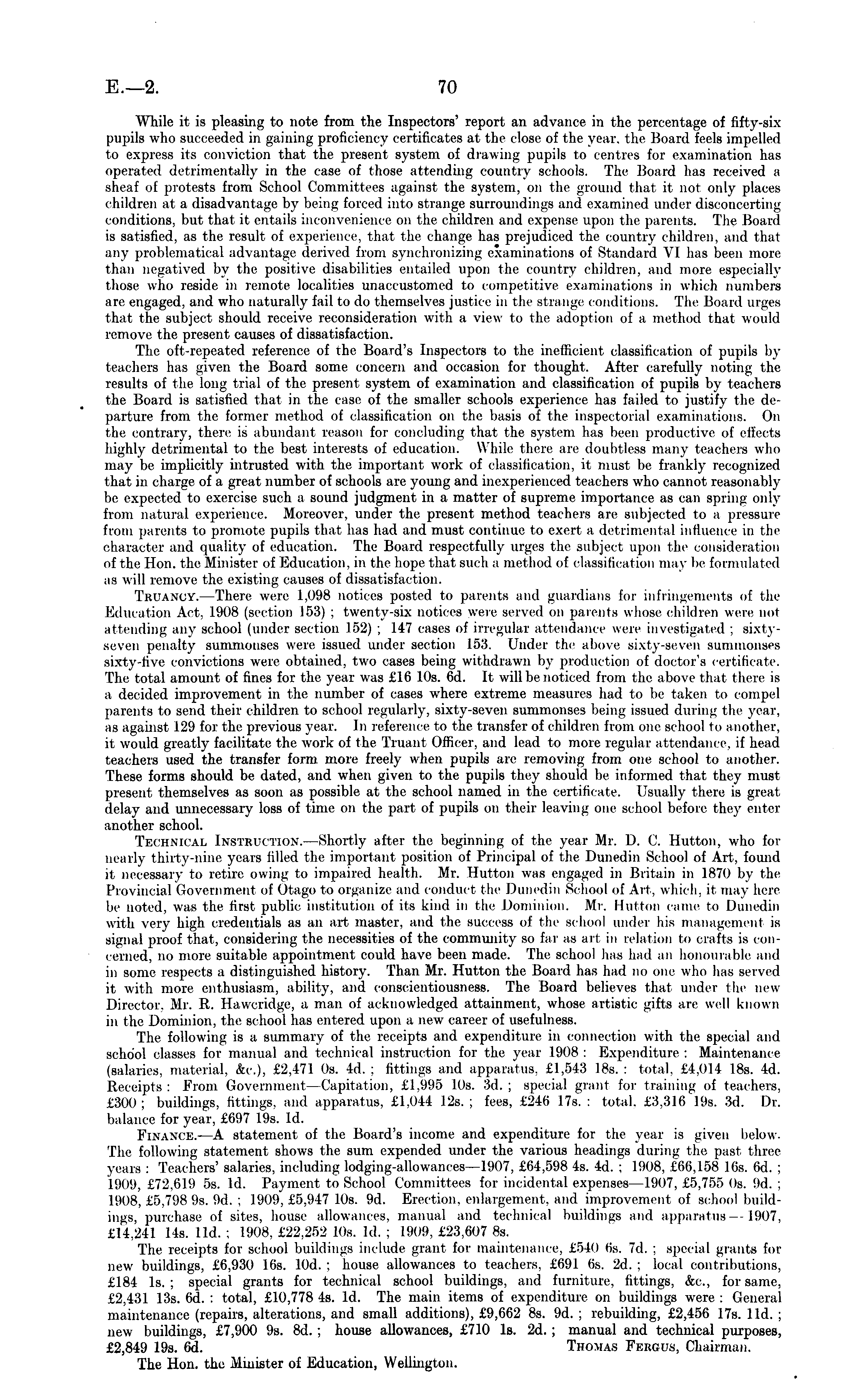 While it is pleasing to note from the Inspectors' report an advance in the percentage of fifty-six pupils who succeeded in gaining proficiency certificates at the close of the year, the Board feels impelled to express its conviction that the present system of drawing pupils to centres for examination has operated detrimentally in the case of those attending country schools. The Board lias received a sheaf of protests from School Committees against the system, on the ground that it not only places children at a disadvantage by being forced into strange surroundings and examined under disconcerting conditions, but that it entails inconvenience on the children and expense upon the parents. Tlie Board is satisfied, as the result of experience, that the change has prejudiced the country children, and that any problematical advantage derived from synchronizing examinations of Standard VI has been more than negatived by the positive disabilities entailed upon the country children, and more especially those who reside in remote localities unaccustomed to competitive examinations in which numbers are engaged, and who naturally fail to do themselves justice in the strange conditions. The Board urges that the subject should receive reconsideration with a view to the adoption of a method that would remove the present causes of dissatisfaction. The oft-repeated reference of the Board's Inspectors to the inefficient classification of pupils by teachers has given the Board some concern and occasion for thought. After carefully noting the results of the long trial of the present system of examination and classification of pupils by teachers the Board is satisfied that in the case of the smaller schools experience has failed to justify the departure from the former method of classification on the basis of the inspectorial examinations. On the contrary, there is abundant reason for concluding that the system has been productive of effects highly detrimental to the best interests of education. While there are doubtless many teachers who may be implicitly intrusted with the important work of classification, it mv.st be Erankly recognized that in charge of a great number of schools are young and inexperienced teachers who cannot reasonably be expected to exercise such a sound judgment in a matter of supreme importance as can spring only from natural experience. Moreover, under the present method teachers are subjected to a pressure from parents to promote pupils that has had and must continue to exert a detrimental influence in the character and quality of education. The Board respectfully urges the subject upon the consideration of the Hon. the Minister of Education, in the hope that such a method of classification may lie formulated as will remove the existing causes of dissatisfaction. Thuancy.—There were 1,098 notices posted to parents and guardians lor infringements of the Education Act, 1908 (section 1~>.'5) ; twenty-six notices were served on parents whose children were not attending any school (under section 152) ; 147 cases of irregular attendance were investigated ; sixtyseven penalty summonses were issued under section 15:5. Under the above sixty-seven summonses sixty-five convictions were obtained, two cases being withdrawn by production of doctor's certificate. The total amount of fines for the year was £16 10s. 6d. It will be noticed from the above that there is a decided improvement in the number of cases where extreme measures had to be taken to compel parents to send their children to school regularly, sixty-seven summonses being issued during the year, as against 129 for the previous year. In reference to the transfer of children from one school to another, it would greatly facilitate the work of the Truant Officer, and lead to more regular attendance, if head teachers used the transfer form more freely when pupils are removing from one school to another. These forms should be dated, and when given to the pupils they should lie informed that they must present themselves as soon as possible at the school named in the certificate. Usually there is great delay and unnecessary loss of time on the part of pupils on their leaving one school before they enter another school. Technical Instruction. —Shortly after the beginning of the year Mr. D. C. Hutton, who for nearly thirty-nine years filled the important position of Principal of the Dunedin School of Art. found it necessary to retire owing to impaired health. Mr. Hutton was engaged in Britain in 1870 by the Provincial Government of Otago to organize and conduct the Dunedin School of Art. which, it may here lie noted, was the first public institution of its kind in the Dominion. Mr. Button came to Dunedin with very high credentials as an art master, and the success of the school under his management is signal proof that, considering the necessities of the community so far as art in relation to crafts is concerned, no more suitable appointment could have been made. The school has had an honourable and in some respects a distinguished history. Than Mr. Hutton the Board has had no one who has served it with more enthusiasm, ability, and conscientiousness. The Board believes that under Ihe new Director. Mr. R. Hawcridge, a man of acknowledged attainment, whose artistic gifts are well known in the Dominion, the school has entered upon a new career of usefulness. The following is a summary of the receipts and expenditure in connection with the special and school classes for manual and technical instruction for the year 1908: Expenditure: Maintenance (salaries, material, &c), £2,471 os. 4d. ; fittings and apparatus, £1,543 18s.: total, £4,0H 18s. 4d. Receipts: From Government —Capitation, £1,995 10s. 3d.; special grant for training of teachers. £300 ; buildings, fittings, and apparatus, £1,044 12s. ; fees, £246 17s. : total, £3,316 19s. 3d. Dr. balance for year, £697 19s. Id. Finance.- —A statement of the Board's income and expenditu