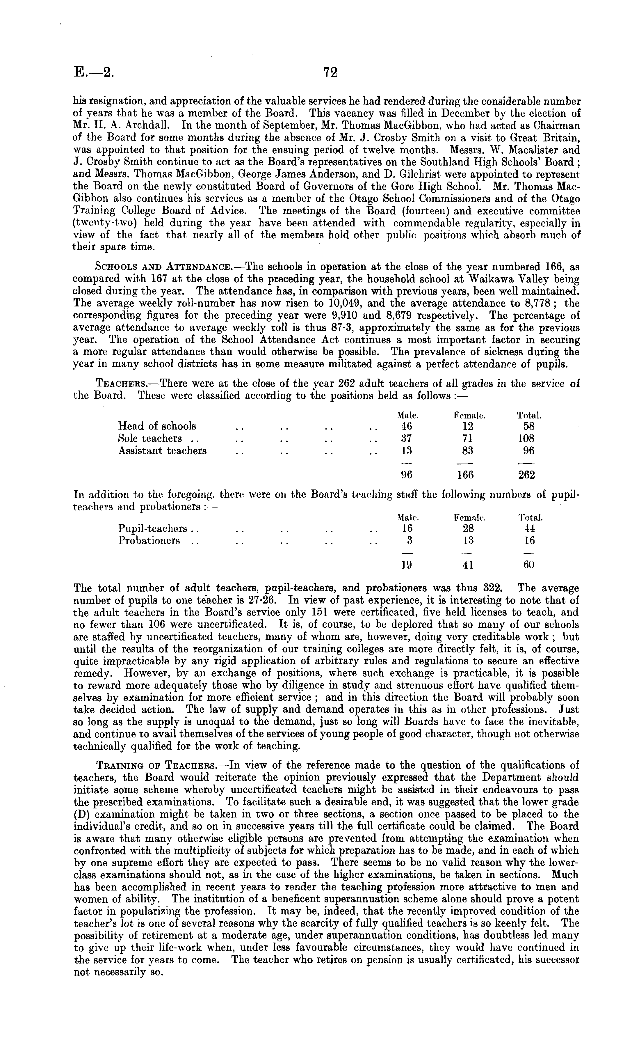 his resignation, and appreciation of the valuable services he had rendered during the considerable number of years that he was a member of the Board. This vacancy was filled in December by the election of Mr. H. A. Archdall. In the month of September, Mr. Thomas Mac Gibbon, who had acted as Chairman of the Board for some months during the absence of Mr. J. Crosby Smith on a visit to Great Britain, was appointed to that position for the ensuing period of twelve months. Messrs. W. Macalister and J. Crosby Smith continue to act as the Board's representatives on the Southland High Schools' Board ; and Messrs. Thomas Mat-Gibbon, George James Anderson, and D. Gilchrist were appointed to represent the Board on the newly constituted Board of Governors of the Gore High School. Mr. Thomas MacQibbon also continues his services as a member of the Otago School Commissioners and of the Otago Training College Board of Advice. The meetings of the Board (fourteen) and executive committee (twenty-two) held during the year have been attended with commendable regularity, especially in view of the fact that nearly all of the members hold other public positions which absorb much of their spare time. Schools and Attendance. —The schools in operation at the close of the year numbered 166, as compared with 167 at the close of the preceding year, the household school at Waikawa Valley being closed during the year. The attendance has, in comparison with previous years, been well maintained. The average weekly roll-number has now risen to 10,049, and the average attendance to 8,778; the corresponding figures for the preceding year were 9,910 and 8,679 respectively. The percentage of average attendance to average weekly roll is thus 87-3, approximately the same as for the previous year. The operation of the School Attendance Act continues a most important factor in securing a more regular attendance than would otherwise be possible. The prevalence of sickness during the year in many school districts has in some measure militated against a perfect attendance of pupils. Teachers. —There were at the close of the year 262 adult teachers of all grades in the service of the Board. These were classified according to the positions held as follows : — Male. Female. Total. Head of schools .. .. .. 46 12 58 Sole teachers .. .. .. .. 37 71 108 Assistant teachers .. .. .. 13 83 96 96 166 262 In addition to the foregoing, there were on the Board's teaching staff the following numbers of pupilteachers and probationers : — Male. Female. Total. Pupil-teachers . . . . .. .. 16 28 44 Probationers .. .. . . .. .. 3 13 16 19 41 60 The total number of adult teachers, pupil-teachers, and probationers was thus 322. The average number of pupils to one teacher is 27-26. In view of past experience, it is interesting to note that of the adult teachers in the Board's service only 151 were certificated, five held licenses to teach, and no fewer than 106 were uncertificated. It is, of course, to be deplored that so many of our schools are staffed by uncertificated teachers, many of whom are, however, doing very creditable work ; but until the results of the reorganization of our training colleges are more directly felt, it is, of course, quite impracticable by any rigid application of arbitrary rules and regulations to secure an effective remedy. However, by an exchange of positions, where such exchange is practicable, it is possible to reward more adequately those who by diligence in study and strenuous effort have qualified themselves by examination for more efficient service ; and in this direction the Board will probably soon take decided action. The law of supply and demand operates in this as in other professions. Just so long as the supply is unequal to the demand, just so long will Boards have to face the inevitable, and continue to avail themselves of the services of young people of good character, though not otherwise technically qualified for the work of teaching. Training of Teachers. —In view of the reference made to the question of the qualifications of teachers, the Board would reiterate the opinion previously expressed that the Department should initiate some scheme whereby uncertificated teachers might be assisted in their endeavours to pass the prescribed examinations. To facilitate such a desirable end, it was suggested that the lower grade (D) examination might be taken in two or three sections, a section once passed to be placed to the individual's credit, and so on in successive years till the full certificate could be claimed. The Board is aware that many otherwise eligible persons are prevented from attempting the examination when confronted with the multiplicity of subjects for which preparation has to be made, and in each of which by one supreme effort they are expected to pass. There seems to be no valid reason why the lowerclass examinations should not, as in the case of the higher examinations, be taken in sections. Much has been accomplished in recent years to render the teaching profession more attractive to men and women of ability. The institution of a beneficent superannuation scheme alone should prove a potent factor in popularizing the profession. It may be, indeed, that the recently improved condition of the teacher's lot is one of several reasons why the scarcity of fully qualified teachers is so keenly felt. The possibility of retirement at a moderate age, under superannuation conditions, has doubtless led many to give up their life-work when, under less favourable circumstances, they would have continued in the service for years to come. The teacher who retires on pension is usually certificated, his successor not necessarily so.