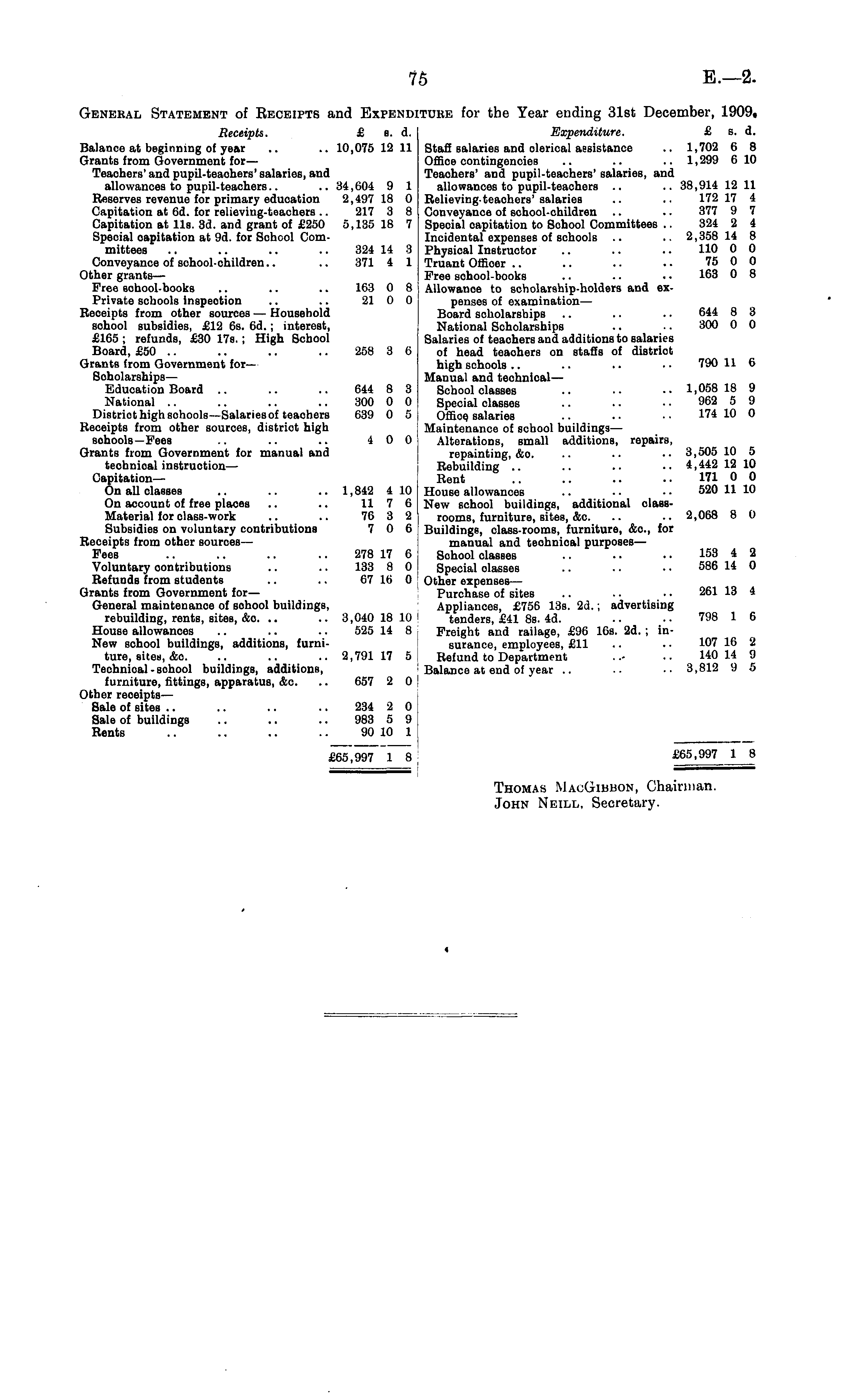 General Statement of Receipts and Expenditure for the Year ending 31st December, 1909, Receipts. £ c. d. Expenditure. £ s. d. Balance at beginning of year .. .. 10,075 12 11 Staff salaries and clerical assistance .. 1,702 6 8 Grants from Government for— Office contingencies .. .. .. 1,299 610 Teachers'and pupil-teachers'salarios, and Teachers' and pupil-teachers'salaries, and allowances to pupil-teachers.. .. 34,604 9 1 allowances to pupil-teachers .. .. 38,914 12 11 Reserves revenue for primary education 2,497 18 0 Relieving-teachers'salaries .. .. 172 17 4 Capitation at 6d. for relieving-teachers .. 217 3 8 Conveyance of school-children .. .. 377 9 7 Capitation at 11s. 3d. and grant of £250 5,135 18 7 Special capitation to School Committees .. 324 2 4 Special capitation at 9d. for School Com- Incidental expenses of schools .. .. 2,358 14 8 mittees .. .. .. .. 324 14 3 Physical Instructor .. .. .. 110 0 0 Conveyance of school-children.. .. 371 4 1 Truant Officer .. .. .. .• 75 0 0 Other grants— Free school-books .. .. .. 163 0 8 Free sohool-books .. .. .. 163 0 8 Allowanoe to scholarship-holders and exPrivate schools inspection .. .. 21 0 0 penses of examination— Receipts from other sources — Household Board scholarships .. .. .. 644 8 3 school subsidies, £12 6s. 6d. ; interest, National Scholarships .. •. 300 0 0 £165; refunds, £30 17s. ; High School Salaries of teachers and additions to salaries Board, £50 .. .. .. .. 258 3 6 of head teachers on staffs of district Grants from Government for— high schools .. .. .. •• 790 11 6 Scholarships— Manual and technicalEducation Board .. .. .. 644 8 3 School classes .. .. .. 1,058 18 9 National .. .. .. .. 300 0 0 Special classes .. .. • ■ 962 5 9 District high schools—Salariesof teachers 639 0 5 Office, salaries .. .. •• 174 10 0 Receipts from other sources, district high Maintenance of school buildings— sohools—Fees .. .. .. 4 0 0 Alterations, small additions, repairs, Grants from Government for manual and repainting, <feo. .. .. •• 3,505 10 5 technical instruction — Rebuilding .. .. .. •• 4,442 12 10 Capitation— Rent .. .. .. •• 171 0 0 On all classes .. .. .. 1,842 410 House allowances .. .. •• 520 1110 On account of free places .. .. 117 6 New school buildings, additional classMaterial for class-work .. .. 76 3 2 rooms, furniture, sites, &c. .. .. 2,068 8 0 Subsidies on voluntary contributions 7 0 6 Buildings, class-rooms, furniture, &c, for Receipts from other sources— manual and technical purposes— Fees .. .. .. .. 278 17 6 Sohool classes .. .. • ■ 153 4 2 Voluntary contributions .. .. 133 8 0 j Special olasses .. .. • ■ 586 14 0 Refunds from students .. .. 67 16 0 Other expenses— Grants from Government for — Purchase of sites .. .. .. 261 13 4 General maintenance of sohool buildings, Appliances, £756 13s. 2d.; advertising rebuilding, rents, sites, &o. .. .. 3,040 18 10' tenders, £41 Bs. 4d. .. ■■ 798 1 6 House allowances .. .. .. 525 14 8 Freight and railage, £96 16s. 2d. ; inNew school buildings, additions, furni- surance, employees, £11 .. • • 107 16 2 ture, sites, &c. .. .. .. 2,791 17 5 Refund to Department ..- .. 140 14 9 Technical-school buildings, additions, Balance at end of year .. .- •• 3,812 9 5 furniture, fittings, apparatus, &c. .. 657 2 0 Other receipts— Sale of sites .. .. .. .. 234 2 0 Sale of buildings .. .. .. 983 5 9 Rents .. .. .. .. 90 10 1 JE65~,997 1 8 £65,997 1 8 Thomas Mac Gibbon, Chairman. John Neill, Secretary.