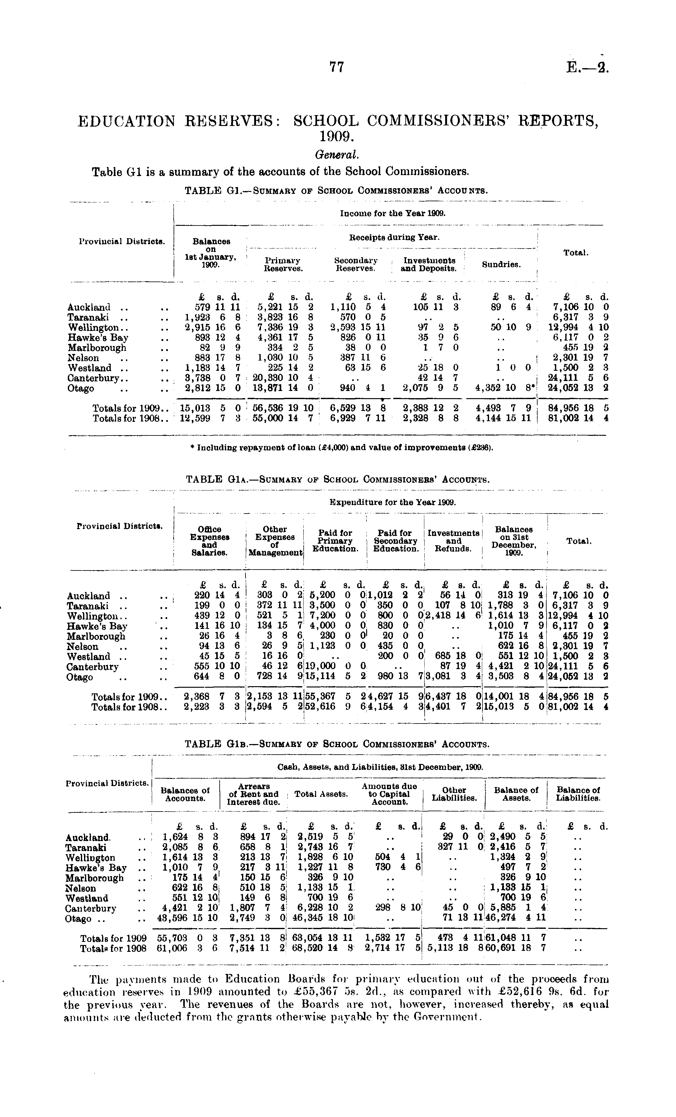 EDUCATION RESERVES: SCHOOL COMMISSIONERS' REPORTS, 1909. General. Table Gl is a summary of the accounts of the School Commissioners.