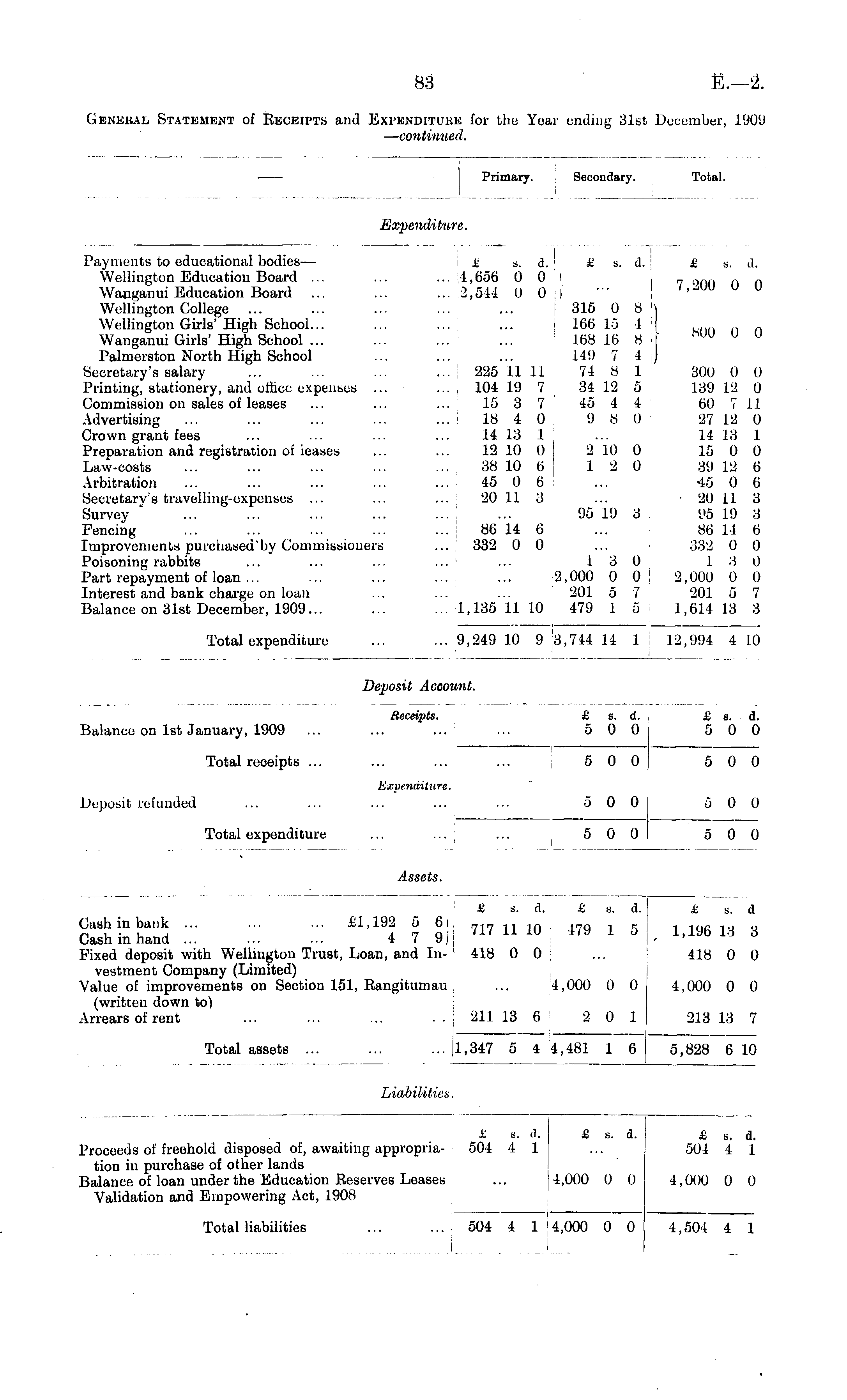Primary. Secondary. Total. Expenditure. Payments to educational bodies — £ s. d. j £ s. d. £ s. A. Wellington Education Board ... ... ... 4,656 0 0 ' , - 0( . . . Wanganui Education Board ... ... ...2,544 0 0 ij '" i,JJU u u Wellington College ... ... ... ... ... 815 0 8 | Wellington Girls'High School... ... ... ... 166 15 1 ' Wanganui Girls'High School ... ... ... ... 168 16 8 Palmerston North High School ... ... ... 1 19 7 4 J Secretary's salary ... ... ... ... 225 11 11 71 8 1 800 0 0 Printing, stationery, and office expenses ... ... 104 19 7 34 12 5 189 12 0 Commission on sales of leases ... ... ... 15 3 7 15 4 4 60 7 11 Advertising ... ... ... ... ... 18 4 0 9 8 0 27 12 0 Crown grant fees ... ... ... ... 14 13 1 ... 14 13 1 Preparation and registration of leases ... ... 12 10 0 2 10 0 15 0 0 Law-costs ... ... ... ... ... 38 10 6 12 0 39 12 6 Arbitration ... ... ... ... ... 45 0 6 ... 45 0 6 Secretary's travelling-expenses ... ... ... 20 11 3 ... 20 11 3 Survey * ... ... ... ... ... ... 95 19 3 95 19 3 Fencing ... ... ... ... ... 86 14 6 ... 86 II 6 Improvements purchased'by Commissioners ... 332 0 0 ... 332 0 0 Poisoning rabbits ... ... ... ... ... 130 130 Part repayment of loan ... ... ... ... ... 2,000 0 0 2,000 0 0 Interest and bank charge on loan ... ... ... 201 5 7 201 5 7 Balance on 31st December, 1909... ... ...1,135 1110 479 1 5 1,614 13 3 Total expenditure ... ...9,249 10 9 3,744 14 1 12,994 4 10 Deposit Account. Receipts. £ s. d. Balance on 1st January, 1909 ... ... ... ... 5 0 0 £ s. d. 5 0 0 Total receipts ... ... ... ... 500 5 0 0 5 0 0 Expenditure. 5 0 0 5 0 0 Deposit refunded ... ... ... ... ... 500 Total expenditure ... ... ... 500 5 0 0 5 0 0 Assets. £ s. A. £ s. d. £ s. d £1,192 5 6} 717 n 10 , 179 x 5 Cash in hand ... ... ... 4 7 91 j Fixed deposit with Wellington Trust, Loan, and In- 418 0 0 vestment Company (Limited) Value of improvements on Section 151, Rangitumau ... 1,000 0 0 (written down to) Arrears of rent ... ... ... 211 13 6 2 0 1 . Total assets ... ... ... 1,347 5 4 4,481 1 6 1,196 13 418 0 4,000 0 3 0 0 213 18 7 5,828 6 10 Liabilities. Proceeds of freehold disposed of, awaiting appropriation in purchase of other lands Balance of loan under the Education Reserves Leases Validation and Empowering Act, 1908 £ 504 S. (1. 4 1 £ s. d. 4,000 0 0 £ 501 4,000 s. d. 4 1 0 0 Total liabilities 504 4 1 4,000 0 0 4,504 4 1