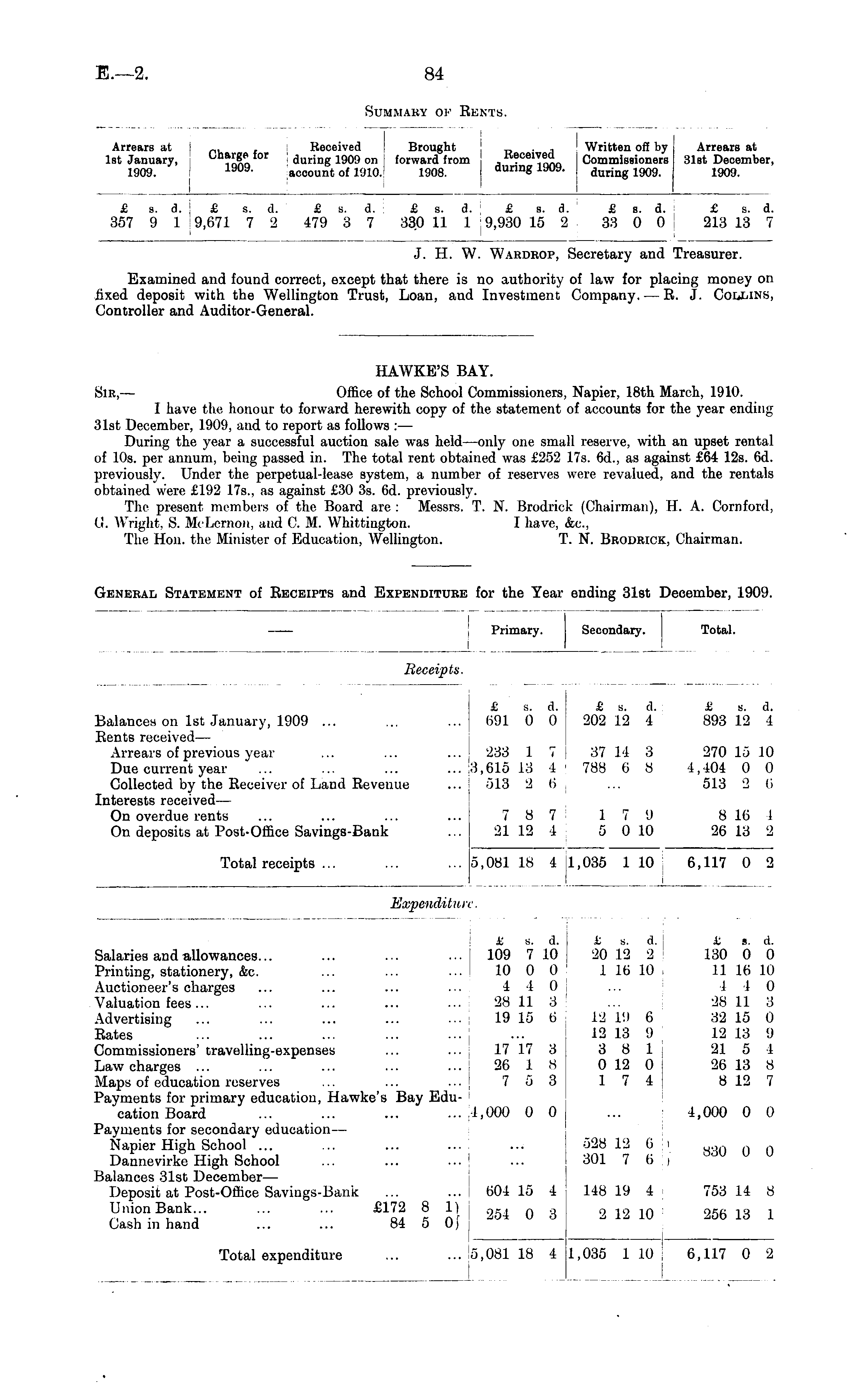 HAWKE'S BAY. Sir, — Office of the School Commissioners, Napier, 18th March, 1910. I have the honour to forward herewith copy of the statement of accounts for the year ending 31st December, 1909, and to report as follows : — During the year a successful auction sale was held—only one small reserve, with an upset rental of 10s. per annum, being passed in. The total rent obtained was £252 17s. 6d., as against £64 12s. 6d. previously. Under the perpetual-lease system, a number of reserves were revalued, and the rentals obtained were £192 175., as against £30 3s. 6d. previously. The present members of the Board are : Messrs. T. N. Biodrick (Chairman), H. A. Cornford, (i. Wright, 8. McLernon, and C. M. Whittington. I have, &c, The Hon. the Minister of Education, Wellington. T. N. Brodrick, Chairman.