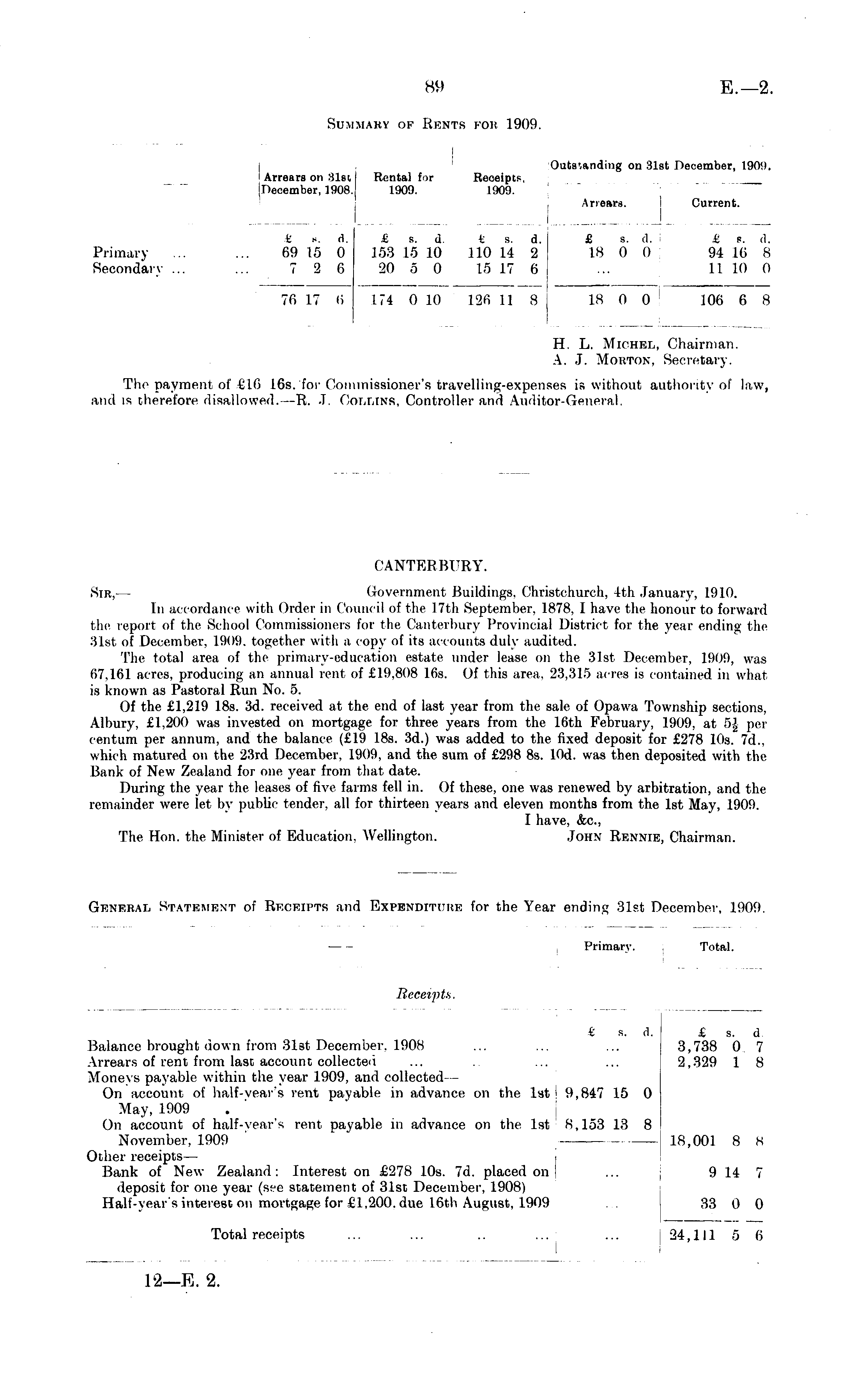 CANTERBURY. Sir, — Government Buildings, Christchurch, 4th January, 1910. In accordance wil b < brder in Council of the 17rh September, 1878, 1 have the honour to forward the report of the School Commissioners for the Canterbury Provincial District tor the year ending the 31st of December, 1909, together with a copy of its accounts duly audited. The total area of the primary-education estate under lease on the 31st December, 1909, was c>7. Mil acres, producing an annual rent of tlii.BoB 16s. Of this area, 23,315 acres is contained in what is known as Pastoral Run No. ">. Of the £1,219 18s. 3d. received at the end of last year from the sale of Opawa Township sections, Albury, £1,200 was invested on mortgage for three years from the 16th February, 1909, at 5j per centum per annum, and the balance (£lll 18s. 3d.) was added to the fixed deposit for £278 10s. 7d.. which matured on the 23rd December. 1909, and the sum of £298 Bs. 10d. was then deposited with the Bank of New Zealand for one year from that date. During the year the leases of five farms fell in. Of these, one was renewed by arbitration, and the remainder were let by public tender, all for thirteen years and eleven months from the Ist May, 1909. I have, &c, The Hon. the Minister of Education, Wellington. John Rennie, Chairman.