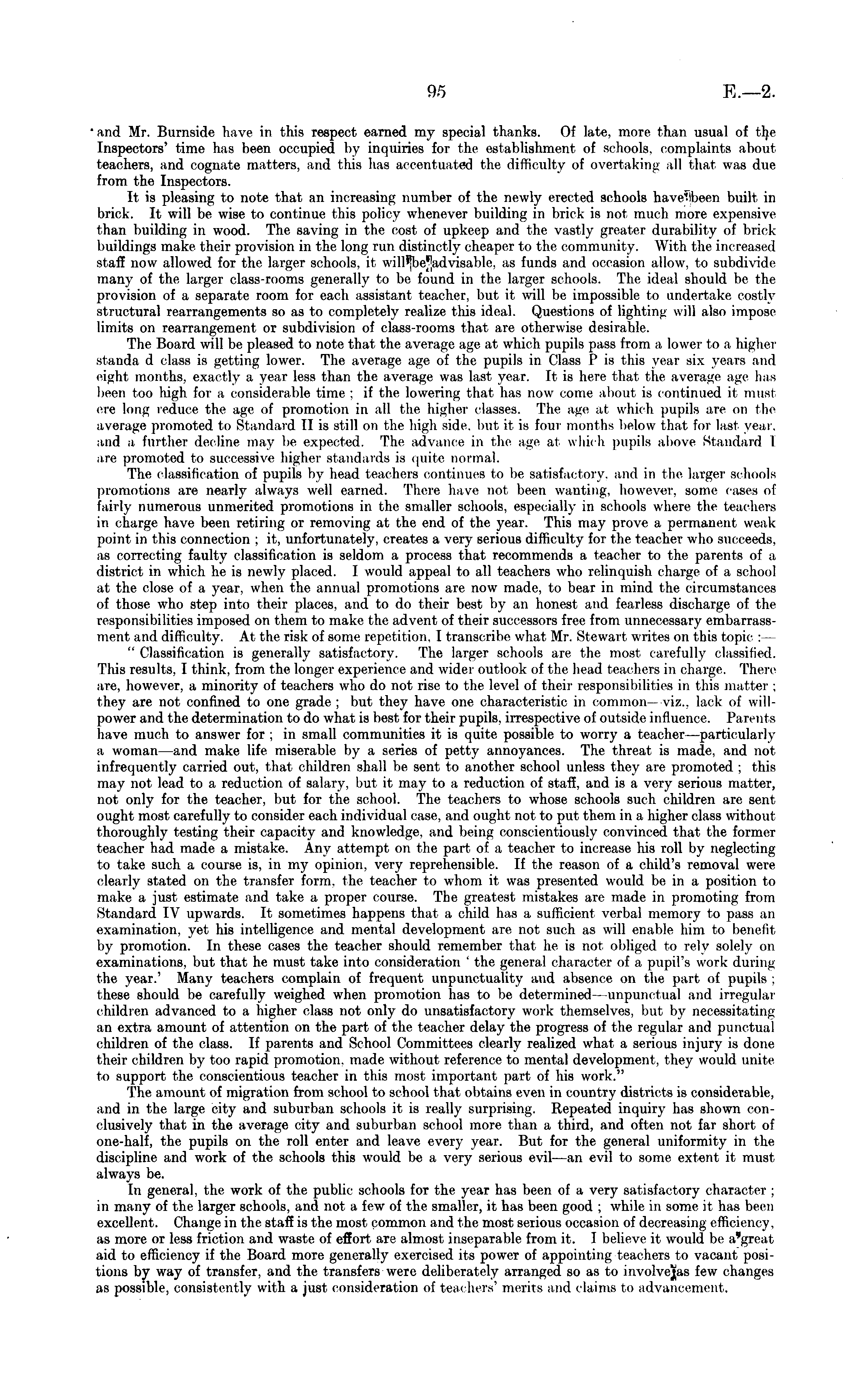 and Mr. Burnside have in this respect earned my special thanks. Of late, more than usual of the Inspectors' time has been occupied by inquiries for the establishment of schools, complaints about teachers, and cognate matters, and this has accentuated the difficulty of overtaking all that was due from the Inspectors. It is pleasing to note that an increasing number of the newly erected schools built in brick. It will be wise to continue this policy whenever building in brick is not much more expensive than building in wood. The saving in the cost of upkeep and the vastly greater durability of brick buildings make their provision in the long run distinctly cheaper to the community. With the increased staff now allowed for the larger schools, it willibejjadvisable, as funds and occasion allow, to subdivide many of the larger class-rooms generally to be found in the larger schools. The ideal should be the provision of a separate room for each assistant teacher, but it will be impossible to undertake costly structural rearrangements so as to completely realize this ideal. Questions of lighting will also impose limits on rearrangement or subdivision of class-rooms that are otherwise desirable. The Board will be pleased to note that the average age at which pupils pass from a lower to a higher stands d class is getting lower. The average age of the pupils in Class Pis this year six years and eight months, exactly a year less than the average was last year. It is here that the average age has been too high for a considerable time ; if the lowering thai has now come about is continued it must ere long reduce the age of promotion in all the higher classes. The age at which pupils are on the average promoted to Standard II is still on the high side, but it is four months below that for last year, and a, further decline may be expected. The advance in the age ai which pupils above Standard I are promoted to successive higher standards is quite normal. The classification of pupils by head teachers continues to be satisfactory, and in the larger schools promotions are nearly always well earned. There have not been wanting, however, some cases of fairly numerous unmerited promotions in the smaller schools, especially in schools where the teachers in charge have been retiring or removing at the end of the year. This may prove a permanent weak point in this connection : it, unfortunately, creates a very serious difficulty for the teacher who succeeds, as correcting faulty classification is seldom a process that recommends a teacher to the parents of a. district in which he is newly placed. I would appeal to all teachers who relinquish charge of a school at the close of a year, when the annual promotions are now made, to bear in mind the circumstances of those who step into their places, and to do their best by an honest and fearless discharge of the responsibilities imposed on them to make the advent of their successors free from unnecessary embarrassment and difficulty. At the risk of some repetition. I transcribe what Mr. Stewart writes on this topic : " Classification is generally satisfactory. The larger schools are the most carefully classified. This results, I think, from the longer experience and wider outlook of the head teachers in charge. There are, however, a minority of teachers who do not rise to the level of their responsibilities in this matter : they are not confined to one grade ; but they have one characteristic in common —viz., lack of will power and the determination to do what is best for their pupils, irrespective of outside influence. Parents have much to answer for ; in small communities it is quite possible to worry a teacher —particularly a woman —and make life miserable by a series of petty annoyances. The threat is made, and not infrequently carried out, that children shall be sent to another school unless they are promoted ; this may not lead to a reduction of salary, but it may to a reduction of staff, and is a very serious matter, not only for the teacher, but for the school. The teachers to whose schools such children are sent ought most carefully to consider each individual case, and ought not to put them in a higher class without thoroughly testing their capacity and knowledge, and being conscientiously convinced that the former teacher had made a mistake. Any attempt on the part of a teacher to increase his roll by neglecting to take such a course is, in my opinion, very reprehensible. If the reason of a child's removal were clearly stated on the transfer form, the teacher to whom it was presented would be in a position to make a just estimate and take a proper course. The greatest mistakes are made in promoting from Standard IV upwards. It sometimes happens that a child has a sufficient verbal memory to pass an examination, yet his intelligence and mental development are not such as will enable him to benefit by promotion. In these cases the teacher should remember that he is not obliged to rely solely on examinations, but that he must take into consideration ' the general character of a pupil's work during the year.' Many teachers complain of frequent unpunctuality and absence on the part of pupils : these should be carefully weighed when promotion has to be determined—unpunctual and irregular children advanced to a higher class not only do unsatisfactory work themselves, but by necessitating an extra amount of attention on the part of the teacher delay the progress of the regular and punctual children of the class. If parents and School Committees clearly realized what a serious injury is done their children by too rapid promotion, made without reference to mental development, they would unite to support the conscientious teacher in this most important part of his work." The amount of migration from school to school that obtains even in country districts is considerable, and in the large city and suburban schools it is really surprising. Repeated inquiry has 
