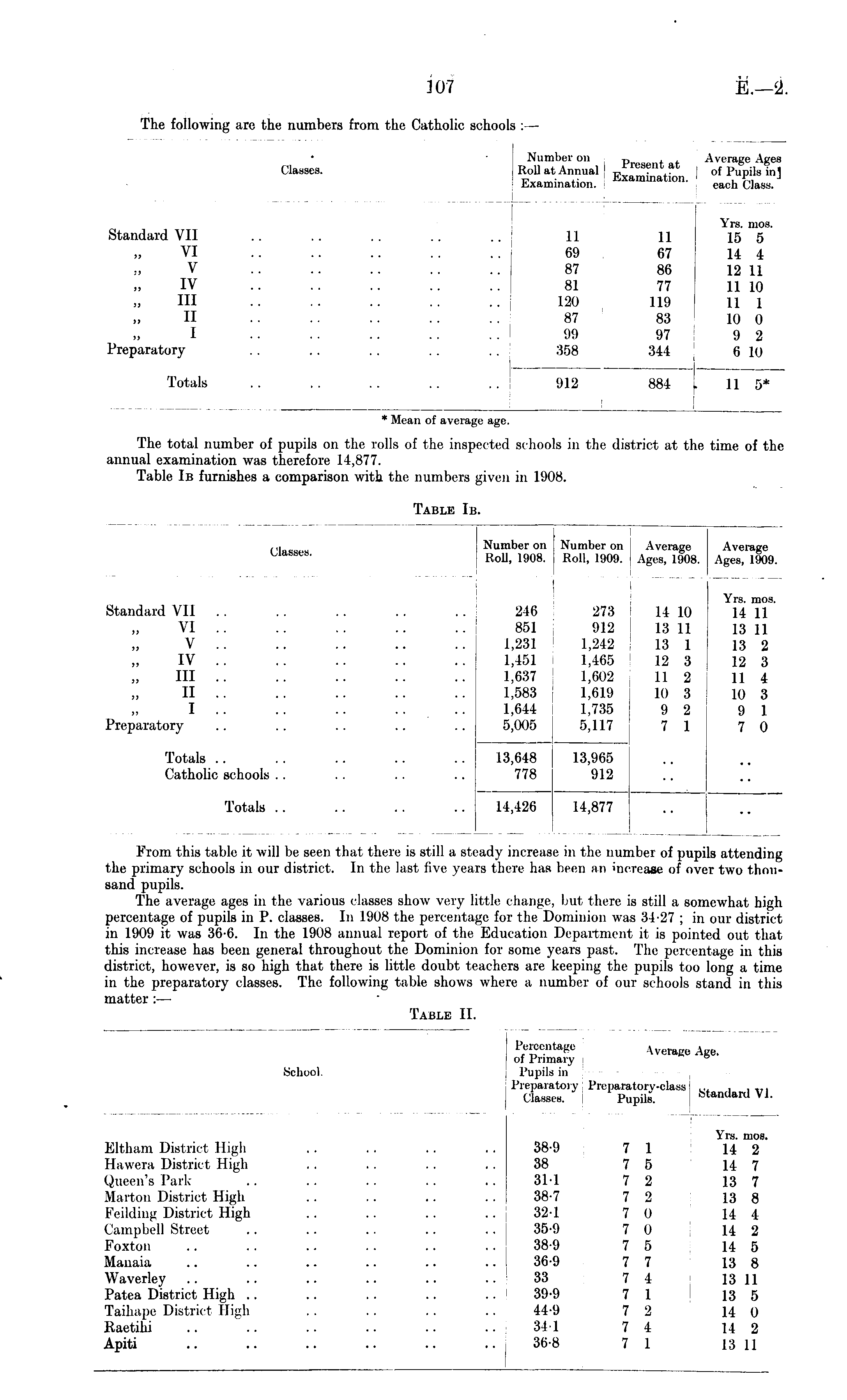 Classes. Number on Roll, 1908. Number on Roll, 1900. Average Ages, 1908. Average Ages, 1909. Standard VII .. VI .. V .. IV .. Ill .. II .. I .. 246 851 1,231 1,451 1,637 1,583 1,644 5,005 273 912 1,242 1,465 1,602 1,619 1,735 5,117 14 10 13 11 13 1 12 3 11 2 10 3 9 2 7 1 Yrs. mos. 14 11 13 11 13 2 12 3 11 4 10 3 9 1 7 0 Preparatory Totals .. Catholic schools . . 13,648 778 13,965 912 Totals .. 14,426 14,877