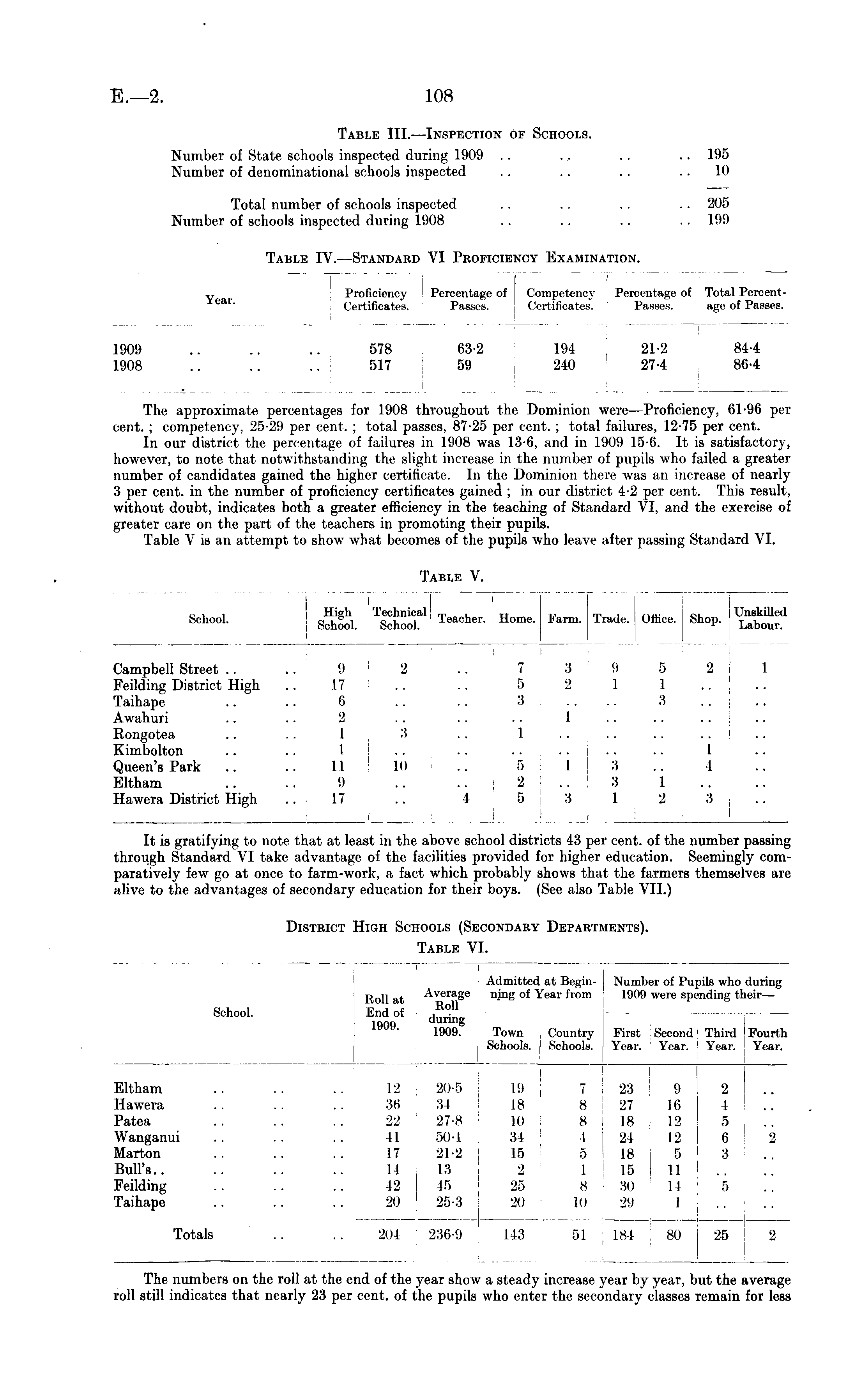 The approximate percentages for 1908 throughout the Dominion were —Proficiency, 61-96 per cent. ; competency, 25-29 per cent. ; total passes, 87-25 per cent. ; total failures, 12-75 per c«nt. In our district the percentage of failures in 1908 was 13-6, and in 1009 15-6. It is satisfactory, however, to note that notwithstanding the slight increase in the number of pupils who failed a greater number of candidates gained the higher certificate. In the Dominion there was an increase of nearly 3 per cent, in the number of proficiency certificates gained ; in our district 4-2 per cent. This result, without doubt, indicates both a greater efficiency in the teaching of Standard VI, and the exercise of greater care on the part of the teachers in promoting their pupils. Table V is an attempt to show what becomes of the pupils who leave after passing Standard VI.