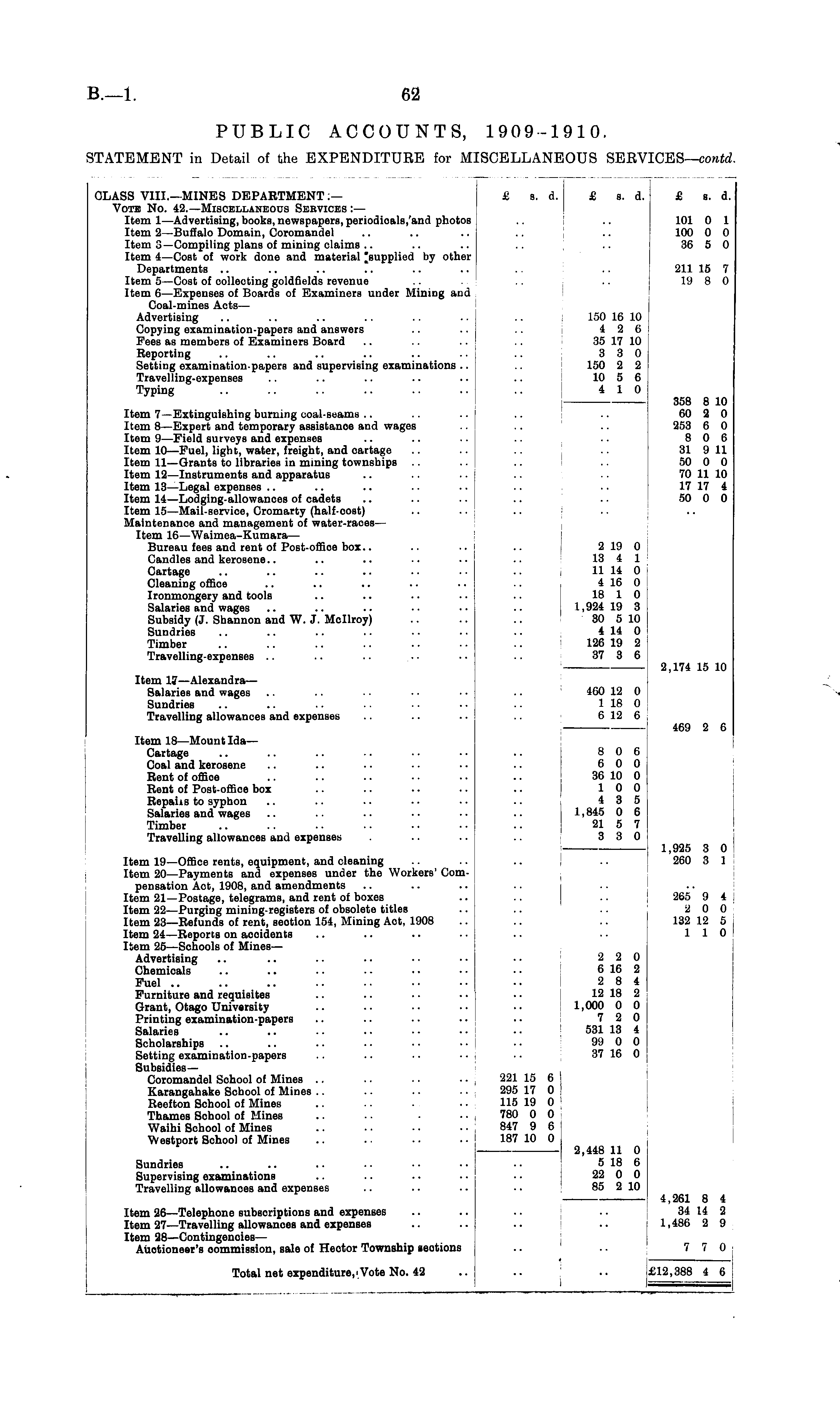 CLASS VIIL—MINES DEPARTMENT :— Vote No. 42.—Miscellaneous Services :— Item 1—Advertising, books, newspapers, periodioals/and photos Item 2—Buffalo Domain, Coromandel Item 3—Compiling plans of mining claims Item 4—Cost of work done and material "supplied by other Departments Item 5—Cost of collecting goldfields revenue Item 6 —Expenses of Boards of Examiners under Mining and Coal-mines Acts — Advertising Copying examination-papers and answers Fees as members of Examiners Board Reporting Setting examination-papers and supervising examinations .. Travelling-expenses Typing £ I s. d. £ s. d. £ s. d. 101 0 1 100 0 0 36 5 0 211 15 7 19 8 0 150 16 10 4 2 6 35 17 10 3 3 0 150 2 2 10 5 6 4 10 Item 7—Extinguishing burning coal-seams Item 8—Expert and temporary assistance and wages Item 9—Field surveys and expenses Item 10—Fuel, light, water, freight, and cartage Item 11 —Grants to libraries in mining townships Item 12—Instruments ana apparatus Item 13 —Legal expenses Item 14 —Lodging-allowances of cadets Item 15 —Mail-service, Cromarty (half-cost) Maintenance and management of water-raoes — Item 16 —Waimea-Kumara — Bureau fees and rent of Post-offioe box.. Candles and kerosene.. Cartage Cleaning office Ironmongery and tools Salaries and wages Subsidy (J. Shannon and W. J. Mcllroy) Sundries Timber Travelling-expenses 358 8 10 60 2 0 253 6 0 8 0 6 31 9 11 50 0 0 70 11 10 17 17 4 50 0 0 • • 2 19 0 13 4 1 11 14 0 4 16 0 18 1 0 1,924 19 3 30 5 10 4 14 0 126 19 2 37 3 6 Item 17 —Alexandra— Salaries and wages Sundries Travelling allowances and expenses 2,174 15 10 460 12 0 1 18 0 6 12 6 469 2 6 Item 18 —Mount Ida — Cartage Coal and kerosene Rent of offioe Rent of Post-office box Repaiis to syphon Salaries and wages Timber Travelling allowances and expenses 8 0 6 6 0 0 36 10 0 10 0 4 3 5 1,845 0 6 21 5 7 3 3 0 Item 19 —Office rents, equipment, and cleaning Item 20—Payments and expenses under the Workers' Compensation Act, 1908, and amendments Item 21—Postage, telegrams, and rent of boxes Item 22—Purging mining-registers of obsolete titles Item 23—Refunds of rent, seotion 154, Mining Act, 1908 Item 24 —Reports on acoidents Item 25 —Schools of Mines — Advertising Chemicals Fuel .. Furniture and requisites Grant, Otago University Printing examination-papers Salaries Scholarships Setting examination-papers Subsidies— Coromandel School of Mines Karangahake School of Mines Reefton School of Mines Thames School of Mines Waihi School of Mines Westport School of Mines 1,925 3 0 260 3 1 I 265 9 4 2 0 0 132 12 5 110 2 2 0 6 16 2 2 8 4 12 18 2 1,000 0 0 7 2 0 531 13 4 99 0 0 37 16 0 221 15 6 295 17 0 115 19 0 780 0 0 847 9 6 187 10 0 2,448 11 0 5 18 6 22 0 0 85 2 10 Sundries Supervising examinations Travelling allowances and expenses Item 26 —Telephone subscriptions and expenses Item 27 —Travelling allowances and expenses Item 28—Contingencies— Auctioneer's commission, sale of Hector Township seotions 4,261 8 4 34 14 2 1,486 2 9 Total net expenditure,! Vote No. 42 7 7 0 £12,388 4 6