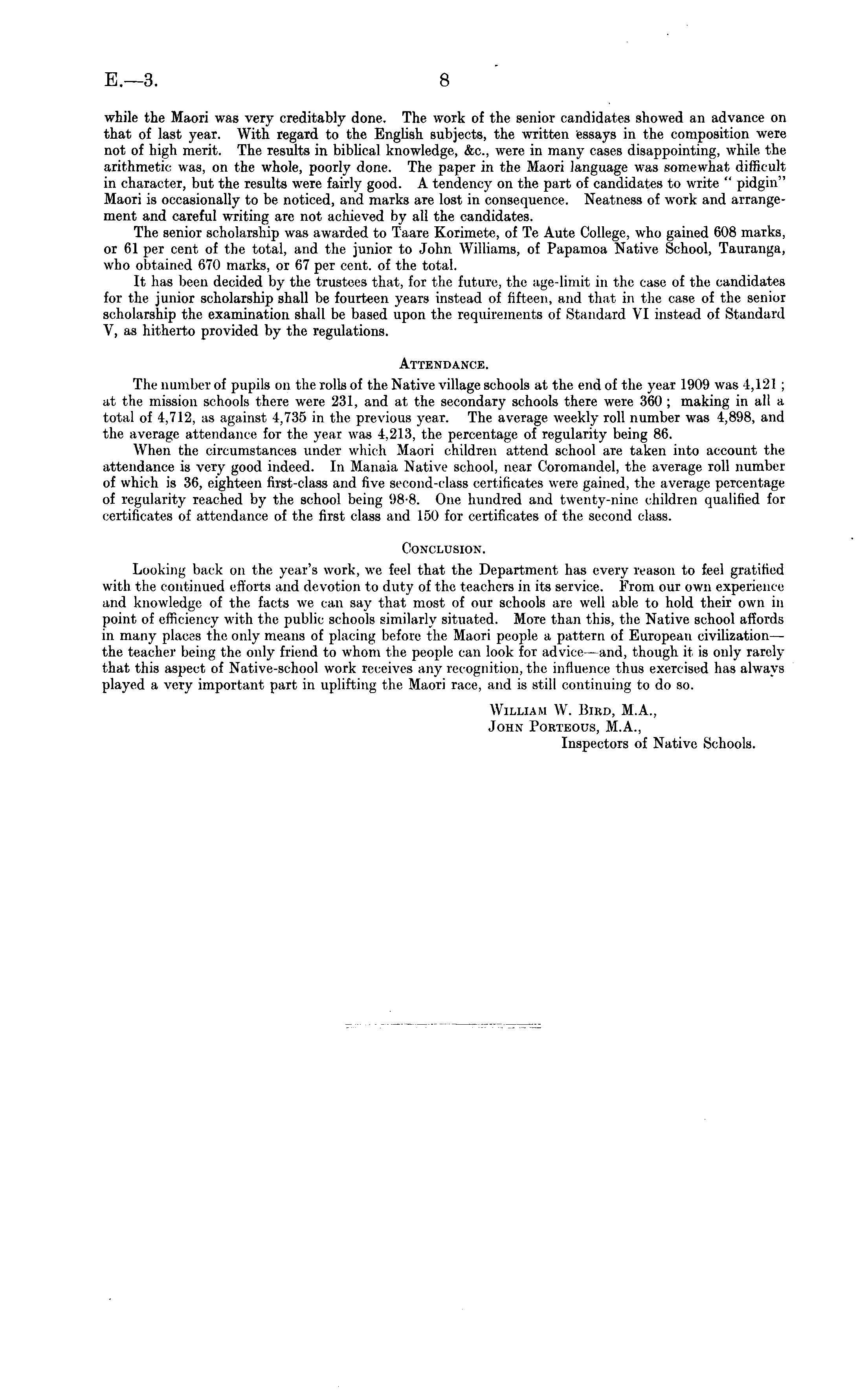 while the Maori was very creditably done. The work of the senior candidates showed an advance on that of last year. With regard to the English subjects, the written essays in the composition were not of high merit. The results in biblical knowledge, &c, were in many cases disappointing, while the arithmetic was, on the whole, poorly done. The paper in the Maori language was somewhat difficult in character, but the results were fairly good. A tendency on the part of candidates to write " pidgin" Maori is occasionally to be noticed, and marks are lost in consequence. Neatness of work and arrangement and careful writing arc not achieved by all the candidates. The senior scholarship was awarded to Taare Korimete, of Te Aute College, who gained 608 marks, or 61 per cent of the total, and the junior to John Williams, of Papamoa Native School, Tauranga, who obtained 670 marks, or 67 per cent, of the total. It has been decided by the trustees that, for the future, the age-limit in the case of the candidates for the junior scholarship shall be fourteen years instead of fifteen, and that in the case of the senior scholarship the examination shall be based upon the requirements of Standard VI instead of Standard V, as hitherto provided by the regulations. Attendance. The number of pupils on the rolls of the Native village schools at the end of the year 1909 was 4,121 ; at the mission schools there were 231, and at the secondary schools there were 360 ; making in all a total of 4,712, as against 4,735 in the previous year. The average weekly roll number was 4,898, and the average attendance for the year was 4,213, the percentage of regularity being 86. When the circumstances under which Maori children attend school are taken into account the attendance is very good indeed. In Manaia Native school, near Coromandel, the average roll number of which is 36, eighteen first-class and five second-class certificates were gained, the average percentage of regularity reached by the school being 98-8. One hundred and twenty-nine children qualified for certificates of attendance of the first class and 150 for certificates of the second class. Conclusion. Looking back on the year's work, we feel that the Department has every reason to feel gratified with the continued efforts and devotion to duty of the teachers in its service. From our own experience and knowledge of the facts we can say that most of our schools are well able to hold their own in point of efficiency with the public schools similarly situated. More than this, the Native school affords in many places the only means of placing before the Maori people a pattern of European civilization — t he teacher being I he only friend to whom the people can look for advice —and, though it is only rarely that this aspect of Native-school work receives any recognition,the influence thus exercised has always played a very important part in uplifting the Maori race, and is still continuing to do so. William W. Bird, M.A., John Porteous, M.A., Inspectors of Native Schools.