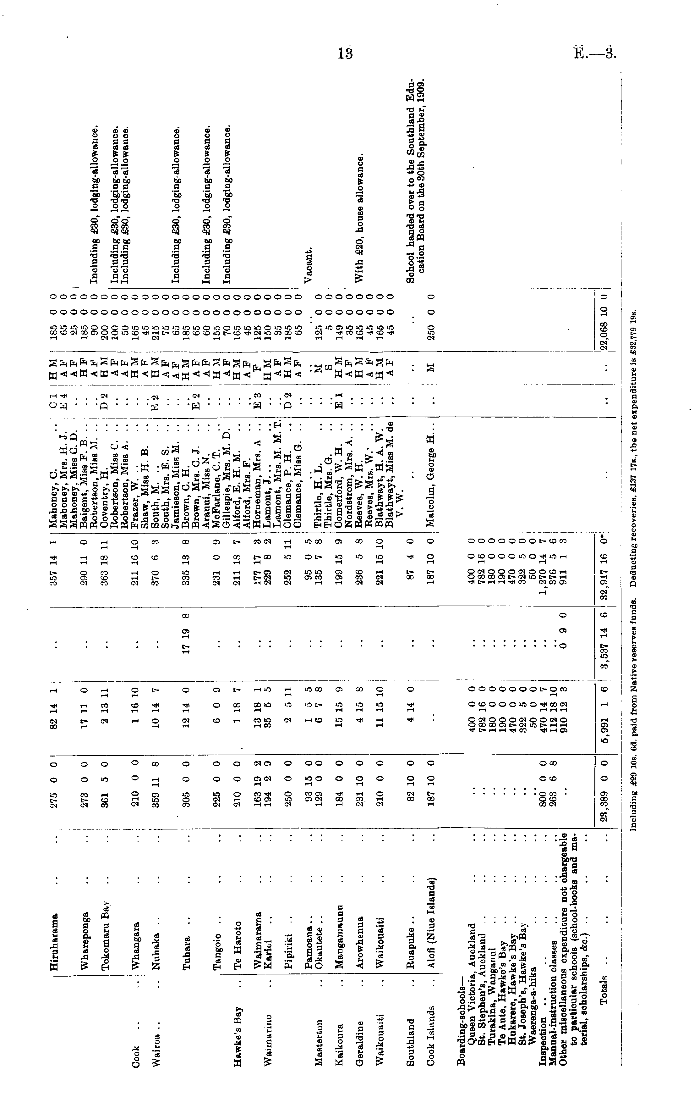 Hiruharama .. .. I 275 0 0 82 14 1 Mahoney, C. .. I Mahoney, Mrs. H. J. Mahoney, Miss C. D. Baigent, Miss F. B. .. j Robertson, Miss M. .. Coventry, H. Robertson, Miss 0. .. Robertson, Miss A. Frazer, W. .. Shaw, Miss H. B. South, M. .. South, Mrs. E. S. Jamieson, Miss M. .. Brown, C. H. Brown, Mrs. C. J. Aranui, Miss N. McFarlane, C. T. Gillespie, Mrs. M. D. Alford, E. H. M. Alford, Mrs. F. Horneman, Mrs. A .. Lamont, J. .. Lamont, Mrs. M. M. T. Clemance, P. H. Clemance, Miss G. .. E4 : .... Whareponga Tokomaru Bay .. Cook .. .. I Whangara .. .. i Wairoa .. .. Nuhaka Tuhara 273 0 0 361 5 0 210 0 0 359 11 8 305 0 0 17 11 0 2 13 11 1 16 10 10 14 7 12 14 0 17 19 8 290 11 0 Baige Kobei 363 18 11 Cover Robei Robei 211 1G 10 Fraze bhaw 370 6 8 Soutl: Soutt Jamil 335 13 8 Brow Browi ent, Mis irtson, J\ ntry, H irtson, 5 irtson, 5 er, W. . v Afica 1 r, Miss J h, M. . h, Mrs. ieson, M m, C. H m, Mrs. . Da .. E2 •• A F AF HF AF H M AF A F H M A F H M A F A F H M AF AF H M AF H M AF F H M AF H M A F 65 0 0 25 0 0 185 0 0 90 0 0 200 0 0 100 0 0 50 0 0 165 0 0 45 0 0 215 0 0 75 0 0 65 0 0 185 0 0 65 0 0 60 0 0 155 0 0 70 0 0 1G5 0 0 45 0 0 125 0 0 150 0 0 35 0 0 185 0 0 65 0 0 Including £30, lodging-allowance. Including £30, lodging-allowance. Including £30, lodging-allowance. Including £30, lodging-allowance. E 2 l Including £30, lodging-allowanoe. Tangoio 225 0 0 6 0 9 Aram 231 0 9 McFa ftillac mi, Miss arlane, i nnift ATi •• Including £30, lodging-allowance. Hawke's Bay .. Te Haroto 210 0 0 1 18 7 unlet 211 IS 7 Alforc Alfort spie, Mi d, E. H •d. Mrs - Waimarama Waimarino .. Karioi 163 19 2 194 2 9 13 18 1 35 5 5 Alton 177 17 3 Horn. 229 8 2 Lame TiA.TYH •a, Mrs. leman, ] ont, J. . iont. Mr E3 I Vacant. Pipiriki .. .. 250 0 0 2 5 11 Li ami 252 5 11 Clemi P.lftmi iont, Mr lance, P in.nc.ft A1 D*a Pamoana Masterton .. Okautete 93 15 0 129 0 0 1 5 5 6 7 8 Ulerni 95 0 5 135 7 8 Thirt Thirt Thirtle, H. L. Thirtle, Mrs. G. Comerford, W. H. .. Nordstrom, Mrs. A. .. Reeves, W. H. Reeves, Mrs. W.' Blathwayt, H. A. W. Blathwayt, Miss M. de V. W. iance, jw tie, H. I hlfi. Mrs M S HM AF H M A F H M AF 125 0 0 5 0 0 149 0 0 35 0 0 165 0 0 45 0 0 165 0 0 45 0 0 Kaikoura .. Mangamaunu 184 0 0 15 15 9 199 15 9 Come Nnrdf tie, Mrs. erford, > El With £20, house allowance. Geraldine .. Arowhenua 231 10 0 4 15 8 riorai 236 5 8 Reev< istrom, ■es, W. ] Waikouaiti .. Waikouaiti .. 210 0 0 11 15 10 ±teevi 221 15 10 Blath Blatr. 'es, Mrs, hwayt, ] hwayt, I " I Southland .. Ruapuke 82 10 0 4 14 0 V. 87 4 0 W. Sohool handed over to the Southland Education Board on the 30th September, 1909. Cook Islands .. Alofi (Niue Islands) 187 10 0 j 187 10 0 Malci Malcolm, George H... :olm, G< M 250 0 0 Boarding-schools — Queen Victoria, Auckland St. Stephen's, Auckland Turakina, Wanganui Te Aute, Hawke's Bay Hukarere, Hawke's Bay .. St. Joseph's, Hawke's Bay Waerenga-a-hika Inspection Manual-instruction classes Other miscellaneous expenditure not chargeable to particular schools (school-books and material, scholarships, &c.) - " 400 0 0 782 16 0 180 0 0 190 0 0 470 0 0 322 5 0 50 0 0 470 14 7 112 18 10 910 12 3 09 0 400 0 0 782 16 0 180 0 0 190 0 0 470 0 0 322 5 0 50 0 0 1,270 14 7 376 5 6 911 1 3 800 0 0 263 6 8 23,389 0 0 33,917 16 0* 22,068 10 0 Totals .. 5,991 1 6 3,537 14 6 Includini £29 10s. 6d. -aid from Native reserves funds. Deductini recoveries, £137 17s., the net ex] .enditure is £32,779 19s.