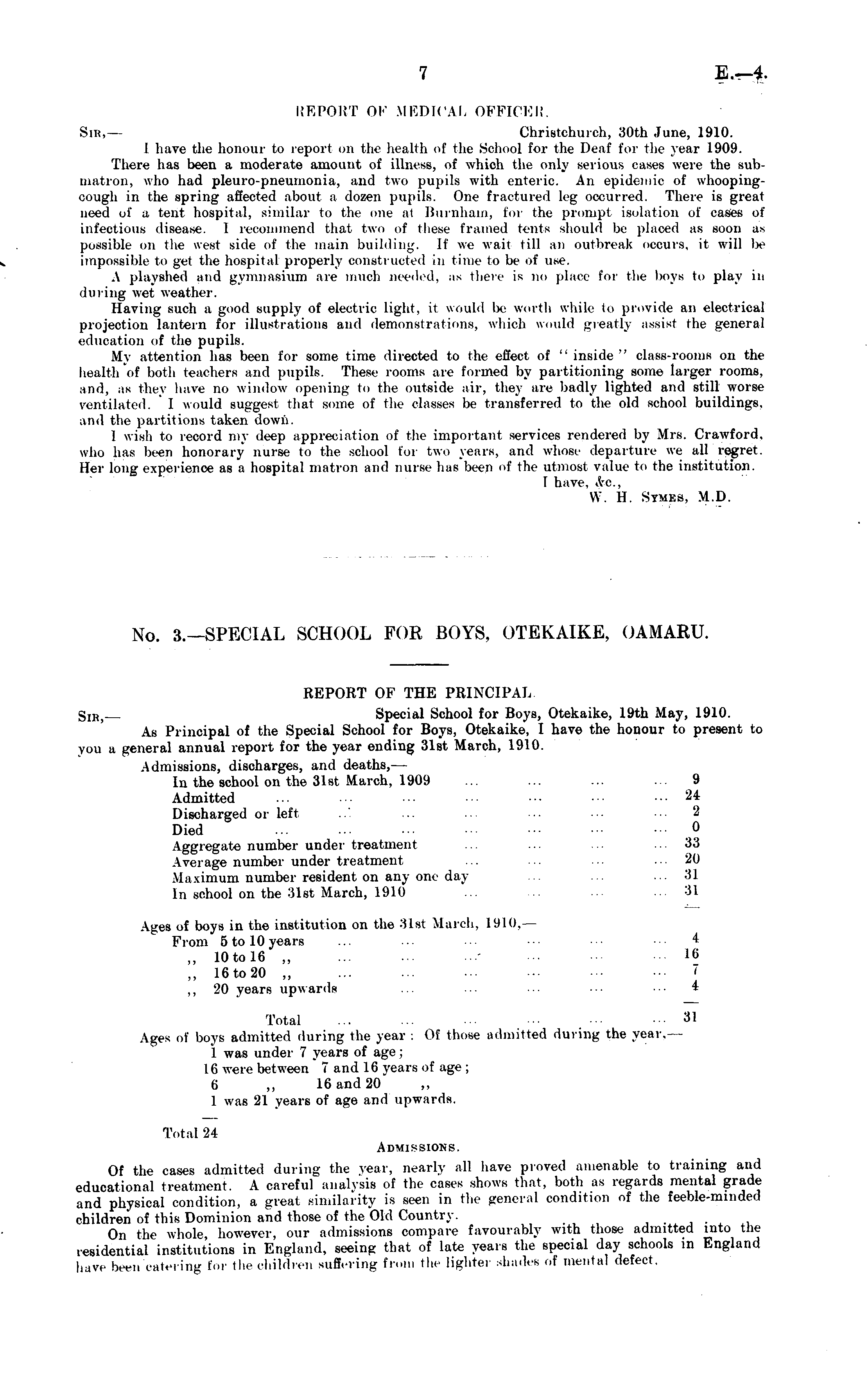 REPORT OK MEDICAL OFFICER, Sir, Christchurch, 30th June, 1910. I have the honour to report on the health of the Sohool for the Deaf for the year 1909. There has been a moderate amount of illness, of which the only serious oases were the subtnatron, who had pleuro-pneumonia, and two pupils with enteric. An epidemic of whoopingcough in the spring affected about a dozen pupils. One fractured leg occurred. There is great need of a tent hospital, similar to the one at Burnham, for the prompi isolation of cases of infectious disease. 1 recommend that two of these framed tents should be placed as soon as possible on ihe west side of the main building. If we wait till an outbreak occurs, it will be impossible to get the hospital properly constructed in time to be of use. A playshed and gymnasium are much needed, as there is no place for the boys to play in (luring wet weather. Haying such a good supply of electric light, it would Ik- worth while to provide an electrical projection lantern for illustrations and demonstrations, which would greatly assist the general educalion of the pupils. My attention has been for some time directed to the effect of " inside " class-rooms on the health of both teachers and pupils. These rooms are formed by partitioning some larger rooms, and, as they have no window opening to the outside air, they are badly lighted and still worse ventilated. 1 would suggest that some of the classes be transferred to the old school buildings, and the partitions taken down. I wish to record my deep appreciation of the important services rendered by Mrs. Crawford, who has been honorary nurse to the school for two years, and whose departure we all regret. Her long experience as a hospital matron and nurse has been of the utmost value to the institution. 1 have, itc, W. LI. SlMps, M.D.