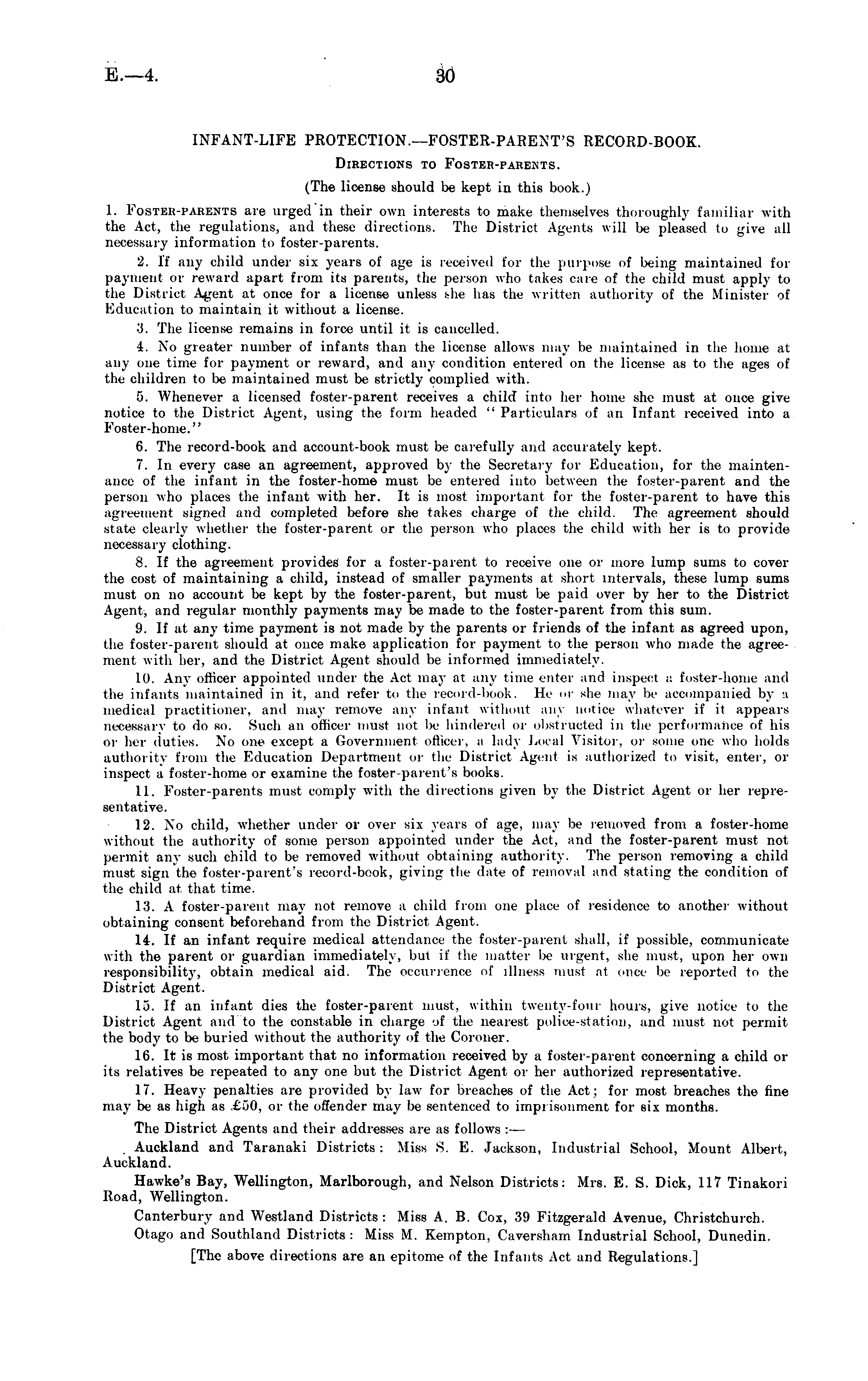 INFANT-LIFE PROTECTION.—FOSTER-PARENT'S RECORD-BOOK. Directions to Foster-parents. (The license should be kept in this book.) 1. Foster-parents are urged in their own interests to make themselves thoroughly familiar with the Act, the regulations, and these directions. The District Agents will be pleased to give all necessary information to foster-parents. 2. If any child under six years of age is received for the purpose of being maintained for payment or reward apart from its parents, the person who takes care of the child must apply to the District Agent at once for a license unless she has the written authority of the Minister of Education to maintain it without a license. 3. The license remains in force until it is cancelled. 4. No greater number of infants than the license allows may be maintained in the home at any one time for payment or reward, and any condition entered on the license as to the ages of the children to be maintained must be strictly complied with. 5. Whenever a licensed foster-parent receives a child into her home she must at once give notice to the District Agent, using the form headed " Particulars of an Infant received into a Foster-home." 6. The record-book and account-book must be carefully and accurately kept. 7. In every case an agreement, approved by the Secretary for Education, for the maintenance of the infant in the foster-home must be entered into between the foster-parent and the person who places the infant with her. It is most important for the foster-parent to have this agreement signed and completed before she takes charge of the child. The agreement should state clearly whether the foster-parent or the person who places the child with her is to provide necessary clothing. 8. If the agreement provides for a foster-parent to receive one or more lump sums to cover the cost of maintaining a child, instead of smaller payments at short intervals, these lump sums must on no account be kept by the foster-parent, but must be paid over by her to the District Agent, and regular monthly payments may be made to the foster-parent from this sum. 9. If at any time payment is not made by the parents or friends of the infant as agreed upon, the foster-parent should at once make application for payment to the person who made the agreement with her, and the District Agent should be informed immediately. 10. Any officer appointed under the Act may at any time enter and inspect a foster-home and the infants maintained in it, and refer to the record-book. He or ehe may lie accompanied by i medical practitioner, and may remove any infant wit limit any notice whatever if it appears necessary to do so. Such an officer must not lie hindered or obstructed in the performance of his or her duties. No one except a Government officer, a lady Local Visitor, or some one who holds authority from the Education Department or the District Agent is authorized to visit, enter, or inspect a foster-home or examine the foster-parent's hooks. 11. Foster-parents must comply with the directions given by the District Agent or her representative. 12. No child, whether under or over six years of age. may lie removed from a foster-home without the authority of some person appointed under the Act, and the foster-parent must not permit any such child to be removed without obtaining authority. The person removing a child must sign the foster-parent's record-book, giving the date of removal and stating the condition of the child at that time. 13. A foster-parent may not remove a child from one place of residence to another without obtaining consent beforehand from the District Agent. 14. If an infant require medical attendance the foster-parent shall, if possible, communicate with the parent or guardian immediately, but if the matter l>e urgent, she must, upon her own responsibility, obtain medical aid. The occurrence of illness must at once he reported to the District Agent. 10. If an infant dies the foster-parent must, within twenty-four hours, give notice to the District Agent and to the constable in charge 'if the nearest police-station, ami must not permit the body to be buried without the authority of the Coroner. 16. It is most important that no information received by a foster-parent concerning a child or its relatives be repeated to any one but the District Agent or her authorized representative. 17. Heavy penalties are provided by law for breaches of the Act: for most breaches the tine may be as high as £50, or the offender may be sentenced to imprisonment for six months. The District Agents and their addresses are as follows :— Auckland and Taranaki Districts : Miss S. E. Jackson, Industrial School, Mount Albert, Auckland. Hawke's Bay, Wellington, Marlborough, and Nelson Districts: Mrs. E. S. Dick, 117 Tinakori Road, Wellington. Canterbury and Westland Districts: Miss A. B. Cox, 39 Fitzgerald Avenue, Christchurch. Otago and Southland Districts : Miss M. Kempton, Caversham Industrial School, Dunedin. [The above directions are an epitome of the Infants Act and Regulations.]