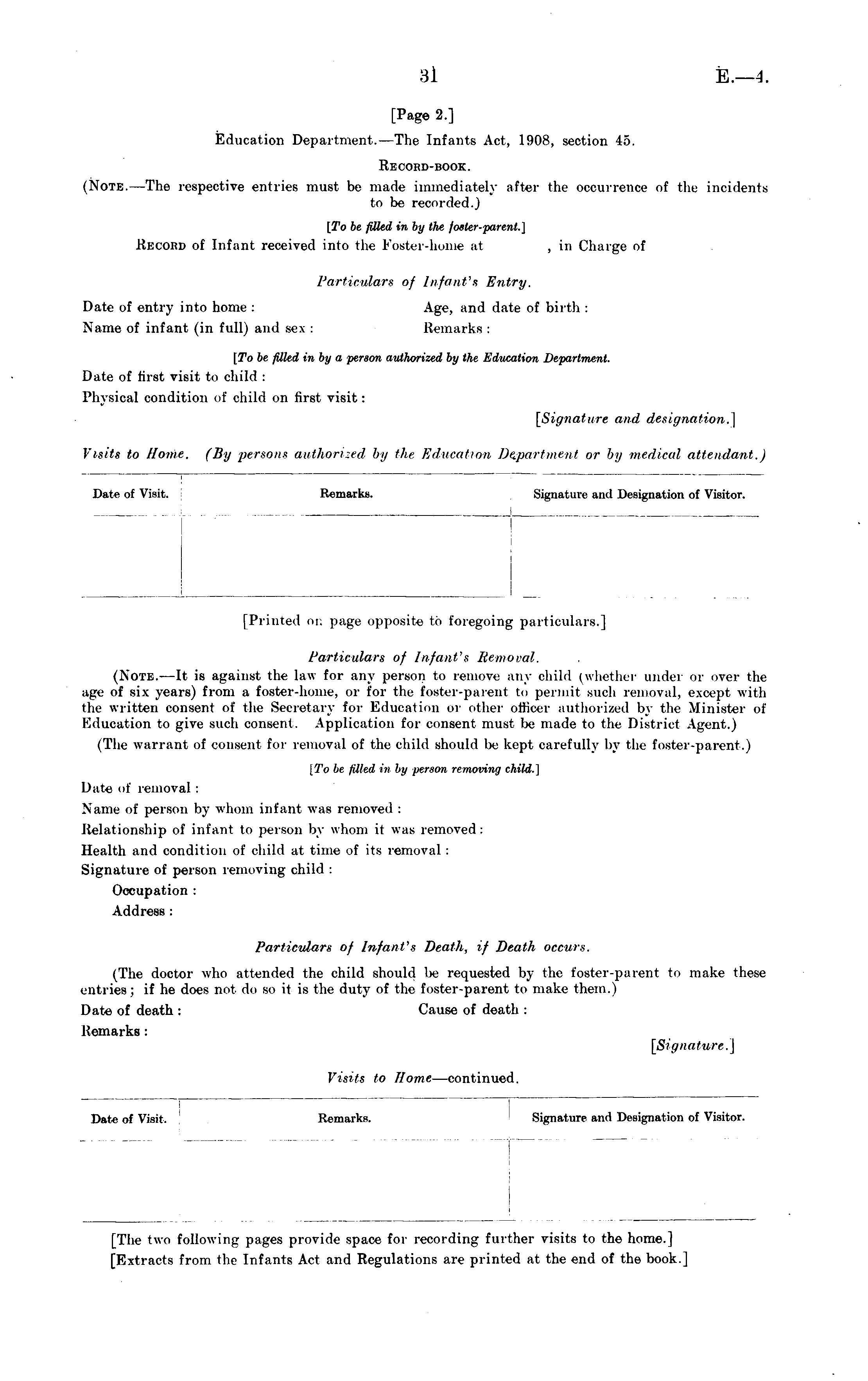 [Page 2.] Education Department.—The Infants Act, 1908, section 45. Record-book. (Note. —The respective entries must be made immediately after the occurrence of the incidents to be recorded.) [To be filled in by the foster-parent.] Record of Infant received into the Foster-home at , in Charge of Particular* nf Infant , a Entry. Date of entry into home : Age, and date of birth : Name of infant (in full) and sex : Remarks : [To be filled in by a person authorized by the Education Department. Date of first visit to child : Physical condition of child on first visit: [Signature and designation.] I'nits to Home. (By persona authorized by the Education Department or by medical attendant.) Date of Visit. Remarks. Signature and Designation of Visitor. [Printed or. page opposite to foregoing particulars.] Particulars of Infant's Removal. (Note. —It is against the law for any person to re ye any child (whether under or over the age of six years) from a foster-home, or for the foster-parent to permit such removal, except with the written consent of the Secretary for Education or other officer authorized by the Minister of Education to give such consent. Application for consent must l>e made to the District Agent.) (The warrant of consent for removal of the child should be kept carefully by the foster-parent.) [To be filled in by person removing child.} Date of removal : Name of person by whom infant was removed : Relationship of infant to person by whom it was removed: Health and condition of child at time of its removal: Signature of person removing child : Occupation : Address : Particulars of Infant's Death, if Death occurs. (The doctor who attended the child should be requested by the foster-parent to make these entries; if he does not do so it is the duty of the foster-parent to make them.) Date of death : Cause of death : Remarks : [Signature.] Visits to Home —continued. Date of Visit. Remarks. Signature and Designation of Visitor. [The two following pages provide space for recording further visits to the home.] [Extracts from the Infants Act and Regulations are printed at the end of the book.]
