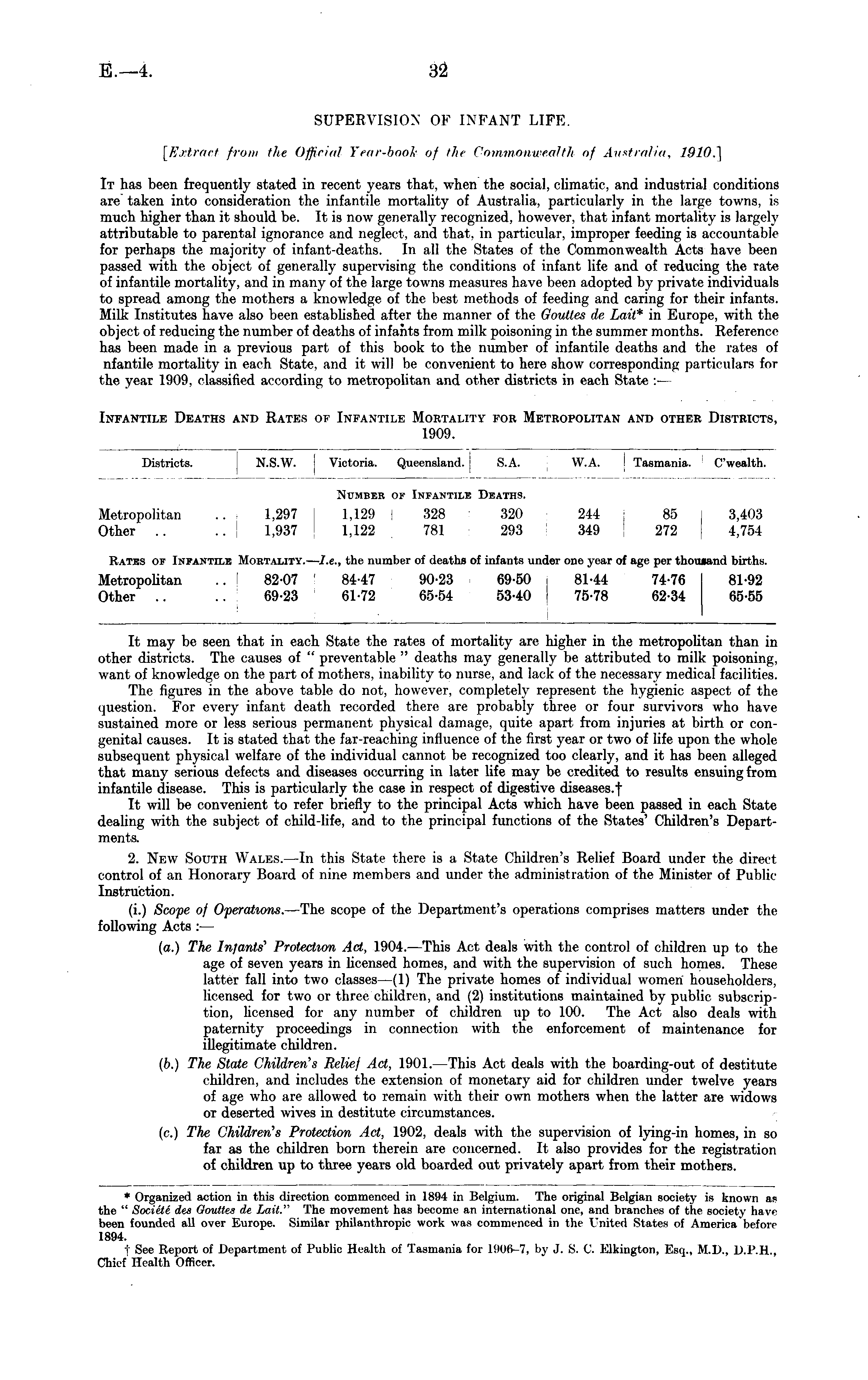 SUPERVISION OF INFANT LIFE. [Extract from the Offirial Tear-booh of the Commonwealth of Australia, J910.] It has been frequently stated in recent years that, when the social, climatic, and industrial conditions are taken into consideration the infantile mortality of Australia, particularly in the large towns, is much higher than it should be. It is now generally recognized, however, that infant mortality is largely attributable to parental ignorance and negled. and that, in particular, improper feeding is accountable for perhaps the majority of infant-deaths. In all the States of the Commonwealth Acts have been passed with the object of generally supervising the conditions of infant life and of reducing the rate of infantile mortality, and in many of the large towns measures have been adopted by private individuals to spread among the mothers a knowledge of the best methods of feeding and caring for their infants. Milk Institutes have also been established after the manner of the Gouttes de Lait* in Europe, with the object of reducing the number of deaths of infants from milk poisoning in the summer months. Reference has been made in a previous part of this book to the number of infantile deaths and the rates of nfantile mortality in each State, and it will be convenient to here show corresponding particulars for the year 1909, classified according to metropolitan and other districts in each State : —