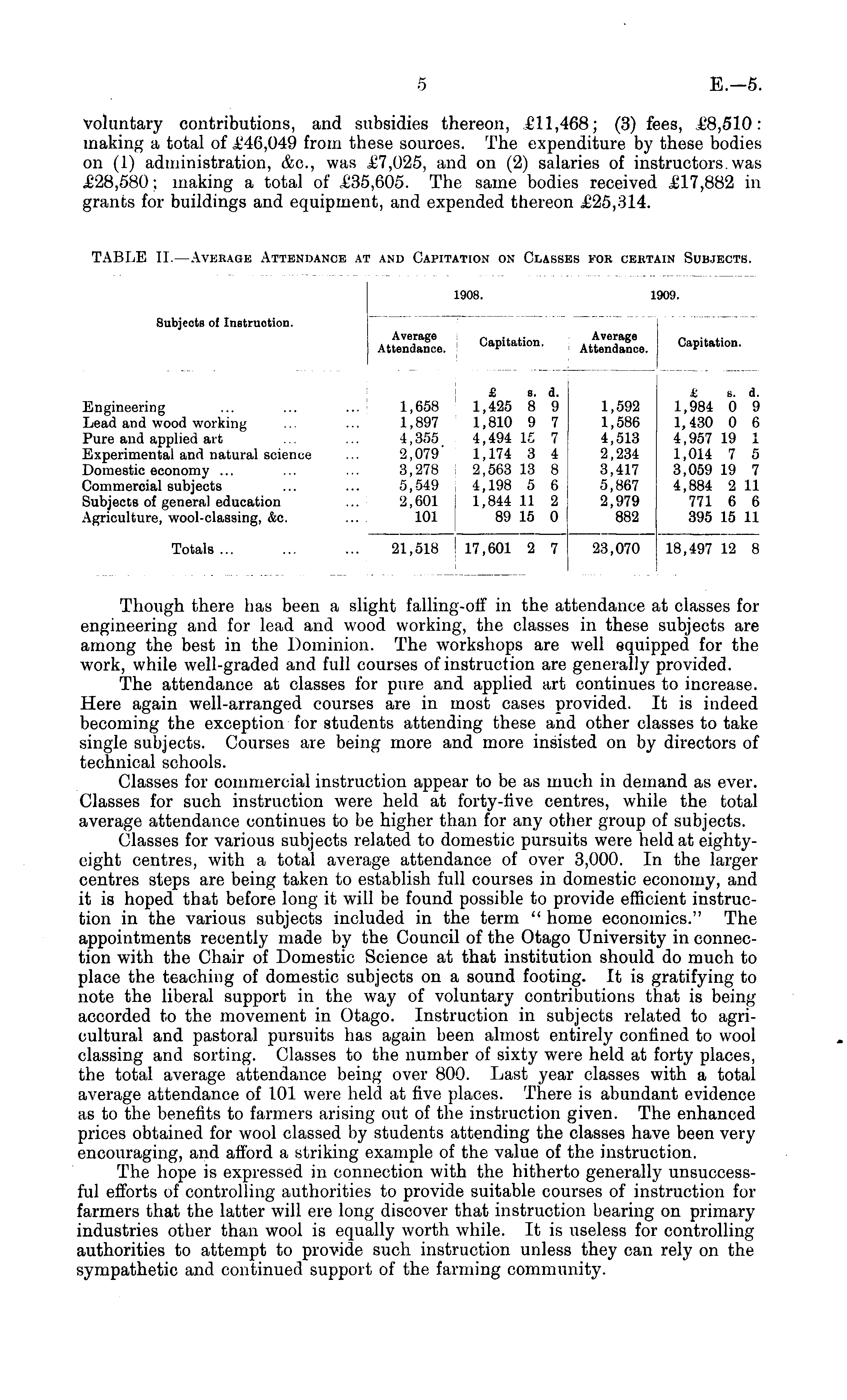 Though there has been a slight falling-off in the attendance at classes for engineering and for lead and wood working, the classes in these subjects are among the best in the Dominion. The workshops are well equipped for the work, while well-graded and full courses of instruction are generally provided. The attendance at classes for pure and applied art continues to increase. Here again well-arranged courses are in most cases provided. It is indeed becoming the exception for students attending these and other classes to take single subjects. Courses are being more and more insisted on by directors of technical schools. Classes for commercial instruction appear to be as much in demand as ever. Classes for such instruction were held at forty-five centres, while the total average attendance continues to be higher than for any other group of subjects. Classes for various subjects related to domestic pursuits were held at eightyeight centres, with a total average attendance of over 3,000. In the larger centres steps are being taken to establish full courses in domestic economy, and it is hoped that before long it will be found possible to provide efficient instruction in the various subjects included in the term " home economics." The appointments recently made by the Council of the Otago University in connection with the Chair of Domestic Science at that institution should do much to place the teaching of domestic subjects on a sound footing. It is gratifying to note the liberal support in the way of voluntary contributions that is being accorded to the movement in Otago. Instruction in subjects related to agricultural and pastoral pursuits has again been almost entirely confined to wool classing and sorting. Classes to the number of sixty were held at forty places, the total average attendance being over 800. Last year classes with a total average attendance of 101 were held at five places. There is abundant evidence as to the benefits to farmers arising out of the instruction given. The enhanced prices obtained for wool classed by students attending the classes have been very encouraging, and afford a striking example of the value of the instruction. The hope is expressed in connection with the hitherto generally unsuccessful efforts of controlling authorities to provide suitable courses of instruction for farmers that the latter will ere long discover that instruction bearing on primary industries other than wool is equally worth while. It is useless for controlling authorities to attempt to provide such instruction unless they can rely on the sympathetic and continued support of the farming community.