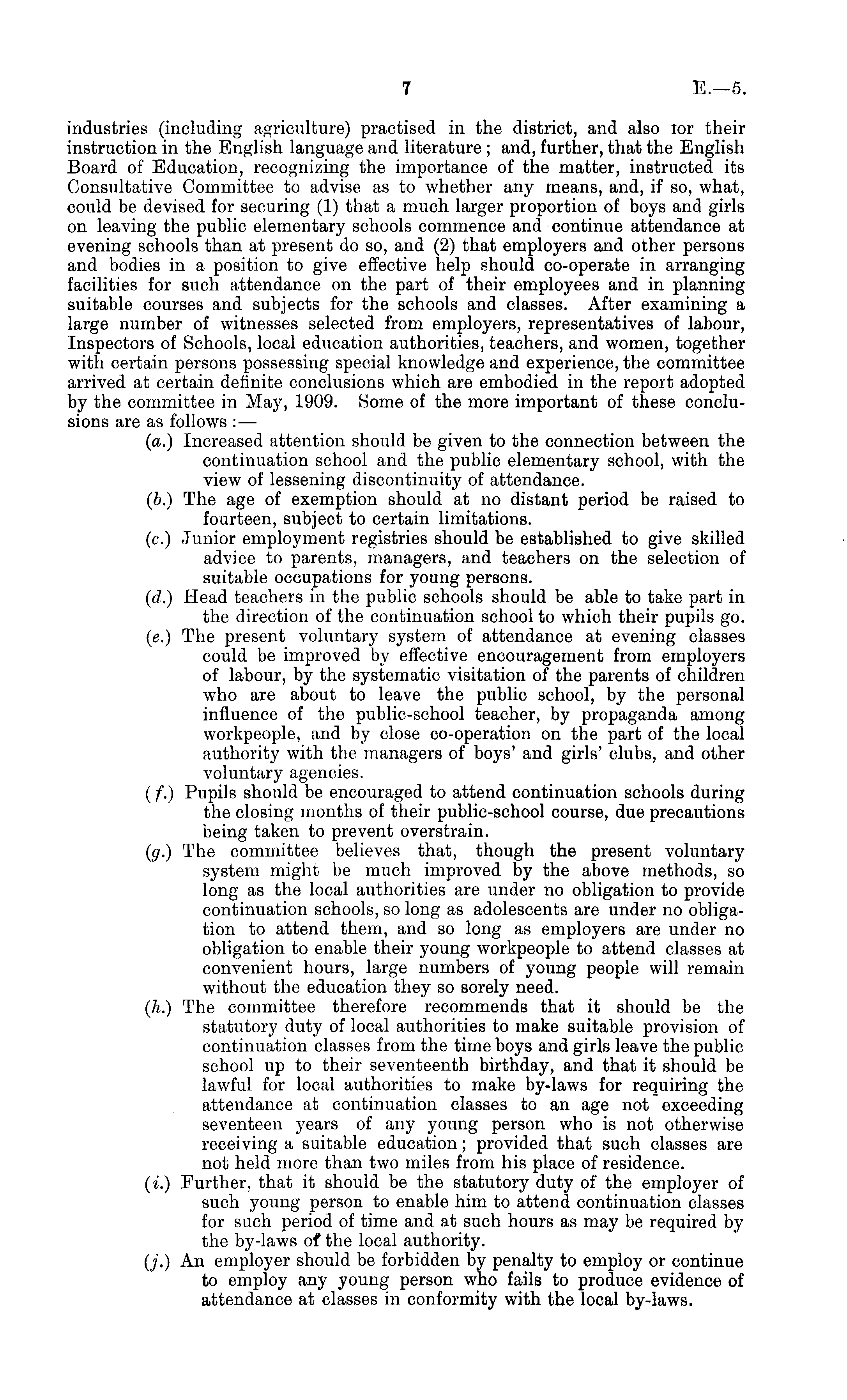 industries (including agriculture) practised in the district, and also lor their instruction in the English language and literature ; and, further, that the English Board of Education, recognizing the importance of the matter, instructed its Consultative Committee to advise as to whether any means, and, if so, what, could be devised for securing (1) that a much larger proportion of boys and girls on leaving the public elementary schools commence and continue attendance at evening schools than at present do so, and (2) that employers and other persons and bodies in a position to give effective help should co-operate in arranging facilities for such attendance on the part of their employees and in planning suitable courses and subjects for the schools and classes. After examining a large number of witnesses selected from employers, representatives of labour, Inspectors of Schools, local education authorities, teachers, and women, together with certain persons possessing special knowledge and experience, the committee arrived at certain definite conclusions which are embodied in the report adopted by the committee in May, 1909. Some of the more important of these conclusions are as follows :— (a.) Increased attention should be given to the connection between the continuation school and the public elementary school, with the view of lessening discontinuity of attendance. (_.) The age of exemption should at no distant period be raised to fourteen, subject to certain limitations, (c.) Junior employment registries should be established to give skilled advice to parents, managers, and teachers on the selection of suitable occupations for young persons. (d.) Head teachers in the public schools should be able to take part in the direction of the continuation school to which their pupils go. (c.) The present voluntary system of attendance at evening classes could be improved by effective encouragement from employers of labour, by the systematic visitation of the parents of children who are about to leave the public school, by the personal influence of the public-school teacher, by propaganda among workpeople, and by close co-operation on the part of the local authority with the managers of boys' and girls' clubs, and other voluntary agencies. ( f.) Pupils should be encouraged to attend continuation schools during the closing months of their public-school course, due precautions being taken to prevent overstrain. (g.) The committee believes that, though the present voluntary system might be much improved by the above methods, so long as the local authorities are under no obligation to provide continuation schools, so long as adolescents are under no obligation to attend them, and so long as employers are under no obligation to enable their young workpeople to attend classes at convenient hours, large numbers of young people will remain without the education they so sorely need. (h.) The committee therefore recommends that it should be the statutory duty of local authorities to make suitable provision of continuation classes from the time boys and girls leave the public school up to their seventeenth birthday, and that it should be lawful for local authorities to make by-laws for requiring the attendance at continuation classes to an age not exceeding seventeen years of any young person who is not otherwise receiving a suitable education; provided that such classes are not held more than two miles from his place of residence. (..) Further, that it should be the statutory duty of the employer of such young person to enable him to attend continuation classes for such period of time and at such hours as may be required by the by-laws of the local authority. (j.) An employer should be forbidden by penalty to employ or continue to employ any young person who fails to produce evidence of attendance at classes in conformity with the local by-laws.