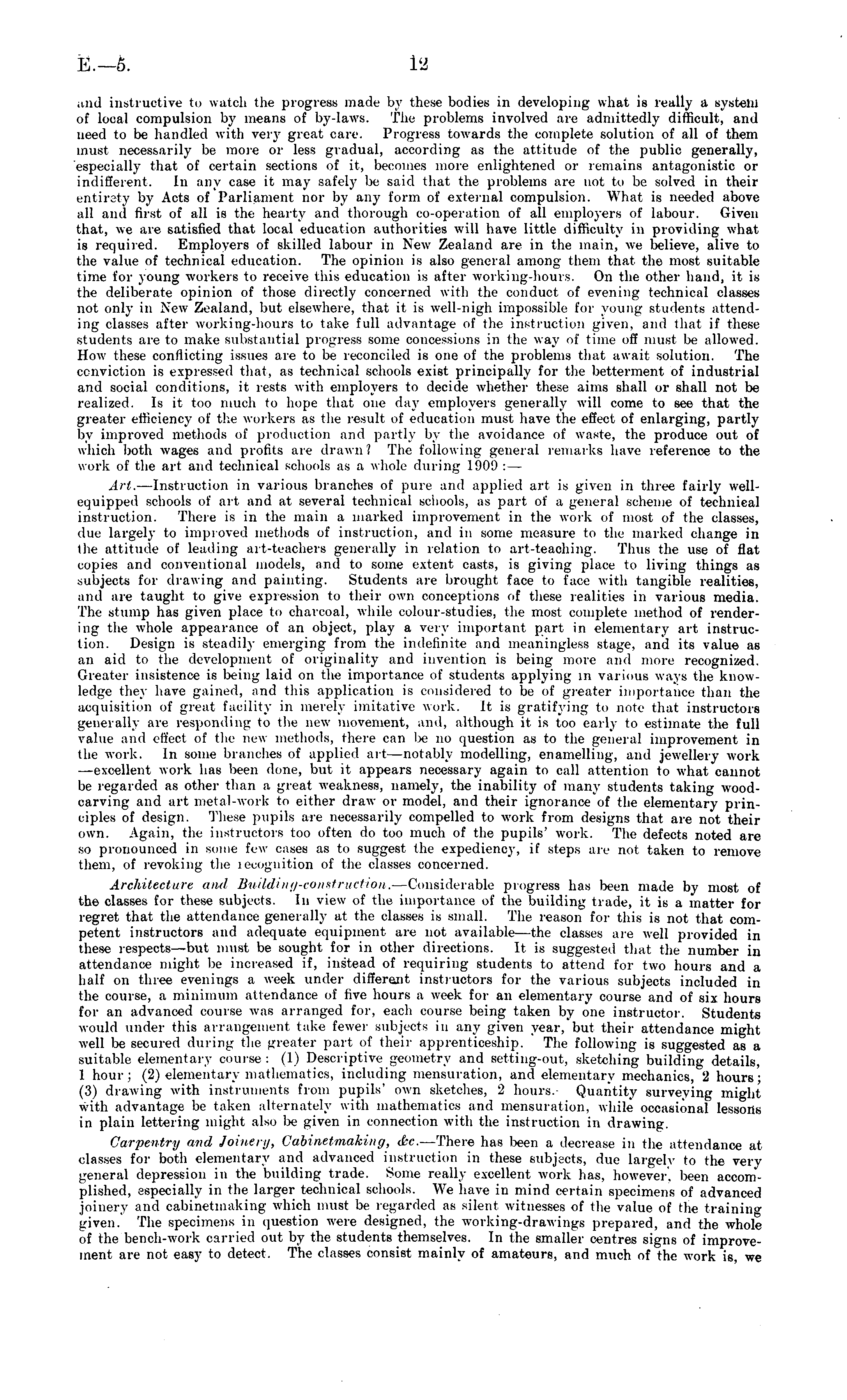 and instructive to watch the progress made by these bodies in developing what is really a system of local compulsion by means of by-laws. The problems involved are admittedly difficult, and need to be handled with very great care. Progress towards the complete solution of all of them must necessarily be more or less gradual, according as the attitude of the public generally, especially that of certain sections of it, becomes more enlightened or remains antagonistic or indifferent. In any case it may safely be said that the problems are not to be solved in their entirety by Acts of Parliament nor by any form of external compulsion. What is needed above all and first of all is the hearty and thorough co-operation of all employers of labour. Given that, we are satisfied that local education authorities will have little difficulty in providing what is required. Employers of skilled labour in New Zealand are in the main, we believe, alive to the value of technical education. The opinion is also general among them that the most suitable time for young workers to receive this education is after working-hours. On the other hand, it is the deliberate opinion of those directly concerned with the conduct of evening technical classes not only in New Zealand, but elsewhere, that it is well-nigh impossible for young students attending classes after working-hours to take full advantage of the instruction given, and that if these students are to make substantial progress some concessions in the way of time off must be allowed. How these conflicting issues are to be reconciled is one of the problems that await solution. The conviction is expressed thai, as technical schools exist principally for the betterment of industrial and social conditions, it rests with employers to decide whether these aims shall or shall not be realized. Is it too much to hope that one day employers generally will come to see that the greater efficiency of the workers as the result of education must have the effect of enlarging, partly by improved methods of production and partly by the avoidance of waste, the produce out of which both wages and profits are drawn? The following general remarks have reference to the work of the art and technical schools as a whole during 1909 : — Art. —Instruction in various branches of pure and applied art is given in three fairly wellequipped schools of art and tit several technical schools, as part of a general scheme of technical instruction. There is in the main a marked improvement in the work of most of the classes, due largely to improved methods of instruction, and in some measure to the marked change in the attitude of leading art-teachers generally in relation to art-teaching. Thus the use of flat copies and conventional models, and to some extent casts, is giving place to living things as subjects for drawing and painting. Students are brought face to face with tangible realities, and are taught to give expression to their own conceptions of these realities in various media. The stump has given place to charcoal, while colour-studies, the most complete method of rendering the whole appearance of an object, play a very important part in elementary art instruction. Design is steadily emerging from the indefinite and meaningless stage, and its value as an aid to the development of originality and invention is being more and more recognized. Greater insistence is being laid on the importance of students applying in various ways the knowledge they have gained, and this application is considered to be of greater importance than the acquisition of great facility in merely imitative work. It is gratifying to note that instructors generally are responding to the new movement, and, although it is too early to estimate the full value and effect of the new methods, there can be no question as to the general improvement in the work. In some blanches of applied art —notably modelling, enamelling, and jewellery work —excellent work has been done, but it appears necessary again to call attention to what cannot be regarded as other than a great weakness, namely, the inability of many students taking woodcarving and art met til-work to either draw or model, and their ignorance of the elementary principles of design. These pupils are necessarily compelled to work from designs that are not their own. Again, the instructors too often do too much of the pupils' work. The defects noted are so pronounced in some few eases as to suggest the expediency, if steps are not taken to remove them, of revoking the recognition of the classes concerned. Architecture and Building-construction. —Considerable progress has been made by most of the classes for these subjects. In view of the importance of the building trade, it is a matter for regret that the attendance generally at the classes is small. The reason for this is not that competent instructors and adequate equipment are not available—the classes are well provided in these respects —but must be sought for in other directions. It is suggested that the number in attendance might be increased if, instead of requiring students to attend for two hours and a half on three evenings a week under different instructors for the various subjects included in the course, a minimum attendance of five hours a week for an elementary course and of six hours for an advanced course was arranged for, each course being taken by one instructor. Students would under this arrangement take fewer subjects in any given year, but their attendance might well be secured during the greater part of their apprenticeship. The following is suggested as a suitable elementary course: (1) Descriptive geometry and setting-out. sketching building details. 1 hour; (2) elementary mathematics, including mensuration, and elementary mechanics, 2 hours; (3) drawing with instruments from pupils' own sketches, 2 hours. Quantity surveying might with advantage be taken alternately with mathematics 