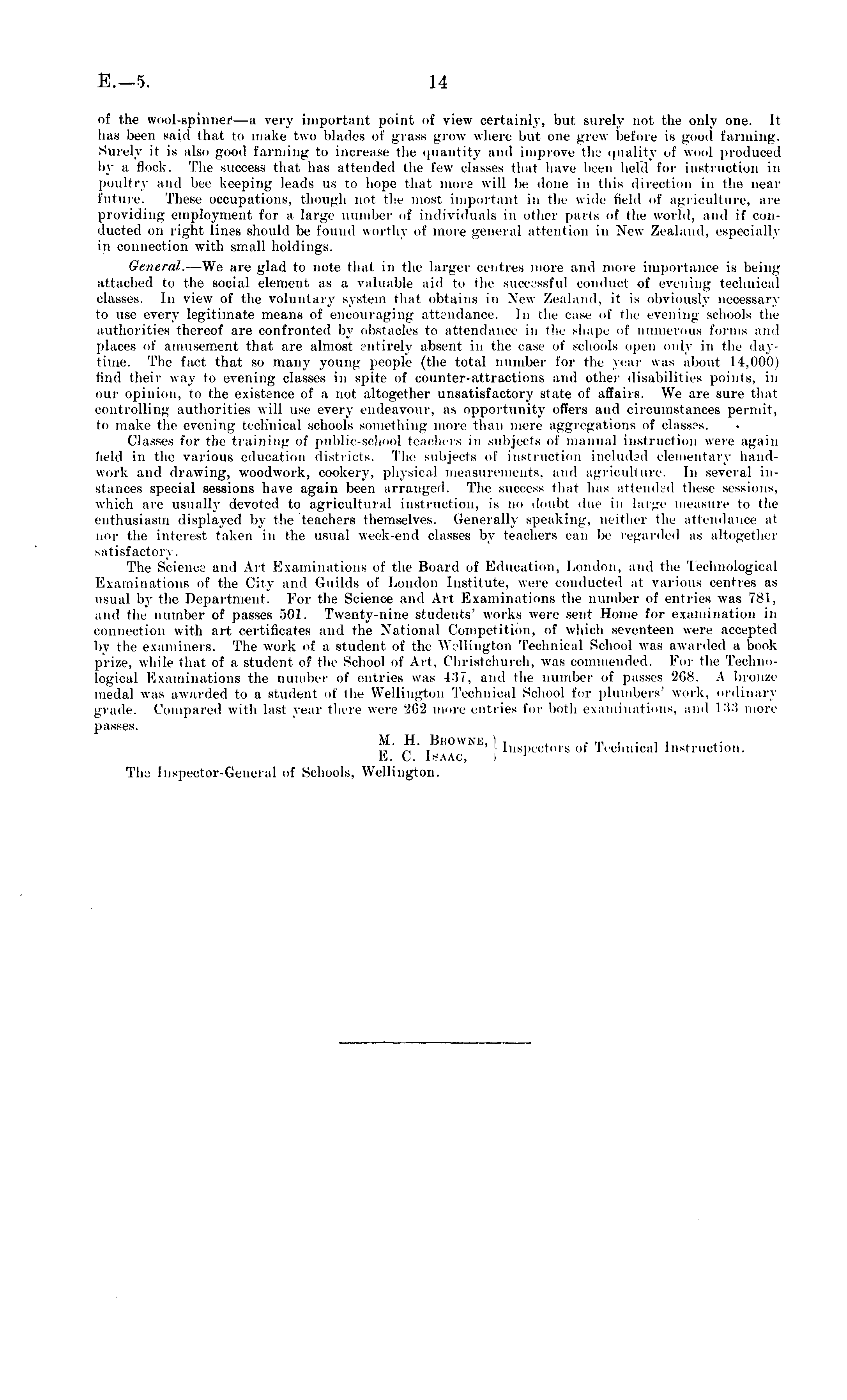 of the wool-spinner—a Very important point of view certainly, but surely not the only one. It litis been said that to make two blades of grass grow where hut one grew before is good farming. Surely it is also good farming to increase the quantity and improve the quality of wool produced h\ a flock. The success that litis attended the few classes that have been held for instruction in poultry and bee keeping leads us to hope that more will he done in this direction in the near future. These occupations, though not the most important in the wide field of agriculture, are providing employment for ti large number of individuals in other parte of the world, and if conducted on right lines should be found worthy of more general attention in New Zealand., especially in connection with small holdings. General. —We are glad to note that in the larger centres more and more importance is being attached to the social element as a valuable aid to the successful conduct of evening technical classes. It: view of the voluntary system that obtains in New Zealand, it is obviously necessary to use every legitimate means of encouraging attendance. In the case of the evening schools the authorities thereof are confronted by obstacles to attendance in the shape of numerous forms and places of amusement that are almost entirely absent in the case of schools open only in the day time. The fact that so many young people (the total number for the year was about 14,000) find their way to evening classes in spite of counter-attractions and other disabilities points, in our opinion, to the existence of a not altogether unsatisfactory state of affairs. We are sure that controlling authorities will use every endeavour, as opportunity offers and circumstances permit, to make the evening technical schools something more than mere aggregations of classes, Classes for the training of public-school teachers in subjects of manual instruct ion were again laid iii the various education districts. The subjects of instruction included elementary handwork and drawing, woodwork, cookery, physical measurements, and agriculture. In several instances special sessions h.t\e again been arranged. The success that has attended these sessions. which are usually devoted to agricultural instruction, is no doubt due in large measure to the enthusiasm displayed by the teachers themselves. Generally speaking, neither the attendance at nor the interest taken in the usual weekend classes by teachers can In- regarded as altogether satisfactory. The Science and Art Examinations of the Board of Education, London, and the Technological Examinations of the City and Guilds of London Institute, were conducted at various centres as usual by the Department. For the Science and Art Examinations the number of entries was 781, and the number of passes 501. Twenty-nine students' works were sent Home for examination in connect ion with art certificates and the National Competition, of which seventeen were accepted by tile examiners. The work of a student of the Wellington Technical School was awarded a hook prize, while that of a student of the School of Art. Christchurch. was commended. For the Technological Examinations the number of entries was 137, and the number of passes 268. A bronze medal was awarded to a student of the Wellington Technical School for plumbers' work, ordinary grade. Compared with last year there were 262 more entries for both examinations, and 1 •")■'! more [Hisses. M. 11. Browne, | , ~ ... , • , , . , • ~ ~ , ■■ Inspectors or technical Instruction. E. C. Isaac, , ' The Inspector-General of Schools. Wellington.