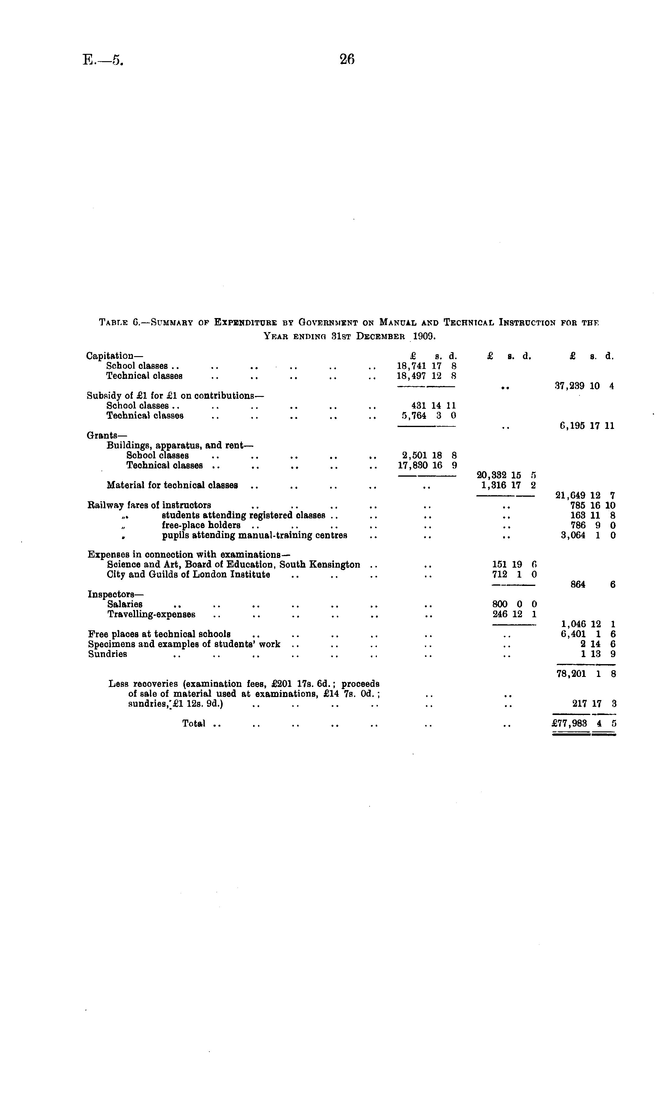 Table G.—Summary of Expenditure by Government on Manual and Technical Instruction for the Year ending 31st December 1909. Capitation— £ s. d. £ a. d. £ s. d. School classes .. .. .. .. .. .. 18,74117 8 Teohnical classes .. .. .. .. .. 18,497 12 8 .. 37,239 10 4 Subsidy of £1 for £1 on contributions— School classes .. .. .. .. .. .. 43114 11 Technical classes .. .. .. .. .. 5,764 3 0 .. 6,195 17 11 Grants— Buildings, apparatus, and rent — School classes .. .. .. .. .. 2,50118 8 Technical classes .. .. .. .. .. 17,830 16 9 20,332 15 5 Material for technical classes .. .. .. .. .. 1,316 17 2 21,649 12 7 Railway fares of instructors .. .. .. .. .. .. 785 16 10 „. students attending registered olasses .. .. .. .. 163 11 8 free-place holders .. .. .. .. .. .. 786 9 0 pupils attending manual-training centres .. .. .. 3,064 1 0 Expenses in connection with examinations — Soience and Art, Board of Education, South Kensington .. .. 151 19 G City and Guilds of London Institute .. .. .. .. 712 1 0 864 6 Inspectors — Salaries .. .. .. .. .. .. .. 800 0 0 Travelling-expenses .. .. .. .. .. .. 246 12 1 — 1,046 12 1 Free places at technioal schools .. .. .. .. .. .. 6,401 1 6 Specimens and examples of students' work .. .. .. .. .. 2 14 6 Sundries .. .. .. .. .. .. .. .. 1 13 9 78,201 1 8 Less recoveries (examination fees, £201 17s. 6d.; proceeds of sale of material used at examinations, £14 7s. Od. ; sundries,'£l 12s. 9d.) .. .. .. .. .. .. 217 17 3 Total .. .. .. .. .. .. .. £77,983 4 5