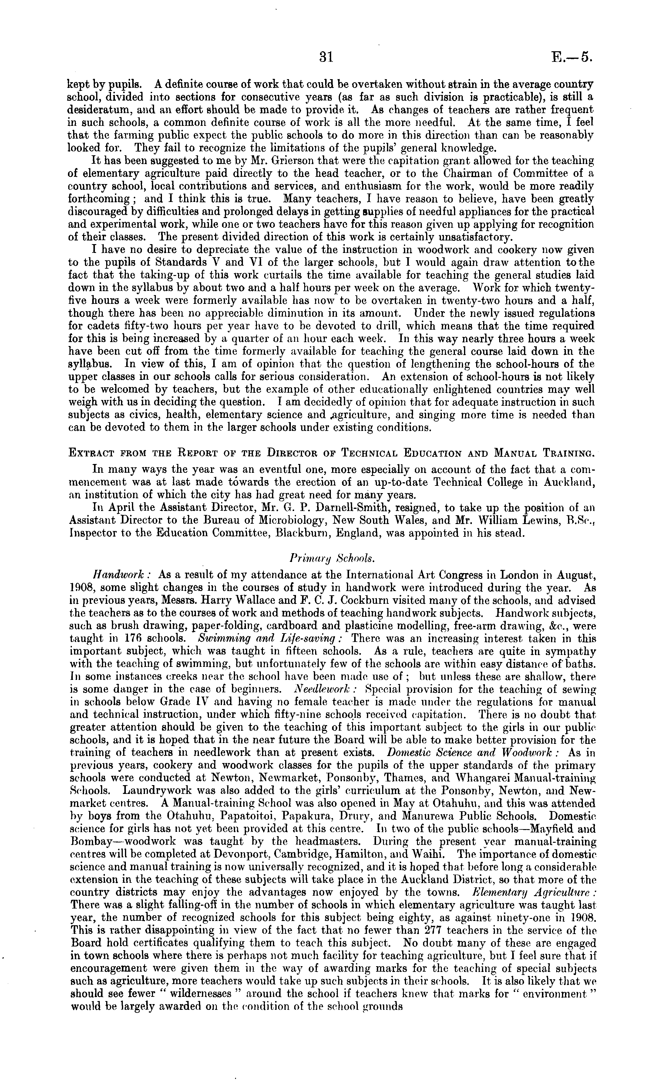kept by pupils. A definite course of work that could be overtaken without strain in the average country school, divided into sections for consecutive years (as far as such division is practicable), is still a desideratum, and an effort should be made to provide it. As changes of teachers are rather frequent in such schools, a common definite course of work is all the more needful. At the same time, 1 feel that the farming public expect the public schools to do more in this direction than can be reasonably looked for. They fail to recognize the limitations of the pupils' general knowledge. It has been suggested to me by Mr. Grierson thai were the capitation grant allowed for the teaching of elementary agriculture paid directly to the head teacher, or to the Chairman of Committee of a country school, local contributions and services, and enthusiasm for the work, would be more readily forthcoming ; and I think this is true. Many teachers, I have reason to believe, have been greatly discouraged by difficulties and prolonged delays in getting supplies of needful appliances for the practical and experimental work, while one or two teachers have for this reason given up applying for recognition of their classes. The present divided direction of this work is certainly unsatisfactory. I have no desire to depreciate the value of the instruction in woodwork and cookery now given to the pupils of Standards V and VI of the larger schools, but I would again draw attention to the fact that the taking-up of this work curiails the time available for teaching the general studies laid down in the syllabus by about two and a half hours per week on the average. Work for which twentyfive hours a week were formerly available has now to be overtaken in twenty-two hours and a half, though there has been no appreciable diminution in its amount. Under the newly issued regulations for cadets fifty-two hours per year have to be devoted to drill, which means that the time required for this is being increased by a quarter of an hour each week. In this way nearly three hours a week have been cut off from the time formerly available for teaching the general course laid down in the syllabus. In view of this, lam of opinion that the question of lengthening the school-hours of the upper classes in our schools calls for serious consideration. An extension of school-hours is not likely to be welcomed by teachers, but the example of other educationally enlightened countries may well weigh with us in deciding the question. lam decidedly of opinion that for adequate instruction in such subjects as civics, health, elementary science and .agriculture, and singing more time is needed than can be devoted to them in the larger schools under existing conditions. Extract from the Report of the Director of Technical Education and Manual Traininc. In many ways the year was an eventful one, more especially on account of the fact that a commencement was at last made towards the erection of an up-to-date Technical College in Auckland, an institution of which the city has had great need for many years. In April the Assistant Director, Mr. G. P. Darnell-Smith, resigned, to take up the position of an Assistant Director to the Bureau of Microbiology, New South Wales, and Mr. William Lew ins. B.Sc, Inspector to the Education Committee, Blackburn, England, was appointed in his stead. Primary Schools. Handwork : As a result of my attendance at the International Art Congress in London in August, 1008, some slight changes in the courses of study in handwork were introduced during the, year. As in previous years, Messrs. Harry Wallace and F. C. J. Cockburn visited many of the schools, and advised i In- teachers as to the courses of work and methods of teaching handwork subjects. Handwork subjects, such as brush drawing, paper-folding, cardboard and plasticine modelling, free-arm drawing, &c., were taught in I7(i schools. Swimming and Life-saving: There was an increasing interest taken in this important subject, which was taught in fifteen schools. As a rule, teachers are quite in sympathy with the teaching of swimming, but unfortunately few of the schools are within easy distance of baths. In some instances creeks near the school have been made use of; but unless these are shallow, there is some danger in the case of beginners. Needlework: Special provision for the teaching of sewing in schools below Grade IV and having no female teacher is made under the regulations for manual and technical instruction, under which fifty-nine schools received capitation. There is no doubt that greater attention should be given to the teaching of this important subject to the girls in our public schools, and it is hoped that in the near future the Board will be able to make better provision for the training of teachers in needlework than at present exists. Domestic Science and Woodwork : As in previous years, cookery and woodwork classes for the pupils of the upper standards of the primary schools were conducted at Newton, Newmarket, Ponsonby, Thames, and Whangarei Manual-training Schools. Laundrywork was also added to the girls' curriculum at the Ponsonby. Newton, and Newmarket centres. A Manual-training School was also opened in May at Otahuhu. and this was attended by boys from the Otahuhu. l'apatoitoi, Papakura, Drury, and Manurewa Public Schools. Domestic science for girls has not yet been provided at this centre. In two of the public schools—Mayfield and Bombay —woodwork was taught by the headmasters. During the present year manual-training centres will be completed at Devonport, Cambridge, Hamilton, and Waihi. The importance of domestic science and manual training is now universally recognized, and it is hoped that before long a considerable extension in the teaching of these subjects will take place in the Auckland District, so thai more of the country districts may enjoy the advantages now enjoyed by the towns. Elementary Agriculture : There was a sligh