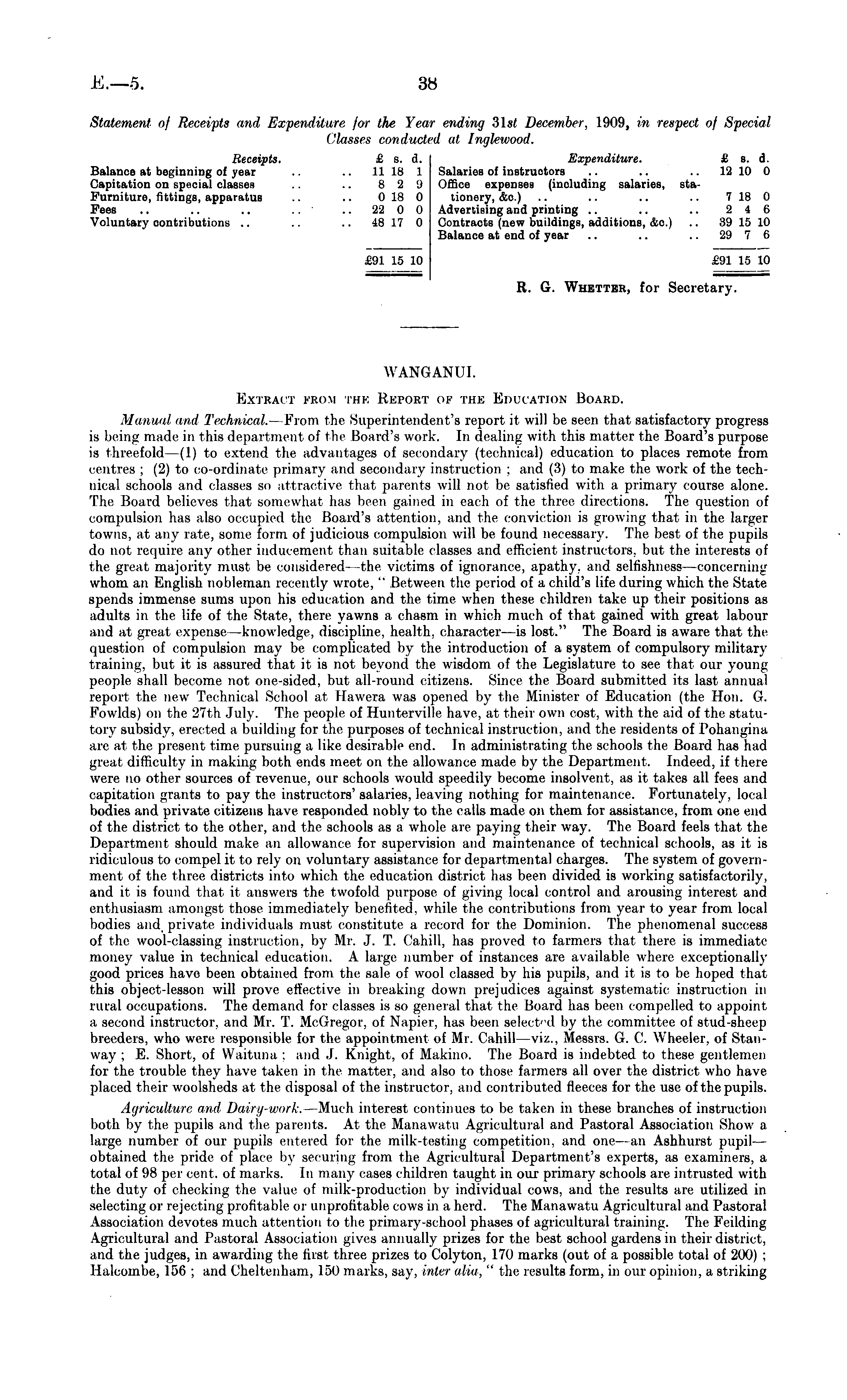 Statement of Receipts and Expenditure for the Year ending 31st December, 1909, in respect of Special Classes conducted at Ingleivood. Receipts. £ s. d. Expenditure. £ s. d. Balance at beginning of year .. .. 11 18 1 Salaries of instructors .. .. .. 12 10 0 Capitation on special classes .. .. 8 2 9 Office expenses (including salaries, staFurniture, fittings, apparatus .. .. 018 0 tionery, &c.) .. .. .. .. 718 0 Fees .. .. .. .. ■ 22 0 0 Advertising and printing .. .. .. 2 4 6 Voluntary contributions .. .. .. 48 17 0 Contracts (new buildings, additions, &c.) .. 39 15 10 Balance at end of year .. .. .. 29 7 6 £91 15 10 £91 15 10 R. G. Whetter, for Secretary. WANGANUI. Extract from the Report of the Education Board. Mannul and Technical. —From the Superintendent's report it will be seen that satisfactory progress is being made in this department of the Board's work. In dealing with this matter the Board's purpose is threefold —(1) to extend the advantages of secondary (technical) education to places remote from centres ; (2) to co-ordinate primary and secondary instruction ; and (3) to make the work of the technical schools and classes so attractive that parents will not be satisfied with a primary course alone. The Board believes that somewhat has been gained in each of the three directions. The question of compulsion has also occupied the Board's attention, and the conviction is growing that in the larger towns, at any rate, some form of judicious compulsion will be found necessary. The best of the pupils do not require any other inducement than suitable classes and efficient instructors, but the interests of the great majority must be considered the victims of ignorance, apathy, and selfishness—concerning whom an English nobleman recent ly wrote, " Between the period of a child's life during which the State spends immense sums upon his education and the time when these children take up their positions as adults in the life of the State, there yawns a chasm in which much of that gained with great labour and at great expense—knowledge, discipline, health, character—is lost." The Board is aware that the question of compulsion may be complicated by the introduction of a system of compulsory military training, but it is assured that it is not beyond the wisdom of the Legislature to see that our young people shall become not one-sided, but all-round citizens. Since the Board submitted its last annual report the new Technical School at Hawera was opened by the Minister of Education (the Hon. G. Fowlds) on the 27th July. The people of Hunterville have, at their own cost, with the aid of the statutory subsidy, erected a building for the purposes of technical instruction, and the residents of Pohaugina are at the present time pursuing a. like desirable end. In administrating the schools the Board has had great difficulty in making both ends meet on the allowance made by the Department. Indeed, if there were no other sources of revenue, our schools would speedily become insolvent, as it takes all fees and capitation grants to pay the instructors' salaries, leaving nothing for maintenance. Fortunately, local bodies and private citizens have responded nobly to the calls made on them for assistance, from one end of the district to the other, and the schools as a whole are paying their way. The Board feels that the Department should make an allowance for supervision and maintenance of technical schools, as it is ridiculous to compel it to rely on voluntary assistance for departmental charges. The system of government of the three districts into which the education district has been divided is working satisfactorily, and it is found that it answers the twofold purpose of giving local control and arousing interest and enthusiasm amongst those immediately benefited, while the contributions from year to year from local bodies and. private individuals must constitute a record for the Dominion. The phenomenal success of the wool-classing instruction, by Mr. J. T. Cahill, has proved to farmers that there is immediate money value in technical education. A large number of instances are available where exceptionally good prices have been obtained from the sale of wool classed by his pupils, and it is to be hoped that this object-lesson will prove effective in breaking down prejudices against systematic instruction in rural occupations. The demand for classes is so general that the Board has been compelled to appoint a second instructor, and Mr. T. McGregor, of Napier, has been selected by the committee of stud-sheep breeders, who were responsible for the appointment of Mr. Cahill —viz., Messrs. G. C. Wheeler, of Stanway ; E. Short, of Waituna : and .1. Knight, of Makino. The Board is indebted to these gentlemen for the trouble they have taken in the matter, and also to those farmers all over the district who have placed their woolsheds at the disposal of the instructor, and contributed fleeces for the use of the pupils. Agriculture and Dairy-work. —Much interest continues to be taken in these branches of instruction both by the pupils and the parents. At the Manawatu Agricultural and Pastoral Association Show a large number of our pupils entered for the milk-testing competition, and one —an Ashhurst pupil— obtained the pride of place by securing from the Agricultural Department's experts, as examiners, a total of 98 per cent, of marks. In many cases children taught in our primary schools are intrusted with the duty of checking the value of milk-production by individual cows, and the results are utilized in selecting or rejecting profitable or unprofitable cows in a herd. The Manawatu Agricultural and Pastoral Association devotes much attention to the primary-school phases of agricultural training. The Feilding Agricultural and Pastoral Association gives annually prizes for the best school gardens in their district, and the judges, in awarding the first three prizes to Colyton, 170 marks (o