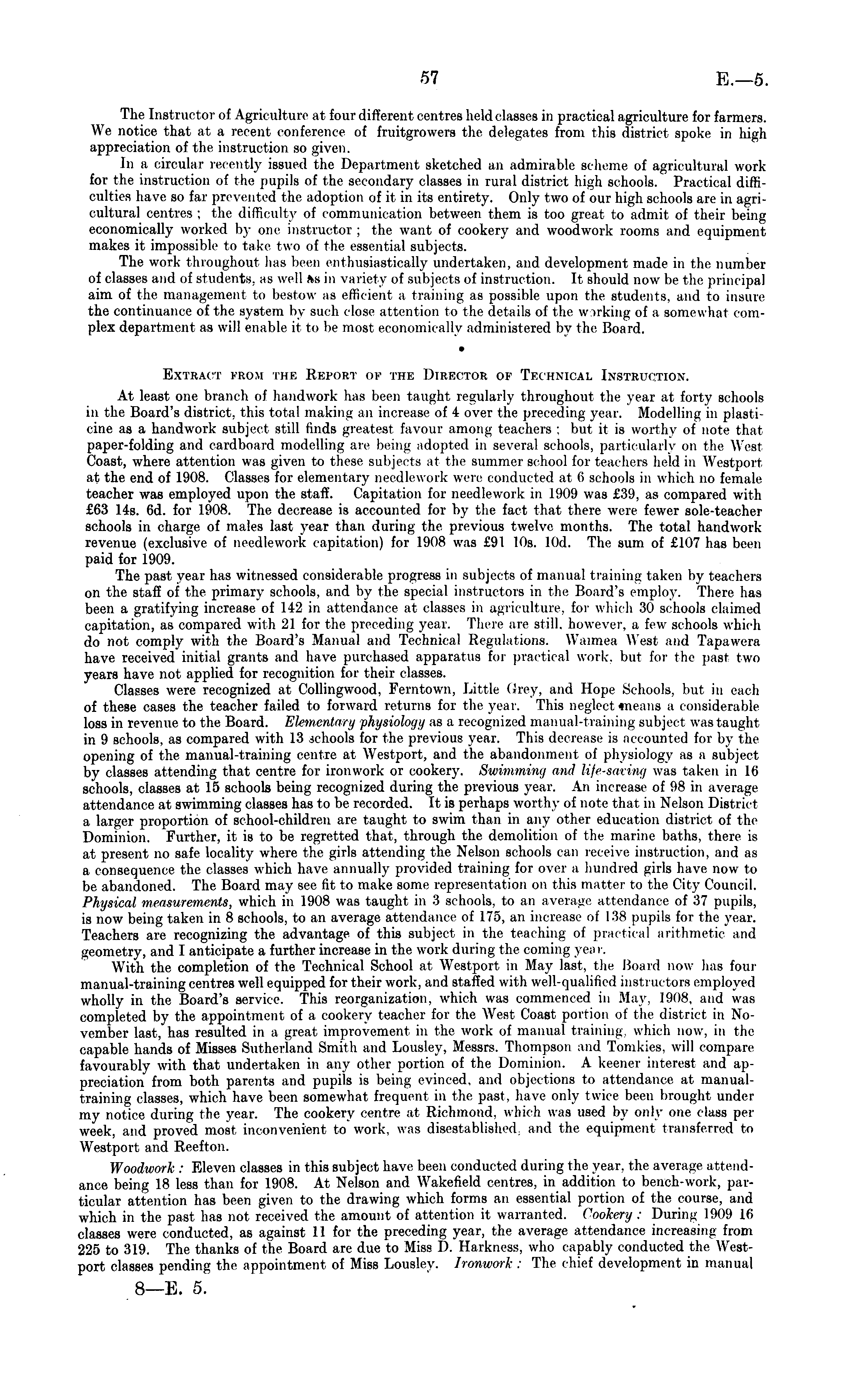 The Instructor of Agriculture at four different centres held classes in practical agriculture for farmers. We notice that at a recent conference of fruitgrowers the delegates from this district spoke in high appreciation of the instruction so given. In a circular recently issued the Department sketched an admirable scheme of agricultural work for the instruction of the pupils of the secondary classes in rural district high schools. Practical difficulties have so far pre\ ented the adoption of it in its entirety. Only two of our high schools are in agricultural centres : the difficulty of communication between them is too great to admit of their being economically worked by one instructor ; the want of cookery and woodwork rooms and equipment makes it impossible to take two of the essential subjects. The work throughout has been enthusiastically undertaken, and development made in the number of classes and of students, as well as in variety of subjects of instruction. It should now be the principal aim of the management to bestow as efficient a training as possible upon the students, and to insure the continuance of the system by such close attention to the details of the working of a somewhat complex department as will enable it to be most economically administered by the Board. Extract from the Report of the Director of Technical Instruction-. At least one branch of handwork has been taught regularly throughout the year at forty schools in the Board's district, this total making an increase of 4 over the preceding year. Modelling in plasticine as a handwork subject still finds greatest favour among teachers : but it is worthy of note that paper-folding and cardboard modelling are being adopted in several schools, particularly on the West Coast, where attention was given to these subjects at the summer school for teachers held in Westport at the end of 1908. Classes for elementary needlework were conducted at fi schools in which no female teacher was employed upon the staff. Capitation for needlework in 1909 was £39, as compared with £63 14s. 6d. for 1908. The decrease is accounted for by the fact that there wen fewer sole-teacher schools in charge of males last year than during the previous twelve months. The total handwork revenue (exclusive of needlework capitation) for 1908 was £91 10s. lOd. The sum of £107 has been paid for 1909. The past year has witnessed considerable progress in subjects of manual training taken by teachers on the staff of the primary schools, and by the special instructors in the Board's employ. There has been a gratifying increase of 142 in attendance at classes in agriculture, for which 30 schools claimed capitation, as compared with 21 for the preceding year. There are still, however, a few schools which do not comply with the Board's Manual and Technical Regulations. Waimea West and Tapawera have received initial grants and have purchased apparatus for practical work, but for the past two years have not applied for recognition for their classes. Classes were recognized at Collingwood, Ferntown, Little Grey, and Hope Schools, but in each of these cases the teacher failed to forward returns for the year. This neglect means a considerable loss in revenue to the Board. Elementary physiology as a recognized manual-training subject was taught in 9 schools, as compared with 13 schools for the previous year. This decrease is accounted for by the opening of the manual-training centre at Westport, and the abandonment of physiology as a subject by classes attending that centre for ironwork or cookery. Swimming and life-saving was taken in 16 schools, classes at 15 schools being recognized during the previous year. An increase of 98 in average attendance at swimming classes has to be recorded. It is perhaps worthy of note that in Nelson District a larger proportion of school-children are taught to swim than in any other education district of the Dominion. Further, it is to be regretted that, through the demolition of the marine baths, there is at present no safe locality where the girls attending the Nelson schools can receive instruction, and as a consequence the classes which have annually provided training for over a hundred girls have now to be abandoned. The Board may see fit to make some representation on this matter to the City Council. Physical measurements, which in 1908 was taught in 3 schools, to an average attendance of 37 pupils, is now being taken in 8 schools, to an average attendance of 175, an increase of 138 pupils for the year. Teachers are recognizing the advantage of this subject in the teaching of practical arithmetic and geometry, and I anticipate a further increase in the work during the coming yea r. With the completion of the Technical School at Westport in May last, the Board now has four manual-training centres well equipped for their work, and staffed with well-qualified instructors employed wholly in the Board's service. This reorganization, which was commenced in May. 1908, and was completed by the appointment of a cookery teacher for the West Coast portion of the district in November last, has resulted in a great improvement in the work of manual training which now-, in the capable hands of Misses Sutherland Smith and Lousley, Messrs. Thompson and Tomlties, will compare favourably with that undertaken in any other portion of the Dominion. A keener interest and appreciation from both parents and pupils is being evinced, and objections to attendance at manualtraining classes, which have been somewhat frequent in the past, have only twice been brought under my notice during the year. The cookery centre at Richmond, which was used by only one class per week, and proved most inconvenient to work, was disestablished and the equipment transferred to Westport and Reefton. Woodwork : Eleven classes in this subject have been conducted during the year, the average attendance being 18 less than for 1908. At Nelson and Wakefield centres, in additi