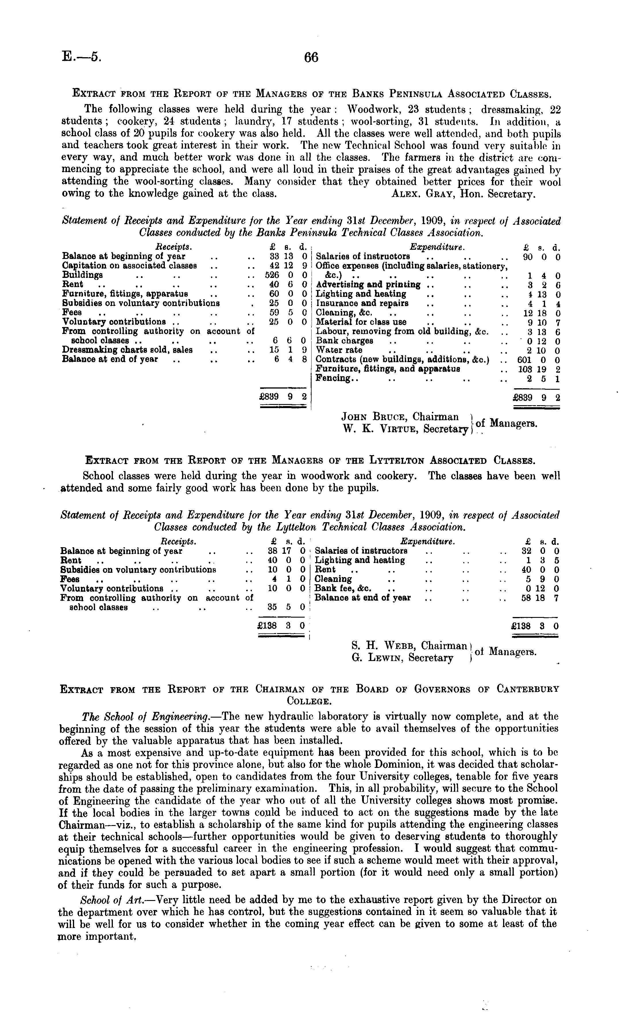Extract from the Report of the Managers of the Banks Peninsula Associated Classes. The following classes were held during the year : Woodwork, 23 students ; dressmaking, 22 students ; cookery, 2-1 students ; laundry, 17 students ; wool-sorting, 31 students, fn addition, a school class of 20 pupils for cookery was also held. All the classes were well attended, and both pupils and teachers took great interest in their work. The new Technical School was found very suitable in every way, and much better work was done in all the classes. The farmers in the district are commencing to appreciate the school, and were all loud in their praises of the great advantages gained by attending the wool-sorting classes. Many consider that they obtained better prices for their wool owing to the knowledge gained at the class. Alex. Gray, Hon. Secretary. Statement of Receipts and Expenditure for the Year ending 31st December, 1909, in respect of Associated Classes conducted by the Banlcs Peninsula Technical Classes Association. Receipts. £ a. d. Expenditure. £ s. d. Balance at beginning of year .. .. 33 13 0 Salaries of instructors .. .. .. 90 0 0 Capitation on associated classes .. .. 42 12 9 Office expenses (including salaries, stationery, Buildings .. .. .. .. 526 0 0 &c.) .. .. .. .. .. 140 Rent .. .. .. .. 40 6 0 Advertising and printing .. .. .. 3-6 Furniture, fittings, apparatus .. .. 60 0 0 Lighting and heating .. .. .. 413 0 Subsidies on voluntary contributions . 25 0 0 Insurance and repairs .. .. .. 4 14 Fees .. .. .. .. 59 5 0 Cleaning, &c. .. .. .. 12 18 0 Voluntary contributions .. .. .. 25 0 0 Material for class use .. .. .. 910 7 From controlling authority on acoount of Labour, removing from old building, &c. .. 313 6 school classes .. .. .. .. 6 6 0 Bank charges .. .. .. ..0120 Dressmaking charts sold, sales .. .. 15 1 9 Water rate .. .. .. .. 210 0 Balance at end of year .. .. .. 6 4 8 Contracts (new buildings, additions, &c.) .. 601 0 0 Furniture, fittings, and apparatus .. 103 19 2 Fencing.. .. .. .. .. 251 £839 9 2 £839 9 2 John Bruce, Chairman ) ,*, W. K. Virtue, Secretary j of Ma » a S erB - Extract from the Report of the Managers of the Lyttelton Associated Classes. School classes were held during the year in woodwork and cookery. The classes have been well attended and some fairly good work has been done by the pupils. Statement of Receipts and Expenditure for the Year ending 31st December, 1909, in respect of Associated Classes conducted by the Lyttelton Technical Classes Association. Receipts. £ s. d. Expenditure. £ s. d. Balance at beginning of year .. .. 38 17 0 Salaries of instructors .. .. 32 0 0 Rent .. .. .. . 40 0 0 Lighting and heating .. .. .. 13 5 Subsidies on voluntary contributions .. 10 0 0 Rent .. .. .. 40 0 0 Fees .. .. .. .. .. 410 Cleaning .. .. .. .. 5 9 0 Voluntary contributions .. .. .. 10 0 0 Bank fee, &c. .. .. .. 012 0 From controlling authority on account of Balance at end of year .. .. .. 58 18 7 sohool classes .. .. .. 35 5 0 £138 3 0 £138 3 0 S. H. Webb, Chairman | , ~ f. T _ ol Managers. G. Lewin, Secretary ) B Extract from the Report of the Chairman of the Board of Governors of Canterbury College. The School of Engineering. —The new hydraulic laboratory is virtually now complete, and at the beginning of the session of this year the students were able to avail themselves of the opportunities offered by the valuable apparatus that has been installed. As a most expensive and up-to-date equipment has been provided for this school, which is to be regarded as one not for this province alone, but also for the whole Dominion, it was decided that scholarships should be established, open to candidates from the four University colleges, tenable for five years from the date of passing the preliminary examination. This, in all probability, will secure to the School of Engineering the candidate of the year who out of all the University colleges shows most promise. If the local bodies in the larger towns could be induced to act on the suggestions made by the late Chairman—viz., to establish a scholarship of the same kind for pupils attending the engineering classes at their technical schools —further opportunities would be given to deserving students to thoroughly equip themselves for a successful career in the engineering profession. I would suggest that communications be opened with the various local bodies to see if such a scheme would meet with their approval, and if they could be persuaded to set apart a small portion (for it would need only a small portion) of their funds for such a purpose. School of Art. —Very little need be added by me to the exhaustive report given by the Director on the department over which he has control, but the suggestions contained in it seem so valuable that it will be well for us to consider whether in the coming year effect can be given to some at least of the more important.