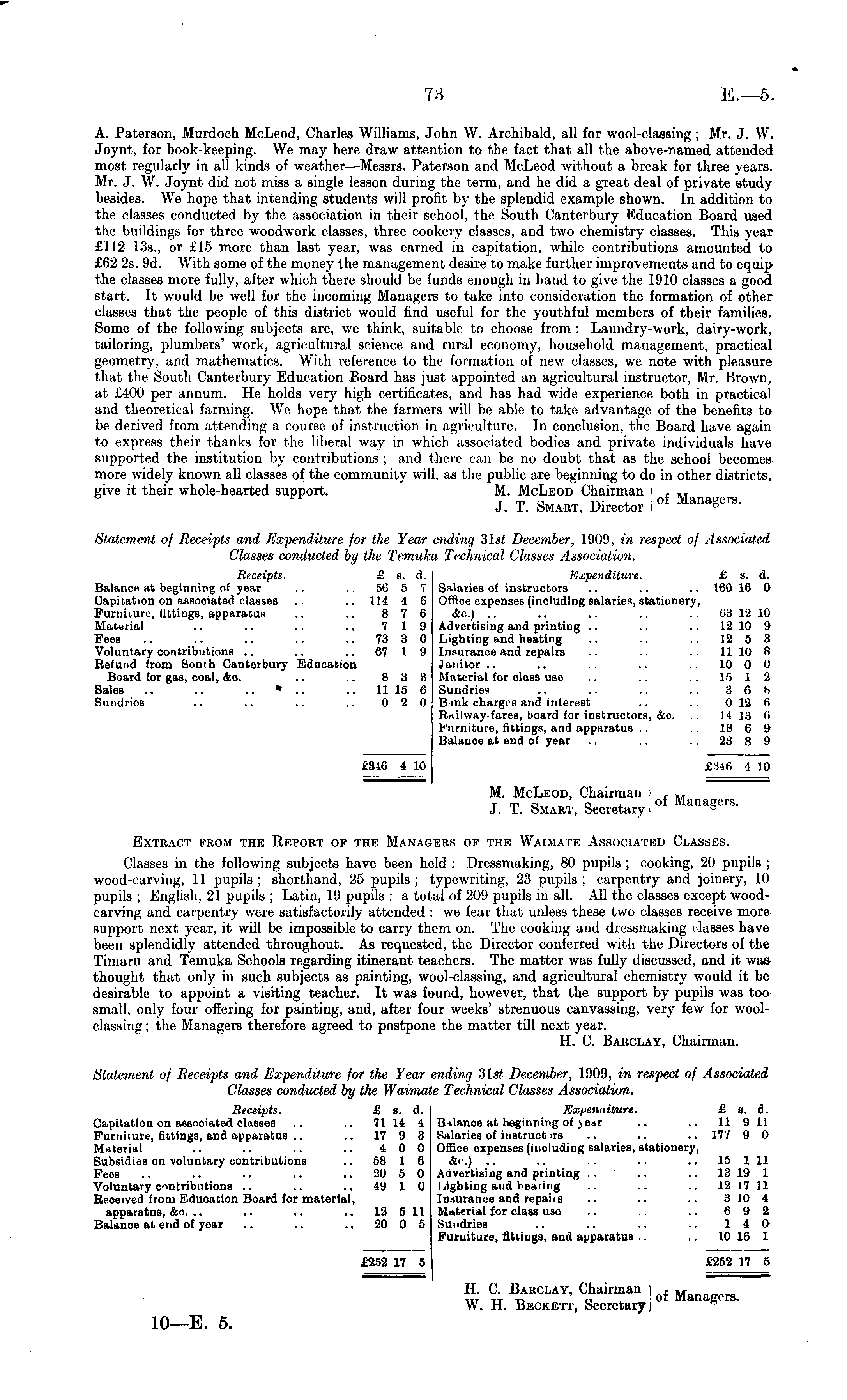 A. Paterson, Murdoch McLeod, Charles Williams, John W. Archibald, all for wool-classing ; Mr. J. W. Joynt, for book-keeping. We may here draw attention to the fact that all the above-named attended most regularly in all kinds of weather—Messrs. Paterson and McLeod without a break for three years. Mr. J. W. Joynt did not miss a single lesson during the term, and he did a great deal of private study besides. We hope that intending students will profit by the splendid example shown. In addition to the classes conducted by the association in their school, the South Canterbury Education Board used the buildings for three woodwork classes, three cookery classes, and two chemistry classes. This year £112 135., or £15 more than last year, was earned in capitation, while contributions amounted to £62 2s. 9d. With some of the money the management desire to make further improvements and to equip the classes more fully, after which there should be funds enough in hand to give the 1910 classes a good start. It would be well for the incoming Managers to take into consideration the formation of other classes that the people of this district would find useful for the youthful members of their families. Some of the following subjects are, we think, suitable to choose from : Laundry-work, dairy-work, tailoring, plumbers' work, agricultural science and rural economy, household management, practical geometry, and mathematics. With reference to the formation of new classes, we note with pleasure that the South Canterbury Education Board has just appointed an agricultural instructor, Mr. Brown, at £400 per annum. He holds very high certificates, and has had wide experience both in practical and theoretical farming. We hope that the farmers will be able to take advantage of the benefits to be derived from attending a course of instruction in agriculture. In conclusion, the Board have again to express their thanks for the liberal way in which associated bodies and private individuals have supported the institution by contributions ; and there can be no doubt that as the school becomes more widely known all classes of the community will, as the public are beginning to do in other districts, give it their whole-hearted support. M. McLeod Chairman I , M J. T. Smart, Director . ot Mana B erB - Statement of Receipts and Expenditure for the Year ending 31st December, 1909, in respect of Associated Classes conducted by the Temuka Technical Classes Association. Receipts. £ s. d. Expenditure. £ s. d. Balance at beginning of year .. .. .56 5 7 Salaries of instructors .. .. .. 160 16 0 Capitation on associated classes .. .. 114 4 6 Office expenses (including salaries, stationery, Furniture, fittings, apparatus .. .. 8 7 6 &o.) .. .. .. .. 63 12 10 Material .. .. .. .. 7 19 Advertising and printing .. .. .. 12 10 9 Fees .. .. .. .. 73 3 0 Lighting and heating .. .. .. 12 5 3 Voluntary contributions .. .. .. 67 1 9 Insurance and repairs .. .. .. 11 10 8 Refund from Soulh Canterbury Education Janitor .. .. .. .. 10 0 0 Board for gas, coal, &o. .. .. 8 3 3 Material for class use .. .. .. 15 1 2 Sales .. .. • .. 11 15 6 Sundries .. .. 3 6 8 Sundries .. .. .. .. 0 2 0 B<nk charges and interest .. 0 12 6 Railway-fares, board for instructors, &o. 14 13 6 Furniture, fittings, and apparatus .. 18 6 9 Balance at end of year .. .. 23 8 9 £316 4 10 £346 4 10 M. McLeod, Chairman i , „, T m _ _ ot Managers. J. T. Smart, Secretary i & Extract from the Report of the Managers of the Waimate Associated Classes. Classes in the following subjects have been held : Dressmaking, 80 pupils ; cooking, 20 pupils ; wood-carving, 11 pupils ; shorthand, 25 pupils ; typewriting, 23 pupils ; carpentry and joinery, 10 pupils ; English, 21 pupils ; Latin, 19 pupils : a total of 209 pupils in all. All the classes except woodcarving and carpentry were satisfactorily attended : we fear that unless these two classes receive more support next year, it will be impossible to carry them on. The cooking and dressmaking 'lasses have been splendidly attended throughout. As requested, the Director conferred with the Directors of the Timaru and Temuka Schools regarding itinerant teachers. The matter was fully discussed, and it was thought that only in such subjects as painting, wool-classing, and agricultural chemistry would it be desirable to appoint a visiting teacher. It was found, however, that the support by pupils was too small, only four offering for painting, and, after four weeks' strenuous canvassing, very few for woolclassing ; the Managers therefore agreed to postpone the matter till next year. H. C. Barclay, Chairman. Statement of Receipts and Expenditure for the Year ending 31st December, 1909, in respect of Associated Classes conducted by the Waimate Technical Classes Association. Receipts. £ s. d. Expenditure. £ a. 6. Capitation on associated classes .. .. 71 14 4 B-ilance at beginning of ;>e_r .. .. II 911 Furniiure, fittings, and apparatus .. .. 17 9 3 Salaries of instruct irs .. .. .. 177 9 0 Material .. .. .. .. 4 0 0 Office expenses (including salaries, stationery, Subsidies on voluntary contributions .. 58 1 6 (fee.) .. .. .. 15 111 Fees .. .. .. .. 20 5 0 Advertising and printing .. .. .. 13 19 1 Voluntary contributions .. .. .. 49 1 0 Lighting and healing .. .. .. 12 17 11 Received from Education Board for material, Insurance and repaiis .. .. .. 3 10 4 apparatus, &n. .. .. .. .. 12 511 Material for class use .. .. 6 9 2 Balanoe at end of year .. .. .. 20 0 5 Sundries .. .. .. .. 14 0 Furniture, fittings, and apparatus .. 10 16 1 £252 17 5 £252 17 5 H. C. Barclay, Chairman ) of Mana(rprs W. H. Beckett, Secretary) 8