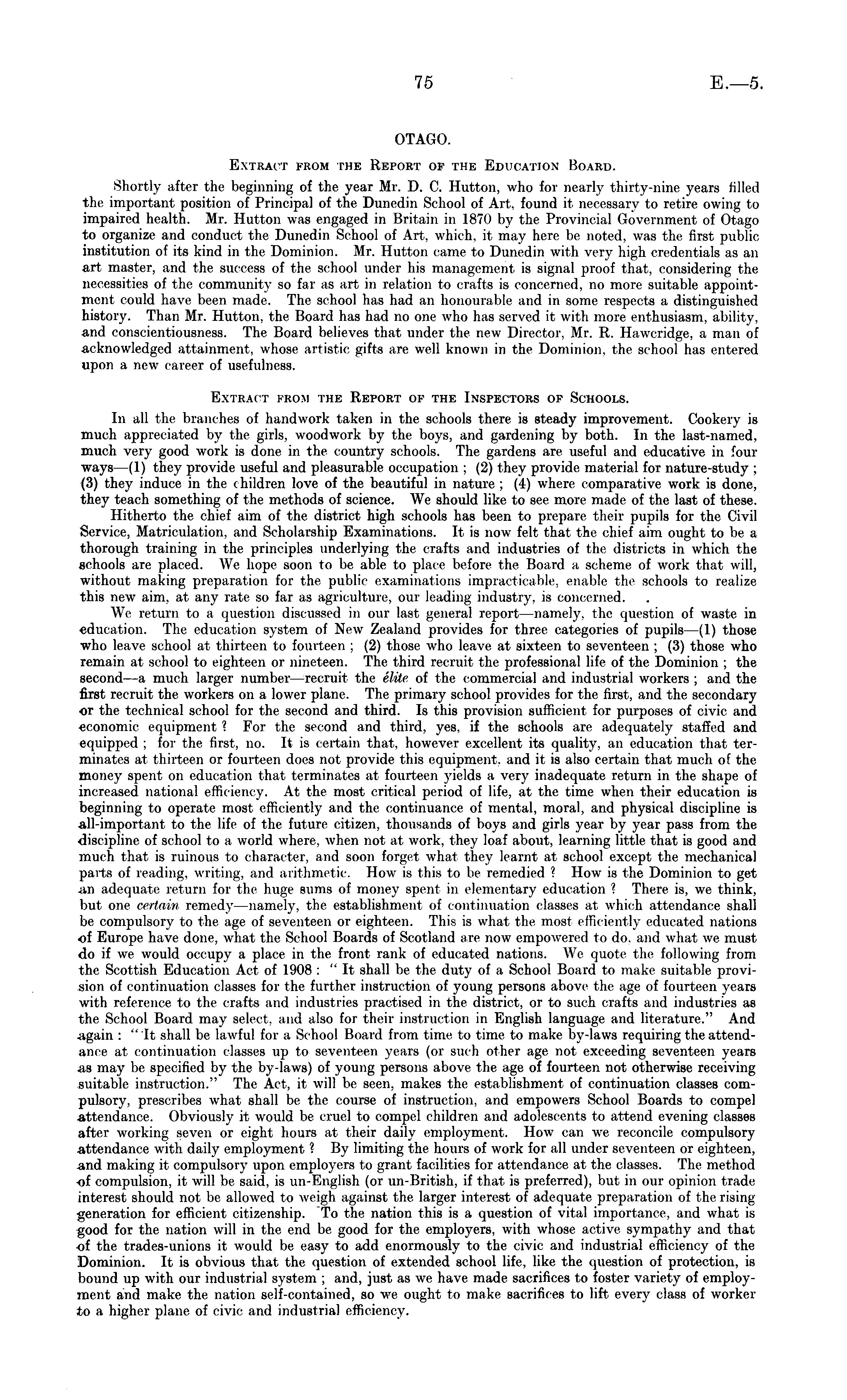 OTAGO. Extract from the Report op the Education Board. Shortly after the beginning of the year Mr. D. C. Hutton, who for nearly thirty-nine years filled the important position of Principal of the Dunedin School of Art. found it necessary to retire owing to impaired health. Mr. Hutton was engaged in Britain in 1870 by the Provincial Government of Otago to organize and conduct the Dunedin School of Art, which, it may here be noted, was the first public institution of its kind in the Dominion. Mr. Hutton came, to Dunedin with very high credentials as an art master, and the success of the school under his management is signal proof that, considering the necessities of the community so far as art in relation to crafts is concerned, no more suitable appointment could have been made. The school has had an honourable and in some respects a distinguished history. Than Mr. Hutton, the Board has had no one who has served it with more enthusiasm, ability, and conscientiousness. The Board believes that under the new Director, Mr. R. Hawcridge, a man of acknowledged attainment, whose artistic gifts are well known in the Dominion, the school has entered upon a new career of usefulness. Extract from the Report of the Inspectors of Schools. In all the branches of handwork taken in the schools there is steady improvement. Cookery is much appreciated by the girls, woodwork by the boys, and gardening by both. In the last-named, much very good work is done in the country schools. The gardens are useful and educative in four ways—(l) they provide useful and pleasurable occupation ; (2) they provide material for nature-study ; (3) they induce in the children love of the beautiful in nature ; (1) where comparative work is done, they teach something of the methods of science. We should like to see more made of the last of these. Hitherto the chief aim of the district high schools has been to prepare their pupils for the Civil Service, Matriculation, and Scholarship Examinations. It is now felt that the chief aim ought to be a thorough training in the principles underlying the crafts and industries of the districts in which the schools are placed. We hope soon to be able to place before the Board a scheme of work that will, without making preparation for the. public examinations impracticable, enable the schools to realize this new aim, at any rate so far as agriculture, our leading industry, is concerned. We return to a question discussed in our last general report —namely, the question of waste in education. The education system of New Zealand provides for three categories of pupils —(1) those who leave school at thirteen to fourteen ; (2) those who leave at sixteen to seventeen ; (3) those who remain at school to eighteen or nineteen. The third recruit the professional life of the Dominion ; the second —a much larger number —recruit the elite of the commercial and industrial workers ; and the first recruit the workers on a lower plane. The primary school provides for the first, and the secondary or the technical school for the second and third. Is this provision sufficient for purposes of civic and economic equipment ? For the second and third, yes. if the schools are adequately staffed and equipped ; for the first, no. It is certain that, however excellent its quality, an education that terminates at thirteen or fourteen does not provide this equipment, and it is also certain that much of the money spent on education that terminates at fourteen yields a very inadequate return in the shape of increased national efficiency. At the most critical period of life, at the time when their education is beginning to operate most efficiently and the continuance of mental, moral, and physical discipline is all-important to the life of the future citizen, thousands of boys and girls year by year pass from the discipline, of school to a world where, when not at work, they loaf about, learning little that is good and much that is ruinous to character, and soon forget what they learnt at school except the mechanical parts of reading, writing, and arithmetic. How is this to be remedied ? How is the Dominion to get an adequate return for the huge sums of money spent in elementary education ? There is, we think, but one certain remedy —namely, the establishment of continuation classes at which attendance shall be compulsory to the age of seventeen or eighteen. This is what the, most efficiently educated nations of Europe have done, what the School Boards of Scotland are now empowered to do, and what we must do if we would occupy a place in the front rank of educated nations. We quote the following from the Scottish Education Act of 1908 : "It shall be the duty of a School Board to make suitable provision of continuation classes for the further instruction of young persons above the age of fourteen years with reference to the crafts and industries practised in the district, or to such crafts and industries as the School Board may select, and also for their instruction in English language and literature." And ■again : " It shall be lawful for a School Board from time to time to make by-laws requiring the attendance at continuation classes up to seventeen years (or such other age not exceeding seventeen years as may be specified by the by-laws) of young persons above the age of fourteen not otherwise receiving suitable instruction." The Act, it will be seen, makes the establishment of continuation classes compulsory, prescribes what shall be the course of instruction, and empowers School Boards to compel attendance. Obviously it would be cruel to compel children and adolescents to attend evening classes after working seven or eight hours at their daily employment. How can we reconcile compulsory attendance with daily employment ? By limiting the hours of work for all under seventeen or eighteen, and making it compulsory upon employers to grant facilities for attendance at the classes. The method of compulsion, it wil