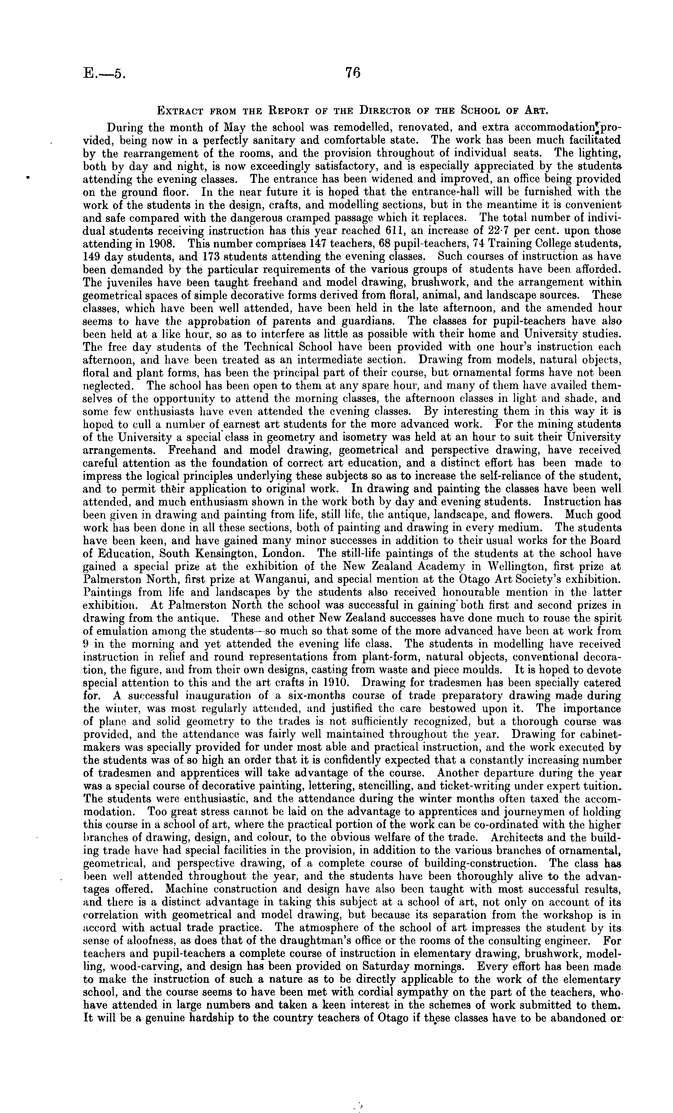 Extract from the Report of the Director of the School of Art. During the month of May the school was remodelled, renovated, and extra accommodation'provided, being now in a perfectly sanitary and comfortable state. The work has been much facilitated by the rearrangement of the rooms, and the provision throughout of individual seats. The lighting, both by day and night, is now exceedingly satisfactory, and is especially appreciated by the students attending the evening classes. The entrance has been widened and improved, an office being provided on the ground floor. In the near future it is hoped that the entrance-hall will be furnished with the work of the students in the design, crafts, and modelling sections, but in the meantime it is convenient and safe compared with the dangerous cramped passage which it replaces. The total number of individual students receiving instruction has this year reached 611, an increase of 22-7 per cent, upon those attending in 1908. This number comprises 147 teachers, 68 pupil-teachers, 74 Training College students, 149 day students, and 173 students attending the evening classes. Such courses of instruction as have been demanded by the particular requirements of the various groups of students have been afforded. The juveniles have been taught freehand and model drawing, brushwork, and the arrangement within geometrical spaces of simple decorative forms derived from floral, animal, and landscape sources. These classes, which have been well attended, have been held in the late afternoon, and the amended hour seems to have the approbation of parents and guardians. The classes for pupil-teachers have also been held at a like hour, so as to interfere as little as possible with their home and University studies. The free day students of the Technical School have been provided with one hour's instruction each afternoon, and have been treated as an intermediate section. Drawing from models, natural objects, floral and plant forms, has been the principal part of their course, but ornamental forms have not been neglected. The school has been open to them at any spare hour, and many of them have availed themselves of the opportunity to attend the morning classes, the afternoon classes in light and shade, and some few enthusiasts have even attended the evening classes. By interesting them in this way it is hoped to cull a number of earnest art students for the more advanced work. For the mining students of the University a special class in geometry and isometry was held at an hour to suit their University arrangements. Freehand and model drawing, geometrical and perspective drawing, have received careful attention as the foundation of correct art education, and a distinct effort has been made to impress the logical principles underlying these subjects so as to increase the self-reliance of the student, and to permit their application to original work. In drawing and painting the classes have been well attended, and much enthusiasm shown in the work both by day and evening students. Instruction has been given in drawing and painting from life, still life, the antique, landscape, and flowers. Much good work has been done in all these sections, both of painting and drawing in every medium. The students have been keen, and have gained many minor successes in addition to their usual works for the Board of Education, South Kensington, London. The still-life paintings of the students at the school have gained a special prize at the exhibition of the New Zealand Academy in Wellington, first prize at Palmerston North, first prize at Wanganui, and special mention at the Otago Art Society's exhibition. Paintings from life and landscapes by the students also received honourable mention in the latter exhibition. At Palmerston North the school was successful in gaining both first and second prizes in drawing from the antique. These and other New Zealand successes have done much to rouse the spirit of emulation among the students —so much so that some of the more advanced have been at work from 9 in the morning and yet attended the evening life class. The students in modelling have received instruction in relief and round representations from plant-form, natural objects, conventional decoration, the figure, and from their own designs, casting from waste and piece moulds. It is hoped to devote special attention to this and the art crafts in 1910. Drawing for tradesmen has been specially catered for. A successful inauguration of a six-months course of trade preparatory drawing made during the winter, was most regularly attended, and justified the care bestowed upon it. The importance of plane and solid geometry to the trades is not sufficiently recognized, but a thorough course was provided, and the attendance was fairly well maintained throughout the year. Drawing for cabinetmakers was specially provided for under most able and practical instruction, and the work executed by the students was of so high an order that it is confidently expected that a constantly increasing number of tradesmen and apprentices will take advantage of the course. Another departure during the year was a special course of decorative painting, lettering, stencilling, and ticket-writing under expert tuition. The students were enthusiastic, and the, attendance during the winter months often taxed the accommodation. Too great stress cannot be laid on the advantage to apprentices and journeymen of holding this course in a school of art, where the practical portion of the work can be co-ordinated with the higher branches of drawing, design, and colour, to the obvious welfare of the trade. Architects and the building trade have had special facilities in the provision, in addition to the various branches of ornamental, geometrical, and perspective drawing, of a complete course of building-construction. The class has been well attended throughout the year, and the students have been thoroughly alive to the advanta