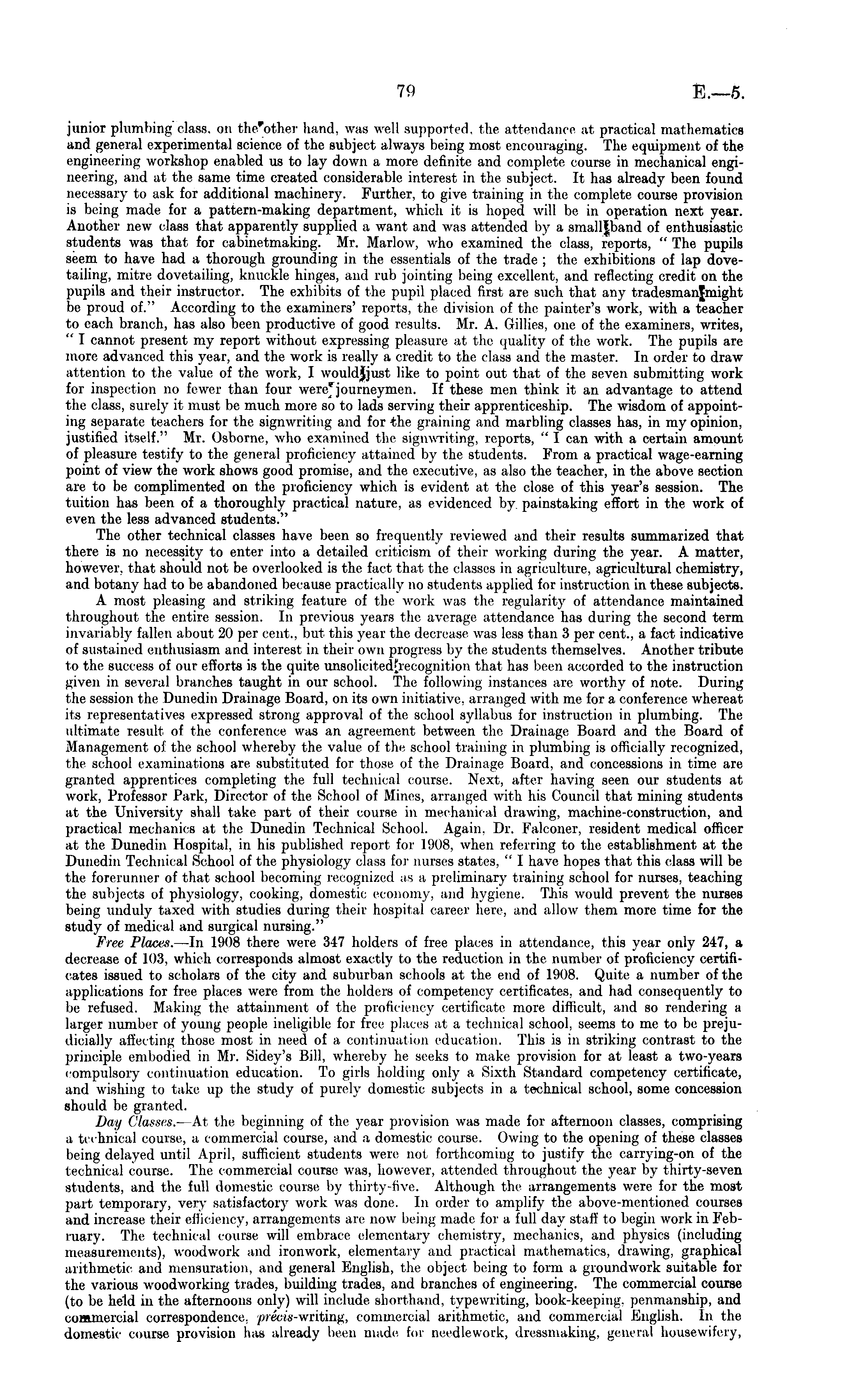 junior plumbing class, on the'other hand, was well supported, the attendance at practical mathematics and general experimental science of the subject always being most encouraging. The equipment of the engineering workshop enabled us to lay down a more definite and complete course in mechanical engineering, and at the same time created considerable interest in the subject. It has already been found necessary to ask for additional machinery. Further, to give training in the complete course provision is being made for a pattern-making department, which it is hoped will be in operation next year. Another new class that apparently supplied a want and was attended by a small|band of enthusiastic students was that for cabinetmaking. Mr. Marlow, who examined the class, reports, " The pupils seem to have had a thorough grounding in the essentials of the trade ; the exhibitions of lap dovetailing, mitre dovetailing, knuckle hinges, and rub jointing being excellent, and reflecting credit on the pupils and their instructor. The exhibits of the pupil placed first are such that any tradesmanjmight be proud of." According to the examiners' reports, the division of the painter's work, with a teacher to each branch, has also been productive of good results. Mr. A. Gillies, one of the examiners, writes, " I cannot present my report without expressing pleasure at the quality of the work. The pupils are more advanced this year, and the work is really a credit to the class and the master. In order to draw attention to the value of the work, I wouldjjust like to point out that of the seven submitting work for inspection no fewer than four were* journeymen. If these men think it an advantage to attend the class, surely it must be much more so to lads serving their apprenticeship. The wisdom of appointing separate teachers for the signwriting and for the graining and marbling classes has, in my opinion, justified itself." Mr. Osborne, who examined the signwriting, reports, " I can with a certain amount of pleasure testify to the general proficiency attained by the students. From a practical wage-earning point of view the work shows good promise, and the executive, as also the teacher, in the above, section are to be complimented on the proficiency which is evident at the close of this year's session. The tuition has been of a thoroughly practical nature, as evidenced by painstaking effort in the work of even the less advanced students." The other technical classes have been so frequently reviewed and their results summarized that there is no necessity to enter into a detailed criticism of their working during the year. A matter, however, that should not be overlooked is the fact that the classes in agriculture, agricultural chemistry, and botany had to be abandoned because practically no students applied for instruction in these subjects. A most pleasing and striking feature of the work was the regularity of attendance maintained throughout the entire session. In previous years the average attendance has during the second term invariably fallen about 20 per cent., but this year the decrease, was less than 3 per cent., a fact indicative of sustained enthusiasm and interest in their own progress by the students themselves. Another tribute to the success of our efforts is the quite unsolicitedjrecognition that has been accorded to the instruction given in several branches taught in our school. The following instances are worthy of note. During the session the Dunedin Drainage Board, on its own initiative, arranged with me for a conference whereat its representatives expressed strong approval of the school syllabus for instruction in plumbing. The ultimate result of the conference was an agreement between the Drainage Board and the Board of Management of the school whereby the value of the, school training in plumbing is officially recognized, the school examinations are substituted for those of the Drainage Board, and concessions in time are granted apprentices completing the full technical course. Next, after having seen our students at work, Professor Park, Director of the School of Mines, arranged with his Council that mining students at the University shall take part of their course in mechanical drawing, machine-construction, and practical mechanics at the Dunedin Technical School. Again, Dr. Falconer, resident medical officer at the Dunedin Hospital, in his published report for 1908, when referring to the establishment at the Dunedin Technical School of the physiology class for nurses states, " I have hopes that this class will be the forerunner of that school becoming recognized as a preliminary training school for nurses, teaching the subjects of physiology, cooking, domestic economy, and hygiene. This would prevent the nurses being unduly taxed with studies during their hospital career here, and allow them more time for the study of medical and surgical nursing." Free Places.—hi 1908 there were 347 holders of free places in attendance, this year only 247, a decrease of 108, which corresponds almost exactly to the reduction in the number of proficiency certificates issued to scholars of the city and suburban schools at the end of 1908. Quite a number of the applications for free places were from the holders of competency certificates, and had consequently to be refused. Making the attainment of the proficiency certificate more difficult, and so rendering a larger number of young people ineligible for free places at a technical school, seems to me to be prejudicially affecting those most in need of a continuation education. This is in striking contrast to the principle embodied in Mr. Sidey's Bill, whereby he seeks to make provision for at least a two-years compulsory continuation education. To girls holding only a Sixth Standard competency certificate, and wishing to take up the study of purely domestic subjects in a technical school, some concession should be granted. Day Classes. —At the beginning o