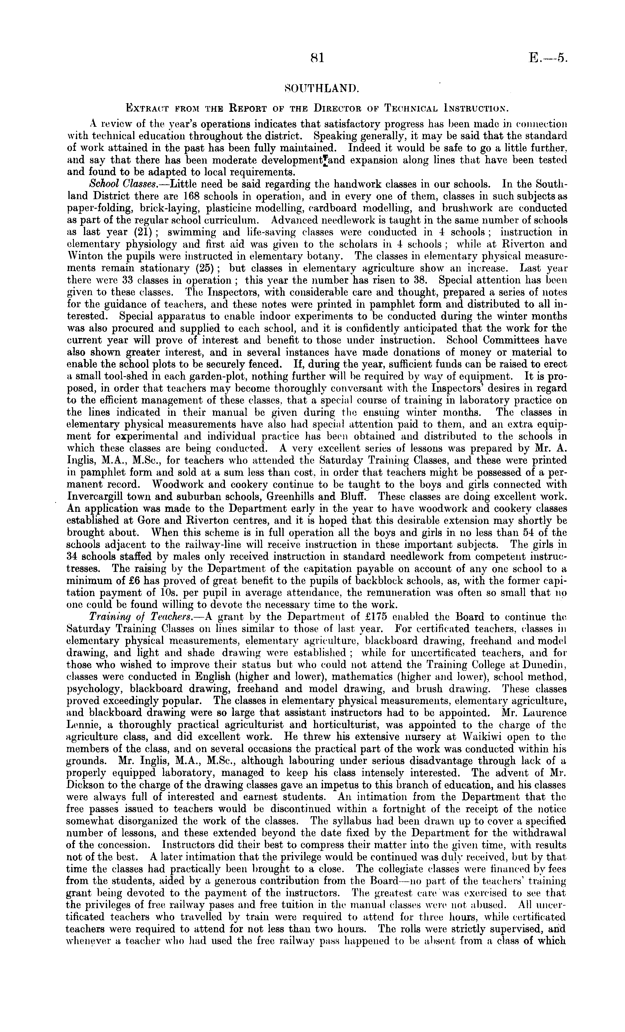 SOUTHLAND. Extract from the Report of the Director of Technical Instruction. A review of the year's operations indicates that satisfactory progress has been made in connection with technical education throughout the district. Speaking generally, it may be said that the standard of work attained in the past has been fully maintained. Indeed it would be safe to go a little further, and say that there has been moderate development_and expansion along lines that have been tested and found to be adapted to local requirements. School Classes. —Little need be said regarding the handwork classes in our schools. In the Southland District there are 168 schools in operation, and in every one of them, classes in such subjects as paper-folding, brick-laying, plasticine modelling, cardboard modelling, and brushwork are conducted as part of the regular school curriculum. Advanced needlework is taught in the same number of schools as last year (21) ; swimming and life-saving classes were conducted in 4 schools ; instruction in elementary physiology and first aid was given to the scholars in 4 schools ; wdiile at Riverton and Winton the pupils were instructed in elementary botany. The classes in elementary physical measurements remain stationary (25) ; but classes in elementary agriculture show an increase. Last year there were 33 classes in operation ; this year the number has risen to 38. Special attention has been given to these classes. The Inspectors, with considerable care and thought, prepared a series of notes for the guidance of teachers, and these notes were printed in pamphlet form and distributed to all interested. Special apparatus to enable indoor experiments to be conducted during the winter months was also procured and supplied to each school, and it is confidently anticipated that the work for the current year will prove of interest and benefit to those under instruction. School Committees have also shown greater interest, and in several instances have made donations of money or material to enable the school plots to be securely fenced. If, during the year, sufficient funds can be raised to erect a small tool-shed in each garden-plot, nothing further will be required by way of equipment. It is proposed, in order that teachers may become thoroughly conversant with the Inspectors' desires in regard to the efficient management of these classes, that a special course of training in laboratory practice on the lines indicated in their manual be given during the ensuing winter months. The classes in elementary physical measurements have also had special attention paid to them, and an extra equipment for experimental and individual practice has been obtained and distributed to the schools in which these classes are being conducted. A very excellent series of lessons was prepared by Mr. A. Inglis, M.A., M.Sc, for teachers who attended the Saturday Training Classes, and these were printed in pamphlet form and sold at a sum less than cost, in order that teachers might be, possessed of a permanent record. Woodwork and cookery continue to be taught to the boys and girls connected with Invercargill town and suburban schools, Greenhills and Bluff. These classes are doing excellent work. An application was made to the Department early in the year to have woodwork and cookery classes established at Gore and Riverton centres, and it is hoped that this desirable extension may shortly be brought about. When this scheme is in full operation all the boys and girls in no less than 54 of the schools adjacent to the railway-line will receive instruction in these important subjects. The girls in 34 schools staffed by males only received instruction in standard needlework from competent instructresses. The raising by the Department of the capitation payable on account of any one school to a minimum of £6 has proved of great benefit to the pupils of backblock schools, as, with the former capitation payment of 10s. per pupil in average attendance, the remuneration was often so small that no one could be found willing to devote the necessary time to the work. Training of Teachers. —A grant by the Department of £175 enabled the Board to continue the Saturday Training Classes on lines similar to those of last year. For certificated teachers, classes in elementary physical measurements, elementary agriculture, blackboard drawing, freehand and model drawing, and light and shade drawing were established ; while for uncertificated teachers, and for those who wished to improve their status but who could not attend the Training College at Dunedin, classes were conducted in English (higher and lower), mathematics (higher and lower), school method, psychology, blackboard drawing, freehand and model drawing, and brush drawing. These classes proved exceedingly popular. The classes in elementary physical measurements, elementary agriculture, and blackboard drawing were so large that assistant instructors had to be appointed. Mr. Laurence Lennie, a thoroughly practical agriculturist and horticulturist, was appointed to the charge of the agriculture class, and did excellent work. He threw his extensive nursery at Waikiwi open to the, members of the class, and on several occasions the practical part of the work was conducted within his grounds. Mr. Inglis, M.A., M.Sc, although labouring under serious disadvantage through lack of a properly equipped laboratory, managed to keep his class intensely interested. The advent of Mr. Dickson to the charge of the drawing classes gave an impetus to this branch of education, and his classes were always full of interested and earnest students. An intimation from the Department that the free passes issued to teachers would be discontinued wdthin a fortnight of the receipt of the notice somewhat disorganized the work of the classes. The syllabus had been drawn up to cover a specified number of lessons, and these extended beyond the date fixed by the Department for the withdrawal of the conce