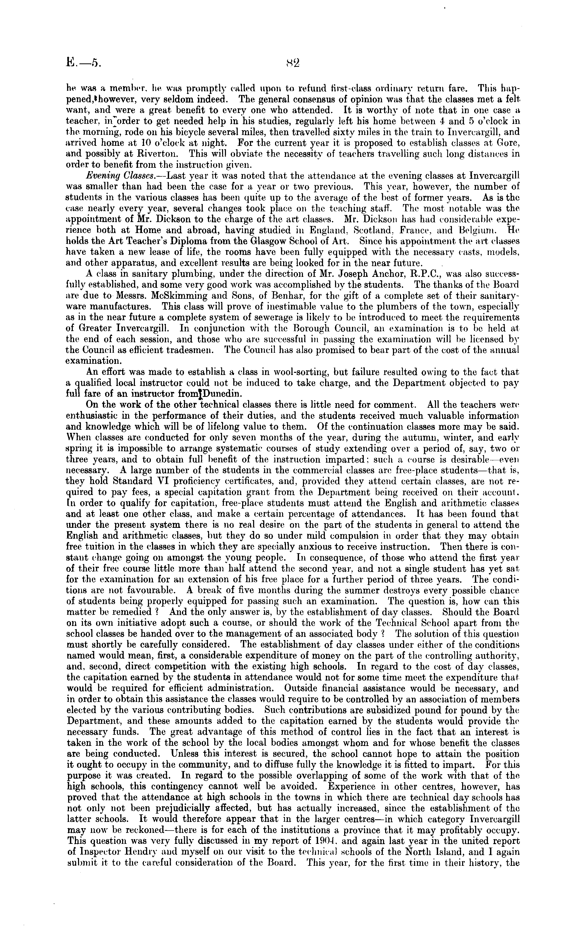 he was a member, he was promptly called upon to refund lirst class ordinary return fare. This happened,* however, very seldom indeed. The, general consensus of opinion was that the classes met a felt want, and were a great benefit to every one who attended. It is worthy of note that in one case a teacher, in-order to get needed help in his studies, regularly left his home between 4 and 5 o'clock in the morning, rode on his bicycle several miles, then travelled sixty miles in the train to Invercargill, and arrived home at 1" o'clock at night. For the current year it is proposed to establish classes at Gore, and possibly at Riverton. This will obviate the necessity of teachers travelling such long distances in order to benefit from the instruction given. Evening Classes. —Last year it was noted that the attendance at the evening classes at Invercargill was smaller than had been the case for a year or two previous. This year, however, the number of students in the various classes has been quite up to the average of the best of former years. As is the case nearly every year, several changes took place on the teaching staff. The most notable was the appointment of Mr. Dickson to the charge of the art classes. Mr. Dickson has had considerable experience both at Home and abroad, having studied in England, Scotland, France, and Belgium. He holds the Art Teacher's Diploma from the Glasgow School of Art. Since his appointment the art classes have taken a new lease of life, the rooms have been fully equipped with the necessary casts, models, and other apparatus, and excellent results are being looked for in the near future. A class in sanitary plumbing, under the direction of Mr. Joseph Anchor, R.P.C., was also successfully established, and some very good work was accomplished by the students. The thanks of the Board are due to Messrs. McSkimming and Sons, of Benhar, for the gift of a complete set of their sanitaryware manufactures. This class wall prove of inestimable value to the plumbers of the town, especially as in the near future a complete system of sewerage is likely to be introduced to meet the requirements of Greater Invercargill. In conjunction with the Borough Council, an examination is to be. held at the end of each session, and those who are successful in passing the examination will be licensed by the Council as efficient tradesmen. The Council has also promised to bear part of the cost of the annual examination. An effort was made to establish a class in wool-sorting, but failure resulted owing to the fact that a qualified local instructor could not be induced to take charge, and the Department objected to pay full fare of an instructor fromJDunedin. On the work of the other technical classes there is little need for comment. All the teachers were enthusiastic in the performance of their duties, and the students received much valuable information and knowledge which will be of lifelong value to them. Of the continuation classes more may be said. When classes are conducted for only seven months of the year, during the autumn, winter, and early spring it is impossible to arrange systematic courses of study extending over a period of, say, two or three years, and to obtain full benefit of the instruction imparted; such a course is desirable —even necessary. A large number of the students in the commercial classes are free-place students —that is, they hold Standard VI proficiency certificates, and, provided they attend certain classes, are not required to pay fees, a special capitation grant from the. Department being received on their account. In order to qualify for capitation, free-place students must attend the English and arithmetic classes and at least one other class, and make a certain percentage of attendances. It has been found that under the present system there is no real desire on the part of the, students in general to attend the English and arithmetic classes, but they do so under mild compulsion in order that they may obtain free tuition in the classes in which they are specially anxious to receive instruction. Then there is constant change going on amongst the young people. In consequence, of those who attend the first year of their free course little more than half attend the second year, and not a single student has yet sat for the examination for an extension of his free place for a further period of three years. The conditions are not favourable. A break of five months during the summer destroys every possible chance of students being properly equipped for passing such an examination. The question is, how can this matter be remedied ? And the only answer is, by the establishment of day classes. Should the Board on its own initiative adopt such a course, or should the work of the Technical School apart from the school classes be handed over to the management of an associated body ? The, solution of this question must shortly be, carefully considered. The establishment of day classes under either of the conditions named would mean, first, a considerable expenditure of money on the part of the controlling authority, and. second, direct competition with the existing high schools. In regard to the cost of day classes, the capitation earned by the students in attendance would not for some time meet the expenditure that would be required for efficient administration. Outside financial assistance would be necessary, and in order to obtain this assistance the classes would require to be controlled by an association of members elected by the various contributing bodies. Such contributions are subsidized pound for pound by the, Department, and these amounts added to the capitation earned by the students would provide the necessary funds. The great advantage of this method of control lies in the fact that an interest is taken in the work of the school by the local bodies amongst whom and for whose benefit the classes are being conducted. Unless this interest is secured, 