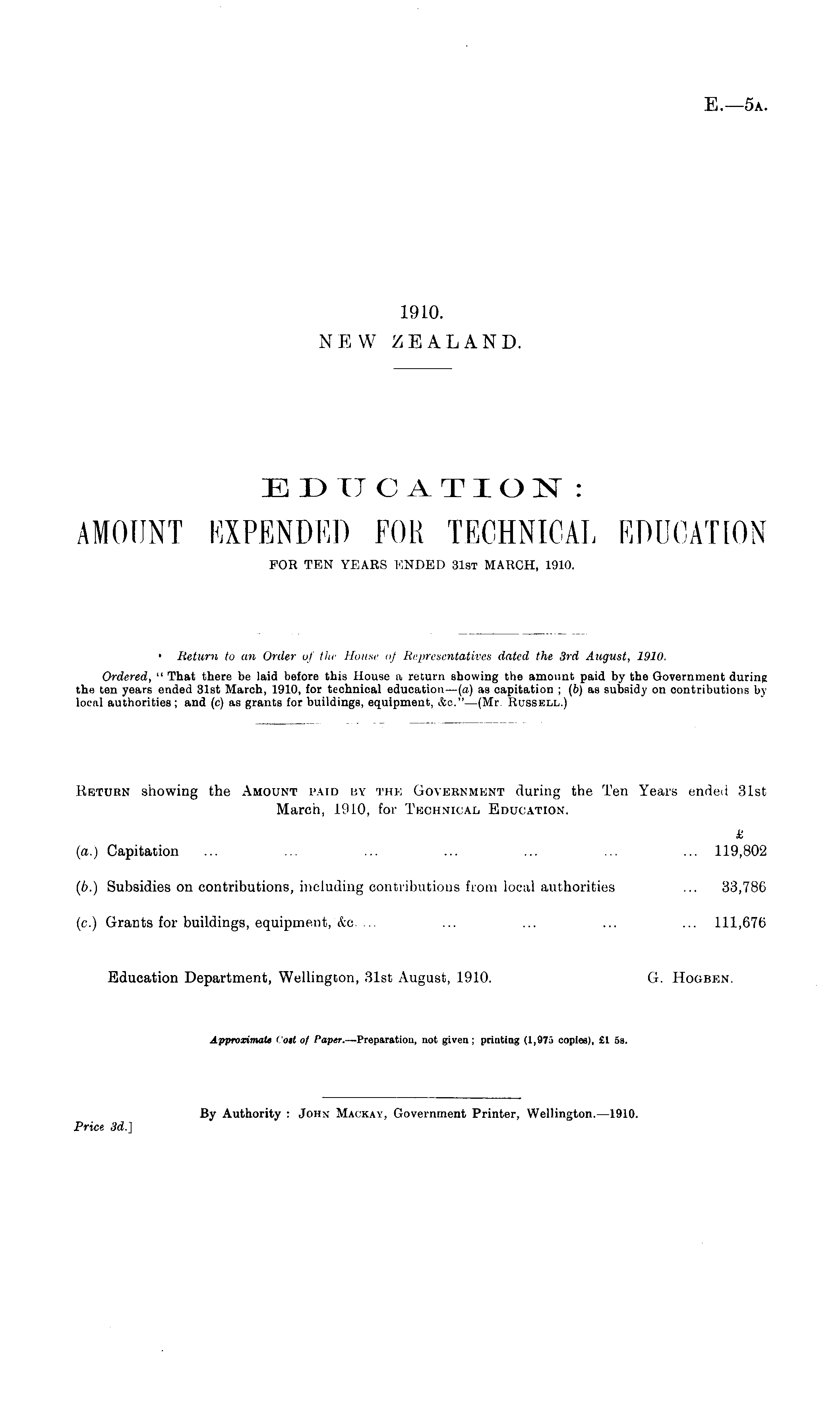 • Return to an Order of the House of Representatives dated the 3rd August, 1910. Ordered, " That there be laid before this House a return showing the amount paid by the Government during the ten years ended 31st March, 1910, for technical education — (a) as capitation ; (6) as subsidy on contributions by local authorities; and (c) as grants for buildings, equipment, &c."—(Mr Russell.)