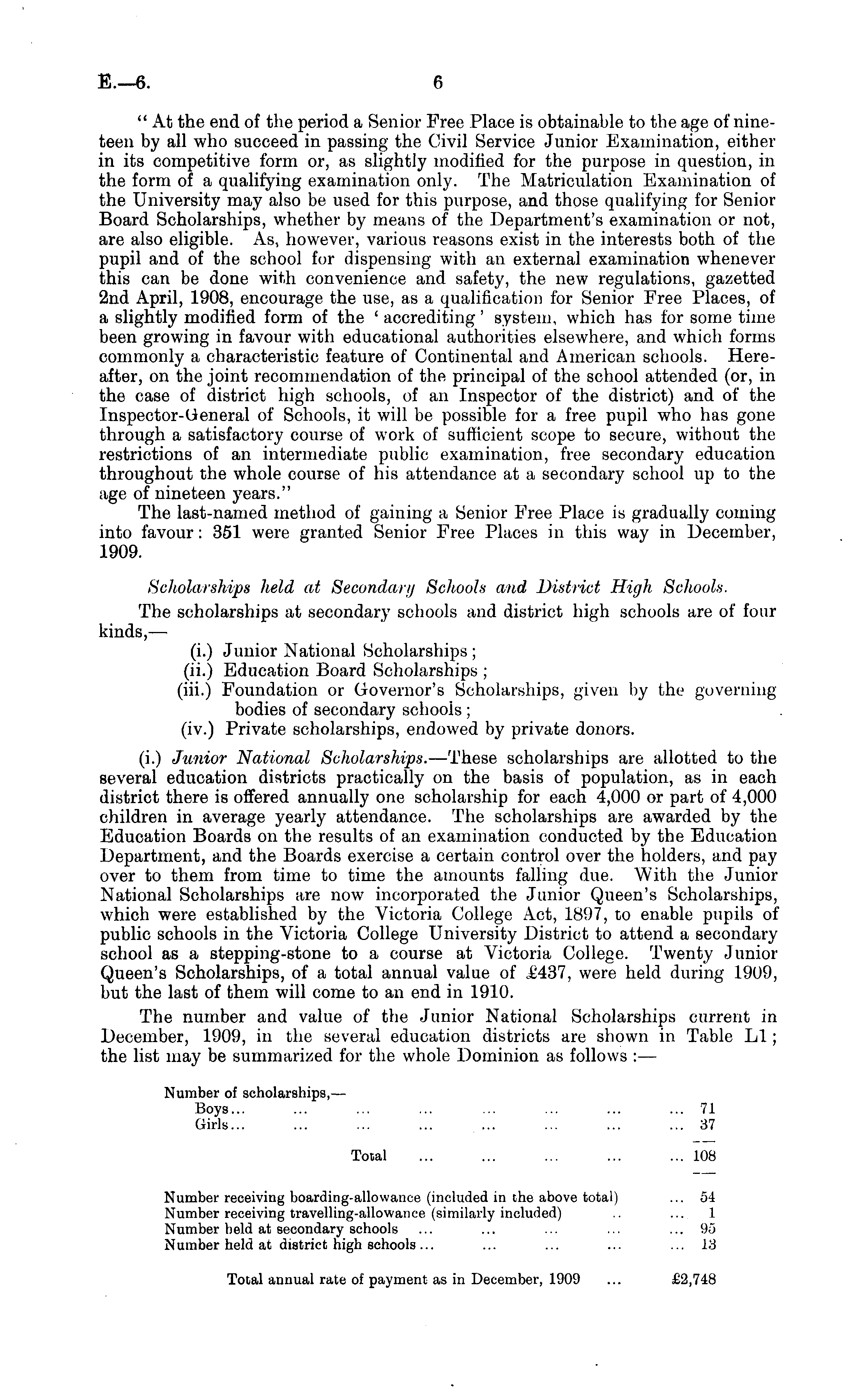 " At the end of the period a Senior Free Place is obtainahle to the age of nineteen by all who succeed in passing the Civil Service Junior Examination, either in its competitive form or, as slightly modified for the purpose in question, in the form of a qualifying examination only. The Matriculation Examination of the University may also be used for this purpose, and those qualifying for Senior Board Scholarships, whether by means of the Department's examination or not, are also eligible. As, however, various reasons exist in the interests both of the pupil and of the school for dispensing with an external examination whenever this can be done with convenience and safety, the new regulations, gazetted 2nd April, 1908, encourage the use, as a qualification for Senior Free Places, of a slightly modified form of the ' accrediting' system, which has for some time been growing in favour with educational authorities elsewhere, and which forms commonly a characteristic feature of Continental and American schools. Hereafter, on the joint recommendation of the principal of the school attended (or, in the case of district high schools, of an Inspector of the district) and of the Inspector-General of Schools, it will be possible for a free pupil who has gone through a satisfactory course of work of sufficient scope to secure, without the restrictions of an intermediate public examination, free secondary education throughout the whole course of his attendance at a secondary school up to the age of nineteen years." The last-named method of gaining a Senior Free Place is gradually coming into favour: 351 were granted Senior Free Places in this way in December, 1909. Scholarsliips held at Secondary Schools and District High Schools. The scholarships at secondary schools and district high schools are of four kinds, — (i.) Junior National Scholarships ; (ii.) Education Board Scholarships ; (iii.) Foundation or Governor's Scholarships, given by the governing bodies of secondary schools; (iv.) Private scholarships, endowed by private donors. (i.) Junior National Scholarships. —These scholarships are allotted to the several education districts practically on the basis of population, as in each district there is offered annually one scholarship for each 4,000 or part of 4,000 children in average yearly attendance. The scholarships are awarded by the Education Boards on the results of an examination conducted by the Education Department, and the Boards exercise a certain control over the holders, and pay over to them from time to time the amounts falling due. With the Junior National Scholarships are now incorporated the Junior Queen's Scholarships, which were established by the Victoria College Act, 1897, to enable pupils of public schools in the Victoria College University District to attend a secondary school as a stepping-stone to a course at Victoria College. Twenty Junior Queen's Scholarships, of a total annual value of .£437, were held during 1909, but the last of them will come to an end in 1910. The number and value of the Junior National Scholarships current in December, 1909, in the several education districts are shown in Table LI; the list may be summarized for the whole Dominion as follows : — Number of scholarships,— 80y5... ... ... ... ... ... ... ... 71 Girls... ... ... ... ... ... ... ... 37 Toial ... ... ... ... ... 108 Number receiving hoarding-allowance (included in the above total) ... 54 Number receiving travelling-allowance (similarly included) .. ... ] Number held at secondary schools ... ... ... ... ...95 Number held at district high schools ... ... ... ... ... 13 Total annual rate of payment as in December, 1909 ... £2,748