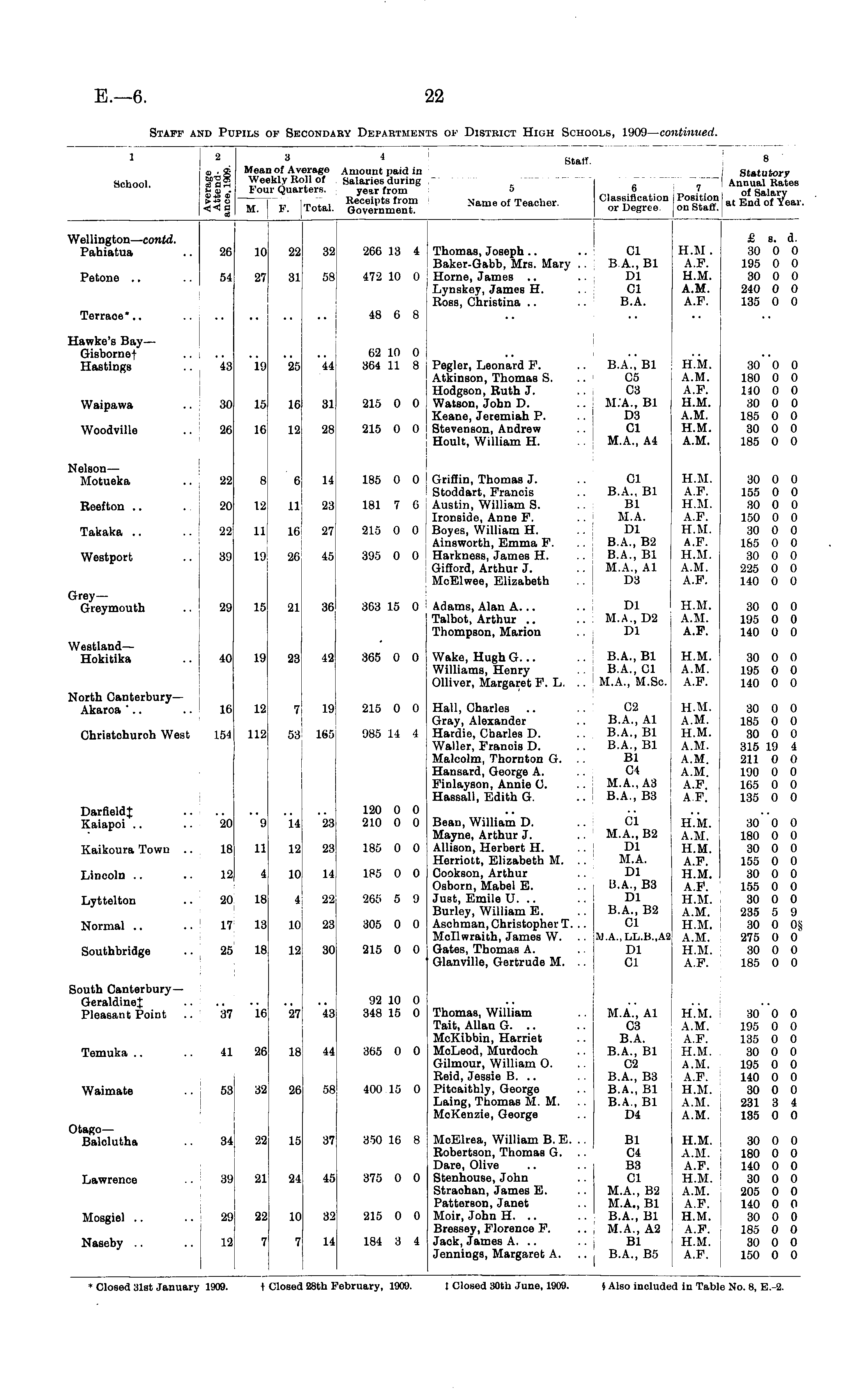 1 2 3 3 of Av ;kly R. II Quai F. 4 Staff. 8 School. Meai Wei Foi erage Amount paid in 'U of Salaries during •ters. year from Keceipts from Total. Government. 6 7 „„„,„ _ f TennJioi- Classification Position Name of Teacher. or Degree, on Staff. Statutory Annual Rates of Salary at End of Year. II. Wellington— contd. Pabiatua Petone .. 26 54 20 54 10 27 10 27 22 31 32 58 266 13 4 472 10 0 Thomas, Joseph .. .. CI Baker-Gabb, Mrs. Mary .. B.A., Bl Home, James .. .. Dl Lynskey, James H. .. CI Ross, Christina .. .. B.A. I H.M . A.P. H.M. A.M. A.P. £ s. d. 30 0 0 195 0 0 30 0 0 240 0 0 135 0 0 Terraoe*.. 48 6 8 Hawke's Bay— Gisbornef Hastings .. 43 '43 i9 i9 25 44 62 10 0 364 11 8 Pegler, Leonard P. .. B.A., Bl Atkinson, Thomas S. .. C5 Hodgson, Ruth J. . . C3 Watson, John D. .. M.A., Bl Keane, Jeremiah P. .. D3 Stevenson, Andrew .. CI Hoult, William H. M.A., A4 H.M. A.M. A.F. H.M. A.M. H.M. A.M. 30 0 0 180 0 0 110 0 0 30 0 0 185 0 0 30 0 0 185 0 0 Waipawa 30 80 15 15 31 215 0 0 16 Woodville 26 26 16 16 12 28 215 0 0 Nelson— Motueka 22 8 185 0 0 Griffin, Thomas J. .. CI Stoddart, Francis .. B.A., Bl Austin, William S. .. Bl Ironside, Anne F. . . M.A. Boyes, William H. .. Dl Ainsworth, Emma F. .. B.A., B2 Harkness, James H. .. B.A., Bl Gifford, Arthur J. .. M.A., Al McElwee, Elizabeth .. D3 H.M. A.P. B.M. A.P. H.M. A.P. H.M. A.M. A.P. 30 0 0 155 0 0 30 0 0 150 0 0 30 0 0 1&5 0 0 30 0 0 225 0 0 140 0 0 22 8 6 14 Reefton 20 20 12 12 11 23 181 7 6 Takaka 22 22 11 11 16 27 215 0 0 Westport 39 3'.) 19 111 20 16 395 0 0 Grey— Greymouth 29 15 363 15 0 Adams, Alan A. .. .. Dl Talbot, Arthur .. .. M.A., D2 Thompson, Marion .. Dl 1 H.M. a.jr. A.P. 30 0 0 195 0 0 140 0 0 29 16 21 36 Westland— Hokitika 40 19 365 0 0 Wake, Hugh G. .. .. B.A., Bl Williams, Henry .. B.A., CI Olliver, Margaret F. L. .. M.A., M.Sc. H.M. A.M. A.P. 30 0 0 195 0 0 140 0 0 10 19 23 12 North Canterbury— Akaroa 16 12 215 0 0 H.M. A.M. H.M. A.M. A.M. A.M. A.F. A.P. 30 0 0 185 0 0 30 0 0 315 19 4 211 0 0 190 0 0 165 0 0 135 0 0 Christohuroh West 154 112 12 112 7 53 19 165 985 14 i Hall, Charles .. .. C2 Gray, Alexander .. B.A., Al Hardie, Charles D. .. B.A., Bl J Waller, Franois D. .. B.A., Bl 1 Malcolm, Thornton G. .. Bl Hansard, George A. .. C4 Finlayson, Annie C. .. M.A..A3 Hassall, Edith G. .. B.A., B3 120 0 0 210 0 0 DarfieldJ Kaiapoi 20 "9 "9 14 23 Beau, William D. .. CI Mayne, Arthur J. .. M.A., B2 Allison, Herbert H. .. Dl Herriott, Elizabeth M. .. M.A. Cookson, Arthur .. Dl Osborn, Mabel E. .. 13.A., B3 Just, Emile U. .. .. Dl Burley, William E. .. j B.A., B2 '■ Aschman,ChristopherT. .. j CI Mcllwraith, James W. .. M.A.,LL.B.,A2 Gates, Thomas A. .. Dl Glanville, Gertrude M. .. CI II.M. A.M. H.M. A.P. H.M. A.F. I H.M. A.M. i H.M. ! A.M. H.M. A.F. ! 30 0 0 180 0 0 30 0 0 155 0 0 30 0 0 155 0 0 30 0 0 235 5 9 30 0 0! 275 0 0 30 0 0 185 0 0 Kaikoura Town .. 18 11 11 12 23 185 0 0 Lincoln 12 4 4 10 14 185 0 0 Lyttelton 20 18 18 4 22 265 5 9 Normal 17 13 13 10 23 305 0 0 Southbridge 25 18 18 12 30 215 0 0 South Canterbury— GeraldineJ Pleasant Point 37 16 is 92 10 0 348 15 0 Thomas, William .. M.A., Al Tait, Allan G. .. .. C3 McKibbin, Harriet .. B.A. McLeod, Murdoch .. B.A., Bl Gilmour, William 0. .. C2 Reid, Jessie B. .. .. B.A., B3 Pitcaithly, George .. B.A., Bl Laing, Thomas M. M. .. B.A., Bl MoKenzie, George .. D4 H.M. A.M. A.F. H.M. A.M. A.F. H.M. A.M. A.M. H.M. A.M. A.P. H.M. A.M. A.F. H.M. A.P. H.M. A.F. 30 0 0 195 0 0 135 0 0 30 0 0 195 0 0 140 0 0 30 0 0 231 3 4 135 0 0 30 0 0 180 0 0 140 0 0 30 0 0 205 0 0 140 0 0 30 0 0 185 0 0 30 0 0 150 0 0 27 Temuka, 41 26 18 14 365 0 0 Waimate 53 32 32 36 68 400 15 0 Otago— Balclutha 34 22 22 15 87 350 16 8 McElrea, William B. E. .. Bl Robertson, Thomas G. .. C4 Dare, Olive .. .. B3 Stenhouse, John .. CI Straohan, James E. .. M.A., B2 Patterson, Janet .. M.A., Bl Moir.JohnH. .. .. B.A., Bl Bressey, Florence P. ..I M.A., A2 Jack, James A. .. .. j Bl Jennings, Margaret A. ... B.A., B5 Lawrence 39 21 21 24 16 375 0 0 Mosgiel Naseby 29 12 22 7 22 10 32 215 0 0 7 7 14 184 3 4 • Closed 31st January 1909. t Closed 28th February, 1909. i Closed 30th June, 1909. i Also included in Table No. 8, E.-2.