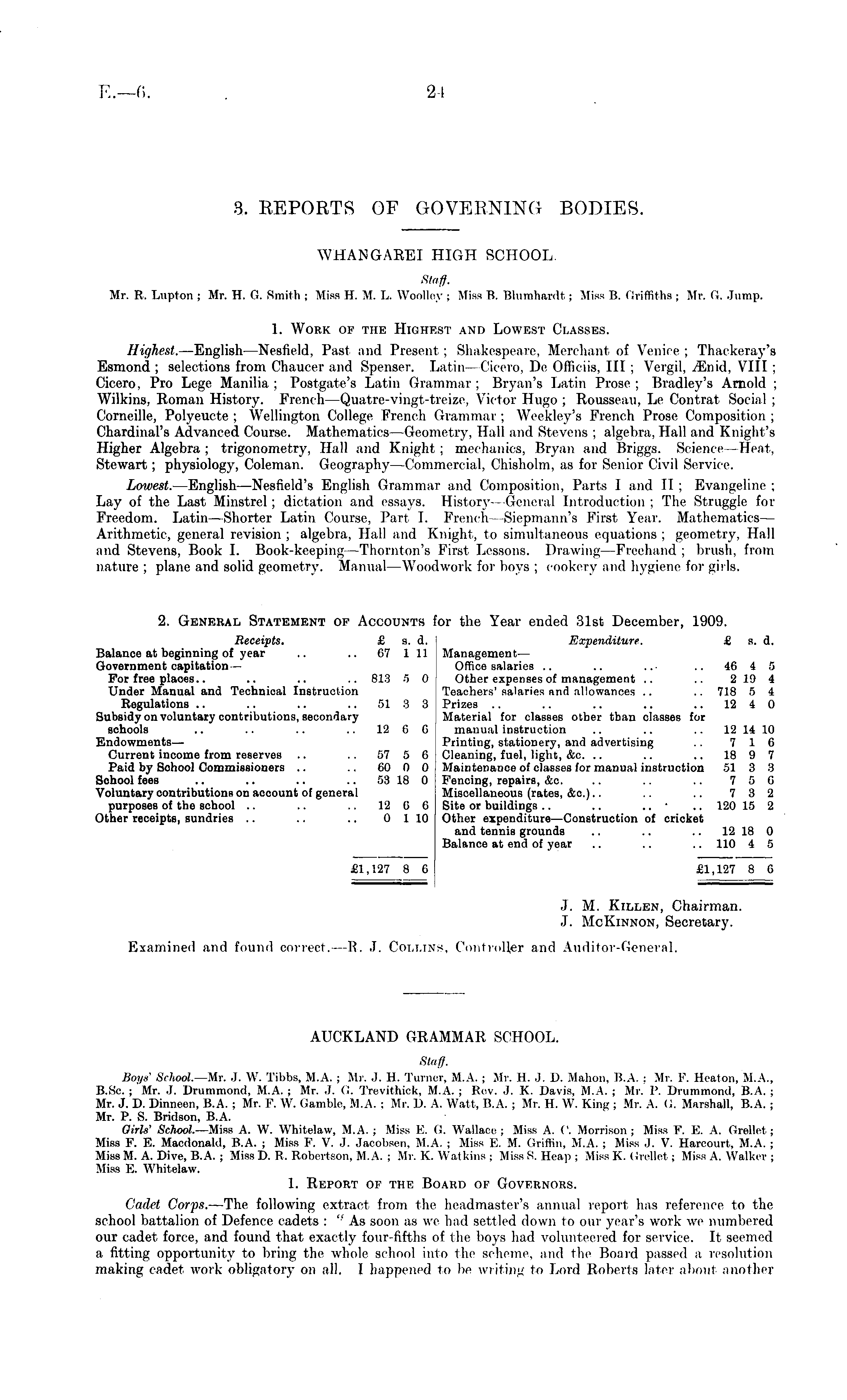 AUCKLAND GRAMMAR SCHOOL. Staff. Boys , School— .Mr. .1. \V. Tibbs, M.A. : Mr. J. 11. Turner, M.A. ; Mr. 11. J. D. Mahon, B.A. : Mr. F. Heaton, M.A.. B.Sc. ; Mr. J. Drummond, M.A. ; Mr. J. (J. Trevithick, M.A. ; Eev. J. K. Davis, M.A. ; Mr. P. Drummond, B.A. ; Mr. J. D. Dinneen, B.A. ; Mr. F. W. Gamble, M.A. : Mr. D. A. Watt, B.A. ; Mr. H. W. Kins; : Mr. A. G. Marshall, B.A. ; Mr. P. S. Bridson, B.A. QirU , School— Miss A. \\. Wliitelaw, M.A. ; Miss E. G. Wallace; Miss A. C. Morrison; Miss P. E. A. Grellet : Miss F. E. Macdonald, B.A. ; Miss F. V. J. Jacobsen, M.A. ; Miss E. M. Griffin, M.A. : .Miss .1. V. Harcourt, M.A. ; Miss M. A. Dive, B.A. ; Miss D. R. Robertson, M.A. ; Mr. K. Watkins : Miss 8. Heap; Miss K. Grellet; Miss A. Walker ; Miss E. Whitelaw. 1. Report of the Board op Governors. Cadet Corps. —The following extract from the headmaster's annual report has reference to the school battalion of Defence cadets : " As soon as we had settled down to our year's work we numbered our cadet force, and found that exactly four-fifths of the boys had volunteered for service. It seemed a fitting opportunity to bring the whole school into the scheme, and the Board passed a resolution making cadet work obligatory on all. I happened to be writing to Lord Roberts later aboul another