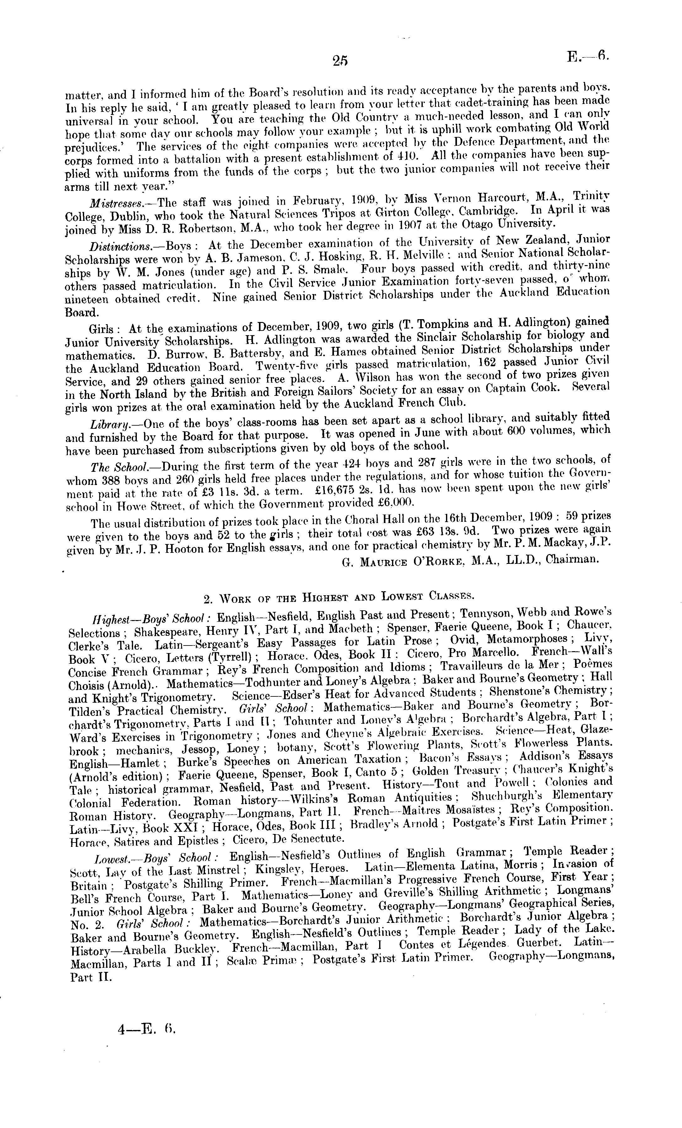 matter ;m(l i informed him of the Board's resolution and its ready acceptance by the parents and boys. In his reply be said, ' I am greatly pleased to learn from your letter thai cadet-training has been mad, universal in v,,ur school. You are teaching the Old Country a much-needed lesson and [can only 1,,,,,,, thai 50,,,,, day our schools may follow your example : but H is uphiU work combating Old World prejudices.' The services of the eighi companies were accepted by the Defence Department, and the corps formed into a battalion will, a preeeni establishment of 110. All the companies have 1,.-.-,, supplied with uniforms Erom the funds of the corps : but the two junior companies will not receive tneir arms till next year. Mistresses. The staff was joined in February, 1909, by Miss Vernon Harcourt M.A., Trinity College, Dublin, who took the Natural Sciences Tripos at Oirton College, Cambridge. In April ,r was joined by Miss D. R. Robertson, M.A.. who took ber degree in 1907 ai the Otago I niversity. Distmctions.-Boys : At the December examination of the University of New Zealand Junior Scholarships were won by A. B. Jameson, C. J. Kosking R. H Melville and Senior National Schokrships by W. M. Jones (under age) and l>. S. Smale. Four boys passed with credit, and t1,,,n-nn, others passed matriculation. In the Civil Service Junior Exammation orty-seven passed,_o whom nineteen obtained credit. Nine gained Senior District Scholarships under the Auckland Education Board. Girls : At the examinations of December, 1909, two girls (T. Tompkins and H Arlington) gained Junior University' Scholarships. H. Adlington was awarded the Sinclair Seholarslup for biology and mathematics. D Burrow. B Battersby, and B. Hames obtained Senior Distrid Scholarship unde the Auckland Education Board. Twenty-five girls passed matriculation. 162 passed Junioi (ml Servke, and 2<> others gained senior free'places. A. Wilson has won the second of two P™B*« in the North Island by the British and Foreign Sailors' Society for an essay on ( aptain ( ook. Several girls won prizes at the oral examination held by the Auckland French Club. Library. One of the boys' class-rooms has been set apart as a school library, arid suitably fitted and furnished by the Board for that purpose. It was opened in June with about 600 volumes. whi< h have been purchased from subscriptions given by old boys of the school. The School.-Dxaing the first term of the year 124 boys and 287 girb. were in the two schools, of whom 388 boys and 260 girls held free places under the regulations, and for whose tuition the Govern; ment paid at the rate of £3 11s. 3d. a term. £16,675 2s. Id. has now been spent upon the new girls school in Howe Street, of which the Government provided £6,000. The usual distribution of prizes took place in the Choral Hall on the 16th December, 1909 : 5.) prizes ~„,. ,„,,, to the boys and 52 to the firls ; their total cosl was £63 13s 9d Two were again given by Mr .I I. Hooton for English essays, and one lor practical chemistry by Mr. P.M.Maokay, J.l . G. Maurice O'Korke, M.A., LL.D., Chairman. 2. Work of the Highest \m> Lowest Classes. Highest-Bogs' School: English-Nesfield, English Paei and Present; Tennyson, Webb andlßoWe Elections ■ Shakesneire llenrv IV, Part I. and Macbeth : Spenser. Faerie Queene, Book 1 ; Chaucer, ( ' Tal" 1 Servant's Easy Phages for Latin ?n,, : Ovid Me, ; ,,no l( phoses Livv. Book V ; Cicero, Letters (Tvrrell); Horace. Odes. Book 11 : Cicero Pro Marcello. French -WaH' Concise French Grammar; Rev's French Composition and Id.oms : I ravaiUeurs de la Mer . Poemes cEs( Arnold) Mathematics - Todhunter and Loney's Algebra ; Baker and Bourne s ( teomel ry ; Hal and Knght's Tngonometrv. Science-Edser's Heat ~, Advanced Students; Shenstone . Chemistry; Tilden's'praccal Chemistry. Girls' School: Mathematics- Baker and^^M'^ZSPasl chardt's Trigonometry, Parts [and II: Tohunter and Loney's Algebra ; Bon ha ,lt s Alue „., I . « I Ward's Exercises in Trigonometry ; Jones and Cheyne's Algebraic Exercises. Science Heat Glaze- ': mechanics. JeJop, Lonev ; botany, Scott's Flowering Plants Scott's Flowertess Plant. English Hamlet; Burked Speeches on American Taxation; Bacon's Essays; Addisons Essays ffidd's Sn); Facie Queene, Spenser, Book I.Canto 5; Golden Treasury; Chaucer's Knight's Me historical grammar, Nesfield, Pasi and Present. History To,, and Powell; CoUmies and Colonid Federation Roman history Wilkins's Roman Antiquities; Shuchburgh's Elementary . Hst vc, xaphy-Longmans, Pan 11. French Maitres Mosaistes; Rey's Composition I;;,;!;; SB SS*. Book HI; Bradley's ; Postgate s Fust Latin Primer ; Horace, Satires and Epistles; Cicero, De Senectute. I -Boys School: English-Nesfield's Outlines of English Grammar; Temple Reader; Scott, v'ol the Last Minstrel r Kingsley, Heroes. Latin Elementa Latina Morris : Invasion o Britain"Postdate's Shilling Primer. French-MacmUlan's Progressive French Course, First Yea, BeirFreu Course Part I. Mathematics Lonev and Greville's Shilling Arithmetic-Longmans Tunio, School SeL ; Baker and Bourne's Geometry. Geography -Longmans'Geograpbioal 8m N, > twScLol: Mathematics-Borchardt's Junior Arithmetic: Borchardt's Junior Algebra; Baker and Bourne's Geometry. English -Nesfield's OutUnes; Temple Reader; Lady of the L^e. litrv Arabella Buckley. French -Macmillan, Part 1 Contes et Legendes, Guerbet LatinJS»fparte l and II: Seal* Primes; Postdate's Firsi Latin Primer. Geography Longmans, Part 11.