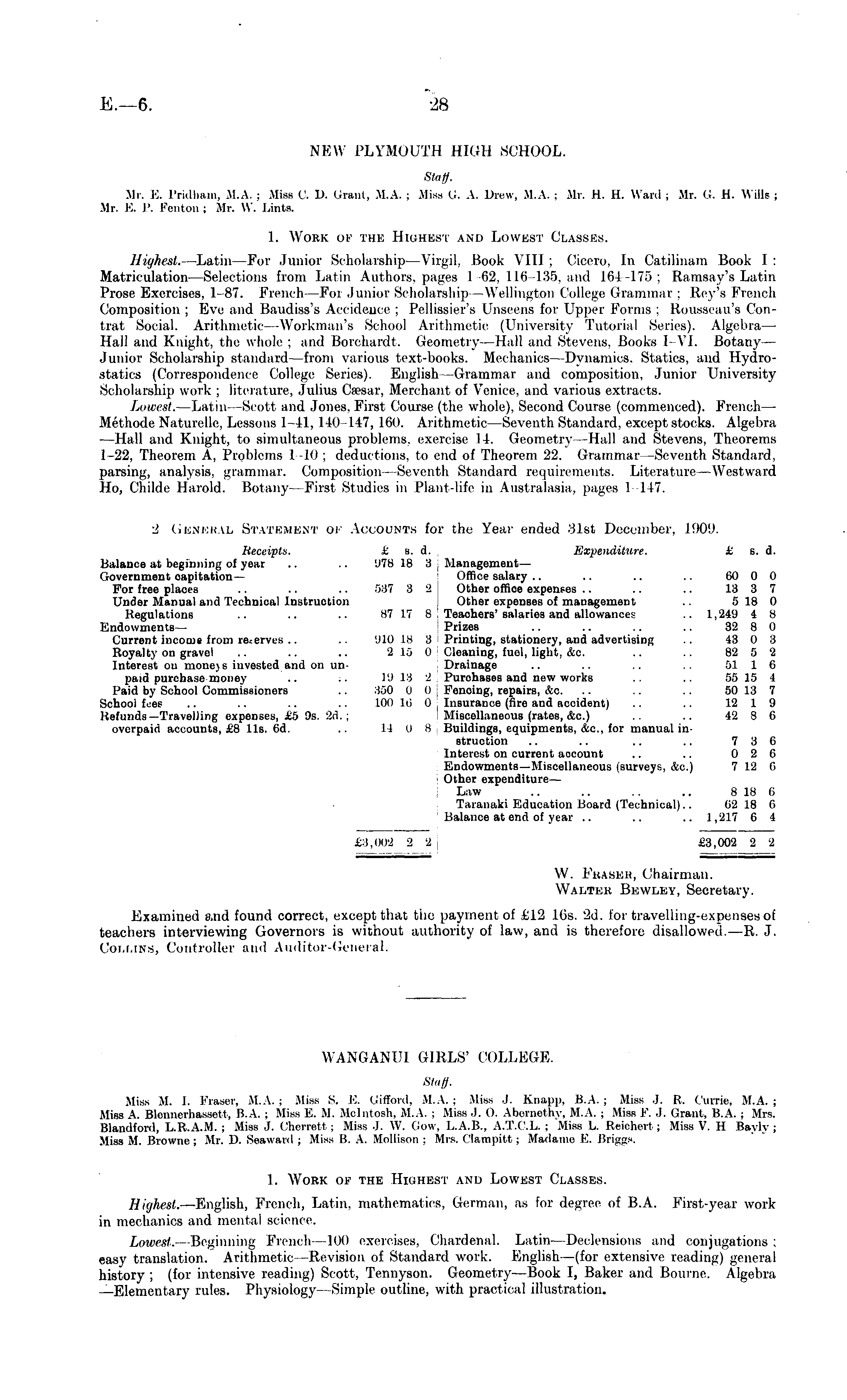 NEW PLYMOUTH HIGH SCHOOL. Staff. Mr. E. Pridham, .M.A. ; Miss C. D. Grant, M.A. ; Miss G. A. Drew, M.A. ; Mr. H. H. Ward ; Mr. G. H. Wills ; .Mr. E. )'. Fenton ; Mr. W. Lints. 1. Work of the Highest and Lowest Classes. Highest. —Latin— For Junior Scholarship —Virgil, Book VIII ; Cicero, In Catilinam Book I : Matriculation — Selections from Lntin Authors, pages 1 62, 116-135. and 161-175; Ramsay's Latin Prose Exorcises, 1-87. French—For Junior Scholarship—Wellington College Grammar ; Rey'a French Composition ; Eve and Baudiss's Accidence : Pellissier's Unseens for Upper Forms ; Rousseau's Contrat Social. Arithmetic Workman's School Arithmetic (University Tutorial Scries). Algebra Hall and Knight, the whole ; and Borchardt. Geometry— Hall and Stevens, Books I VI. Botany — Junior Scholarship standard from various text-books. Mechanics —Dynamics. Statics, and Hydrostatics (Correspondence College Scries). English— Grammar and composition. Junior University Scholarship work ; literature, Julius Cffisar, Merchant of Venice, and various extracts. Lowest. —Latin—Scott and Jones. First Course (the whole), Second Course (commenced). French — Methode Naturelle, Lessons 1-41, 140-147, 160. Arithmetic Seventh Standard, except stocks. Algebra —Hall and Knight, to simultaneous problems, exercise 14. Geometry Hall and Stevens. Theorems 1-22, Theorem A, Problems I -10 ; deductions, to end of Theorem 22. Grammar—Seventh Standard, parsing, analysis, grammar. Composition Seventh Standard requirements. Literature—Westward Ho, Childe Harold. Botany —First Studies in Plant-life in Australasia, pages 11+7. •J General Statement ok Accounts for the Year ended 31st December, 1909. Receipts. £ 8. d. Expendittire. £ s. d. Balance at beginning of year .. .. 978 18 3 Management— Government capitation— Office salary .. .. .. .. 60 0 0 For free places .. .. .. 537 3 2 Other office expenses .. .. .. 13 3 7 Under Manual and Technical Instruction Other expenses of management .. 5 18 0 Regulations .. .. .. 87 IT 8 Teachers'salaries and allowances .. 1,249 4 8 Endowments — Prizes .. .. .. .. 32 8 0 Current income from reserves .. .. 'J10 18 3 Printing, stationery, and advertising .. 43 0 3 Royalty on gravel .. .. .. 2 15 0 Cleaning, fuel, light, &c. .. .. 82 5 2 Interest on monejs invested and on un- Drainage .. .. .. .. 51 1 6 paid purchase money .. ;. l'J 18 i Purohases and new works .. .. 55 15 4 Paid by School Commissioners .. 350 0 0 Fencing, repairs, &c. .. .. .. 50 13 7 School fi;ef .. .. .. .. 100 lii 0 , Insurance (fire and accident) .. .. 12 1 9 Refunds—Travelling expenses, £5 9s. 3d.; Miscellaneous (rates, &c.) .. .. 42 8 6 overpaid accounts, £8 11s. 6d. .. 14 0 8 Buildings, equipments, &c, for manual instruction .. .. .. .. 7 3 6 Interest on current account .. .. 0 2 6 Endowments—Miscellaneous (surveys, &c.) 7 12 G Other expenditure— Law .. .. .. .. 8 18 6 Taranaki Education Board (Technical).. 62 18 6 Balance at end of year .. .. .. 1,217 6 4 £3,002 2 2 £3,002 2 2 W. Fbasbb, Chairman. Walter Bewley, Secretary. Examined and found correct, except that the payment of £12 lGs. 2d. for travelling-expenses of teachers interviewing Governors is without authority of law, and is therefore disallowed.—R. J. Cou. ins, Controller and Auditor-General.